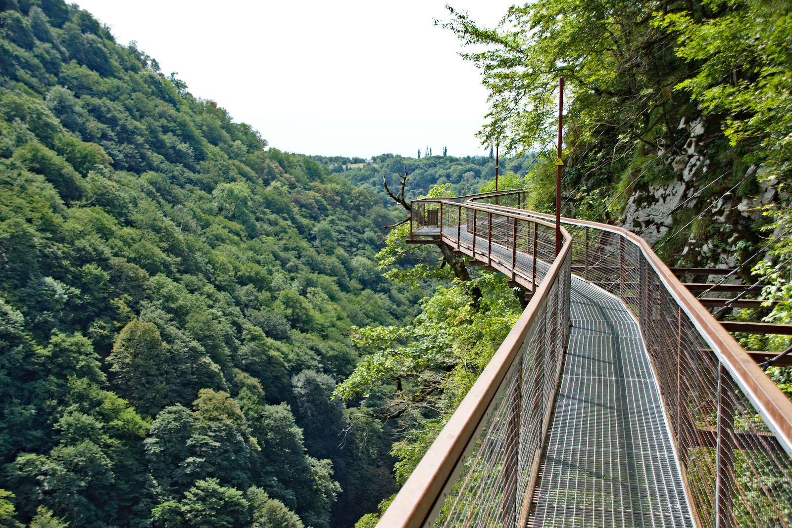 Eine Dreiviertelstunde später kommen wir an der Schleuse zum Hochpfad an - hier werden die Eintrittskarten gescannt, ab jetzt warten wohl etwa 1000 Stahlstufen entlang der schmalen Stahlkonstuktion, die teilweise im Fels verankert ist. Das mit den 1000 Stufen sollte dem Urteil der Waden nach sehr gut hinhauen. Meine Bewegungen werden langsamer, ähnlich wie auf dem Riesenrad in Kutaissi. Ich weiß allerdings nicht, ob es an den vielen Stufen oder an der Tiefe liegt, über die man zu schweben scheint.