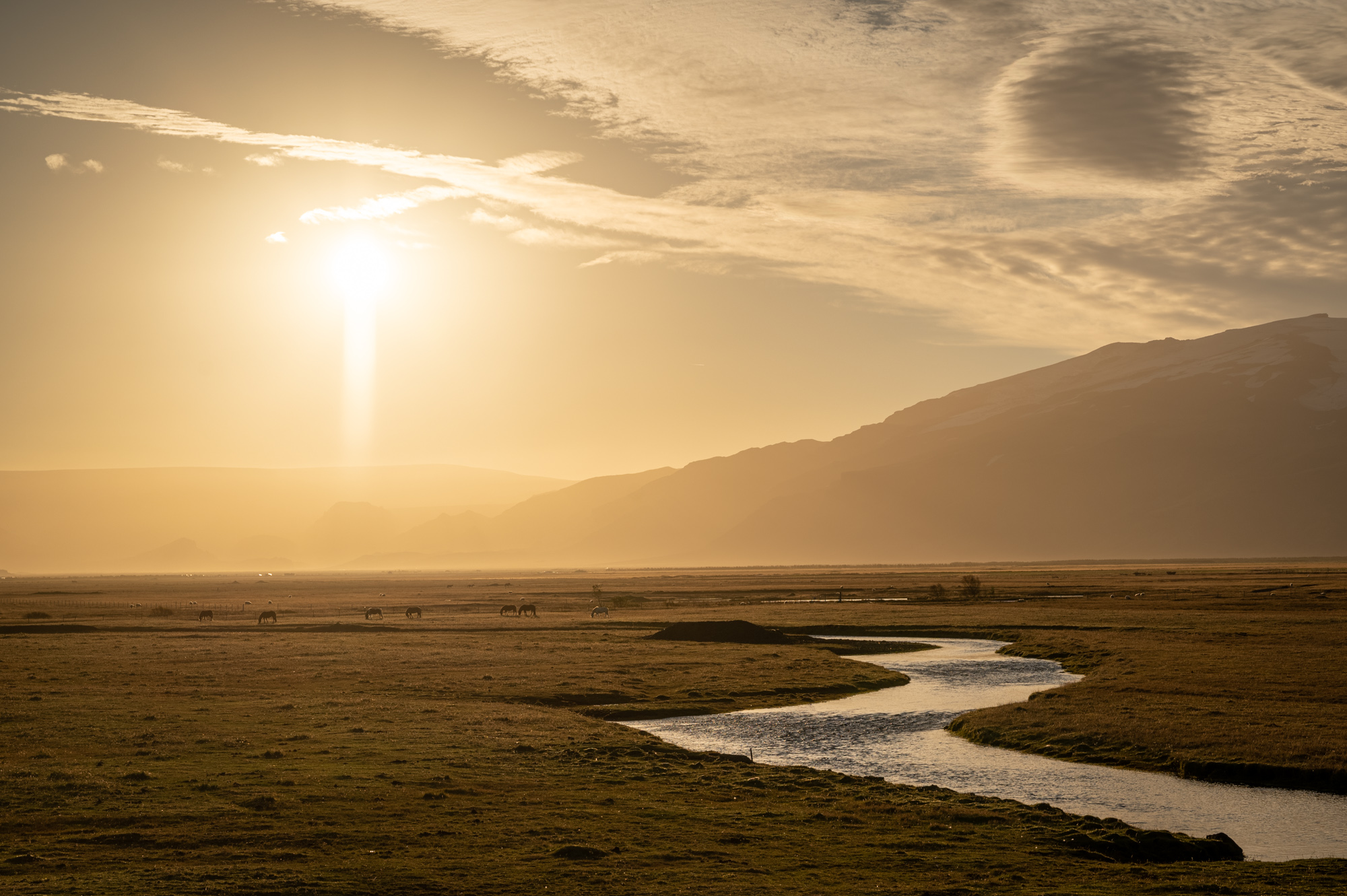 Die südliche Ebene der Insel lässt immer wieder erahnen, wie mächtig die Hochebene sein muss. Die Ausläufer des Gebirges kündigen sich durch das milchig-gelbe Tageslicht als große, kantige "Fremdkörper" an. Zwischendrin immer mal wieder ein imposanter Gletscher. Der Seljalandsfoss, einer der bekanntesten Wasserfälle Islands, ist schon aus der Ferne zu sehen. Ich fahre erst einmal bewusst daran vorbei, möchte heute Abend wiederkommen. Während der hochstehenden Sonne checke ich erstmal in der neuen Unterkunft ein. Sie befindet sich kurz hinter dem Eyjafjallajökull in direkter Nachbarschaft zum Drangurinn, einem sagenumwobenen Tuffstein, der einsam im geschützten Talkassel steht. Über die Zeit haben sich kleine Häuschen direkt am Sockel des Steins und dessen Höhlensysteme angedockt, deren Ruinen noch heute zu besichtigen sind. Sagenumwobene Geschichte und sagenhafte Landschaft gehen hier Hand in Hand.