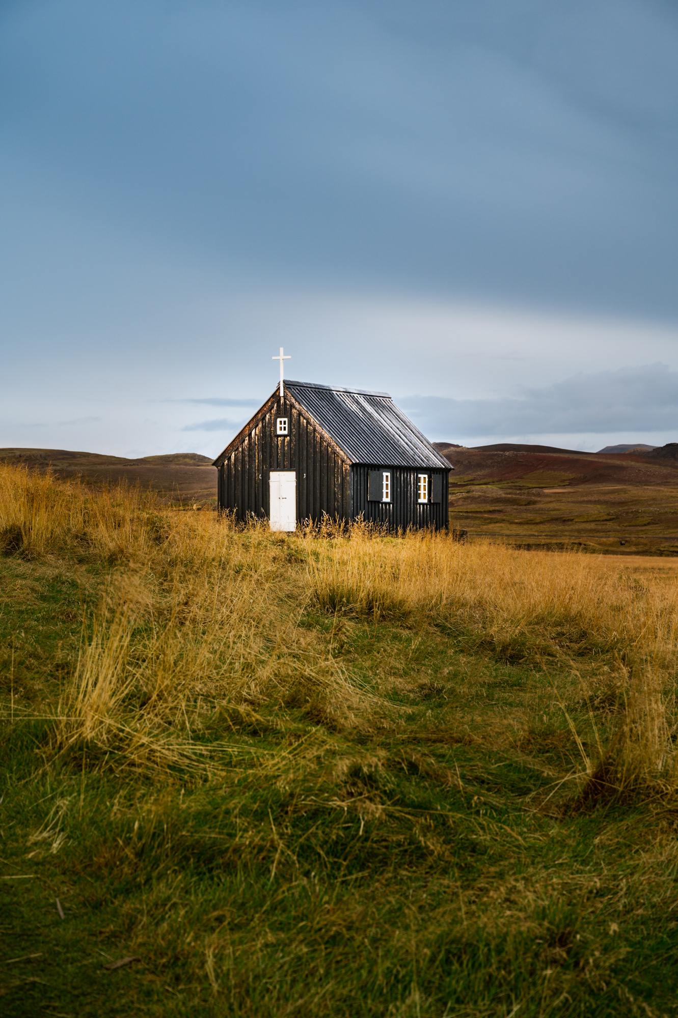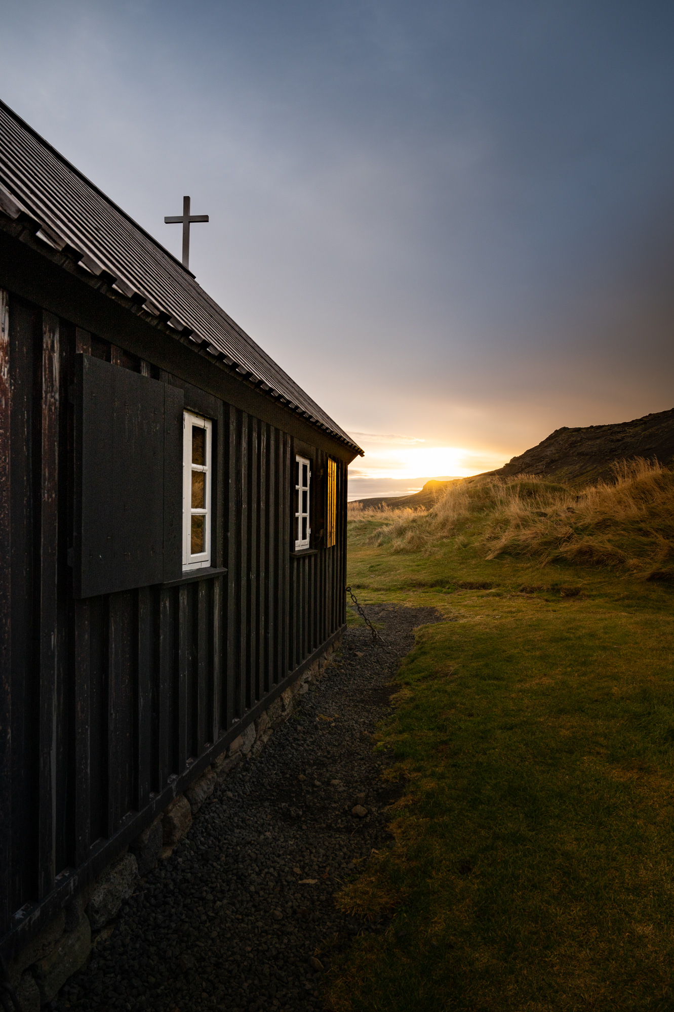 Freundlich nicken wir uns zu, als er wieder die Freigabe bekommt. Diesmal zieht mich das nächste Straßenschild in Richtung Krýsuvíkurkirkja wie ein Magnet an. Bei den letzten Begegnungen auch schon, aber da bot sich die Gelegenheit nicht. Eine erstaunlich gut befestigte Straße führt ins Hinterland. Einige hundert Meter weiter ein Parkplatz. Ich fühle mich direkt an den ersten Abend in Strandakirkja zurückversetzt. Krýsuvíkurkirkja erscheint mir wie ein inszenierter Antagonist zu Strandakirkja. Diese Kirche ganz in Schwarz, trägt den Namen der Feuerlandschaft und ist unbekannt; jene fast komplett in Weiß, thematisch der Küste zugeordnet und ein Touristenmagnet. Feuer ist übrigens das Stichwort: Krýsuvíkurkirkja steht hier erst seit zwei Jahren. Sie wurde über zehn Jahre von Schreinerlehrlingen mühsam und originalgetreu rekonstruiert und anschließend per LKW am Stück hertransportiert. 2010 brannte sie nämlich bis auf einen kleinen Haufen Asche ab, hatte zeit ihrer seit 1857 andauernden Geschichte noch ein rotes Dach. Tatsächlich ganz in Ruhe verbummele ich eine halbe Stunde und ziehe erst weiter, als eine kleine Reisegruppe den Ort überrollt wie eine Herde Islandpferde. Ehe ich mein Zeug im Auto verstaut habe, springt nebenan auch schon wieder der Motor ihres Kleinbusses an.