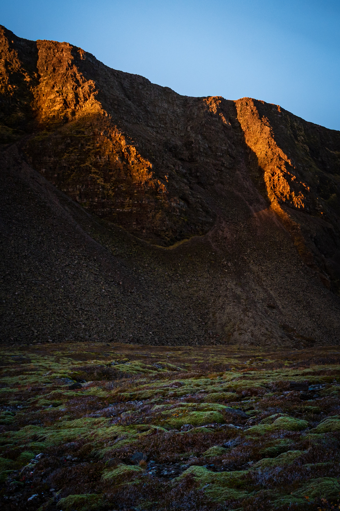 Im flachen Winkel strahlt die goldgelbe Sonne über den Südküstenstreifen hinweg. Der lange Schatten des Dacias fährt mir unaufhaltsam voraus, seit ich auf die 427 ostwärts in Richtung Þorlákshöfn gebogen bin. Die GoPro habe ich natürlich immer noch nicht auf die Motorhaube gepömpelt, möchte keine Zeit verlieren. Aber was heißt hier schon "Zeit verlieren", eigentlich suche ich nur nach einem geeigneten Ort für den nächsten Halt, möchte dafür ein ganzes Stück vorwärts kommen. Der lange Schatten des Dacias ist mittlerweile von den langen Schatten der hinter mir liegenden Berge verschluckt worden. Im Rückspiegel sehe ich, wie sich die blaugraue Wolkendecke breitflächig in ein feuriges Orange verwandelt. Schrägrechts vor mir strahlt der Küstenverlauf am Horizont. Ganz da hinten ist Strandakirkja als weiße Landmarke zu erkennen. Überall lösen sich kleine Regenschauer aus der Wolkendecke. Davor erscheint sanft ein Regenbogen, links von mir spielt der markante Bergrücken sein Licht- und Schattenspiel. Vielleicht ist das ja auch der Ort, nach dem ich suche. Ich lenke den Dacia auf den abschüssigen Seitenstreifen. Auf dem Geröll kommt er schnell zum Stehen. Zur Sicherheit werfe ich die Warnblinker an. Mit Verlassen des Autos versinke ich in der gewaltigen isländischen Traumlandschaft und stapfe vorsichtig über die moosfreien Stellen des Lavafeldes. Das feurige Orange der von unten beleuchteten Wolkendecke löst sich langsam in ein sanftes, fleckiges Rosa auf.