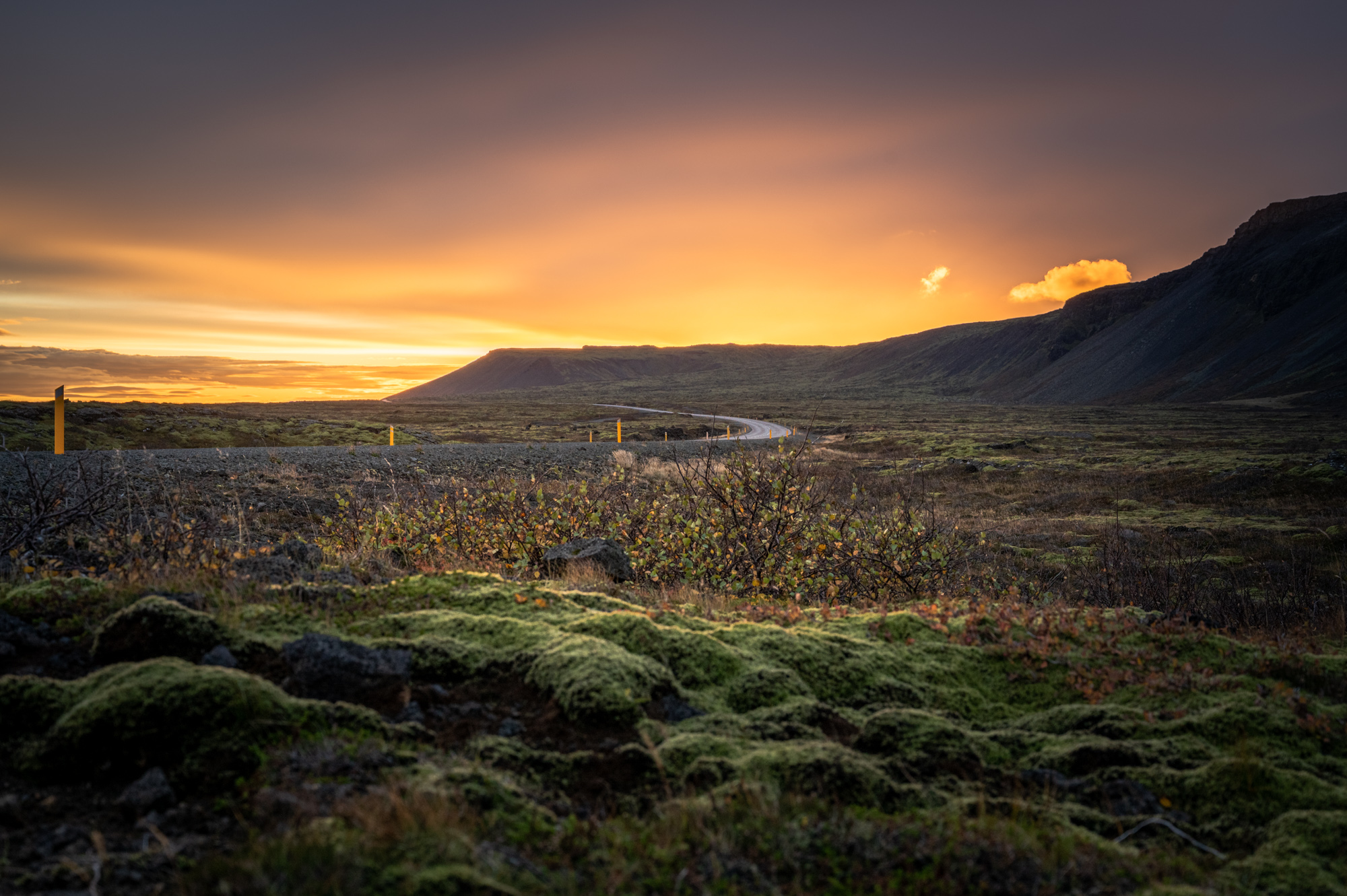 Jetzt, wo die nette Gesellschaft mit Check-in und Abendplanung beschäftigt ist, trete auch ich meine Rückfahrt an. Eigentlich sind es nur 50 Kilometer bis zu meinem Hotel in Selfoss. Aber der Entschluss steht schon lange fest: Seltún und die Umgebung um Krýsuvík müssen nochmal als Zwischenstopp herhalten. Dadurch verdoppelt sich die Strecke. Aber zu beeindruckend war die Landschaft, zu verlockend, sich dort noch einmal in Ruhe umzuschauen, zu groß die Neugier zu erfahren, was genau ich übersehen habe. Die Sonne nähert sich ganz langsam, aber immer noch beständig, dem Horizont. Sich in Ruhe umzuschauen, liegt also im Auge des Betrachters. Dank des entspannteren Verkehrs stadtauswärts komme ich immerhin geschmeidiger vorwärts. Knapp hinter dem Aurora-Basecamp sehe ich, wie die Landschaft quer von einer geraden, recht schmalen Furche gequert wird. Vorhin ist mir dieses markante "Detail" gar nicht aufgefallen. Es ist der Grabenbruch, der Island diagonal durchschneidet. Der Ort, oder eher die Linie, an der sich die eurasische Platte mit etwa 2 Zentimetern pro Jahr von der nordamerikanischen entfernt. Der Grund dafür, dass die Erde sich entlang dieser Linie von ihrer aktivsten Seite zeigt: intensiver Vulkanismus garniert mit zahlreichen Erdbeben. Ich steige die wenigen Meter vom Straßenrand herab in den Graben, blicke über ein moosbedecktes Lavafeld, links und rechts davon die kerzengeraden Bergrücken. Mich beeindruckt's sehr. Es beeindruckt mich deutlich mehr, als mit jedem Bein in einem anderen Land, auf einem anderen Kontinent zu stehen.