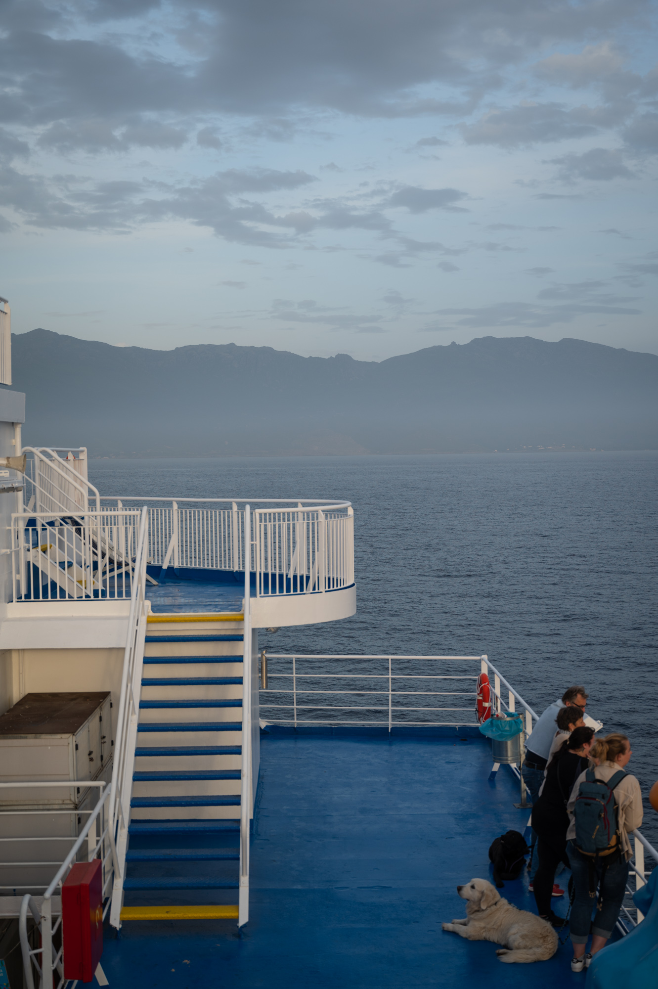 Das Deck 7 ist in der kurzen Zeit an Bord zu unserem Lieblingsort an Deck geworden. Dort liegt man im Windschatten der Fähre, es ist ruhig und man hat einen super Ausblick. Es ist noch ungewohnt für uns, wie warm und angenehm es draußen so früh morgens sein kann. Das dachte sich sicherlich auch das ältere Paar, das es sich schon gestern mit ihrer Decke und Wein gemütlich gemacht hat. Sie sitzen wieder hier. Diesmal ohne Wein. Ich bin der Meinung, sie müssen dort übernachtet haben. Teresa hält dagegen: Das sei bestimmt ein älteres Camperehepaar, das schon dutzende Male auf Korsika gewesen sei. Die hätten sicherlich auch eine Kabine. Bloß wären sie so ausgefuchst, dass sie die ganzen ollen Campertricks draufhaben, wie man es sich am besten gemütlich macht. Klingt auch plausibel.