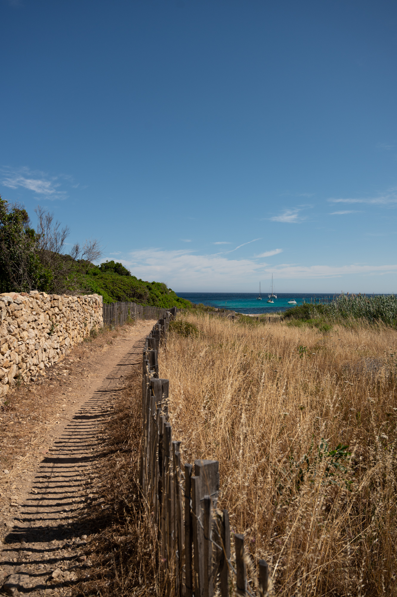 Einige steile Serpentinen lassen uns schon erahnen, dass am Ende der Wanderung nochmal alles von uns gefordert wird. Der Parkplatz liegt hoch über dem Meeresspiegel. Ein beleibter älterer Mann kommt uns mit Fotosausrüstung entgegen. Der muss wohl zum Sonnenaufgang hier gewesen sein. Für uns hat es nicht ganz gereicht. Der erste Abschnitt nach den Serpentinen ist der deutlich grünste. Es geht durch hüft- bis körpergroße Büsche und Getreide. Der Blick auf die malerische Bucht vor uns treibt uns an. Dort liegen ein paar Boote vor Anker. Das Wasser ist cyanblau, der Weg dahin sandig und steinig. Ein Zaun grenzt das letzte Stück Weg von der Landschaft ab.