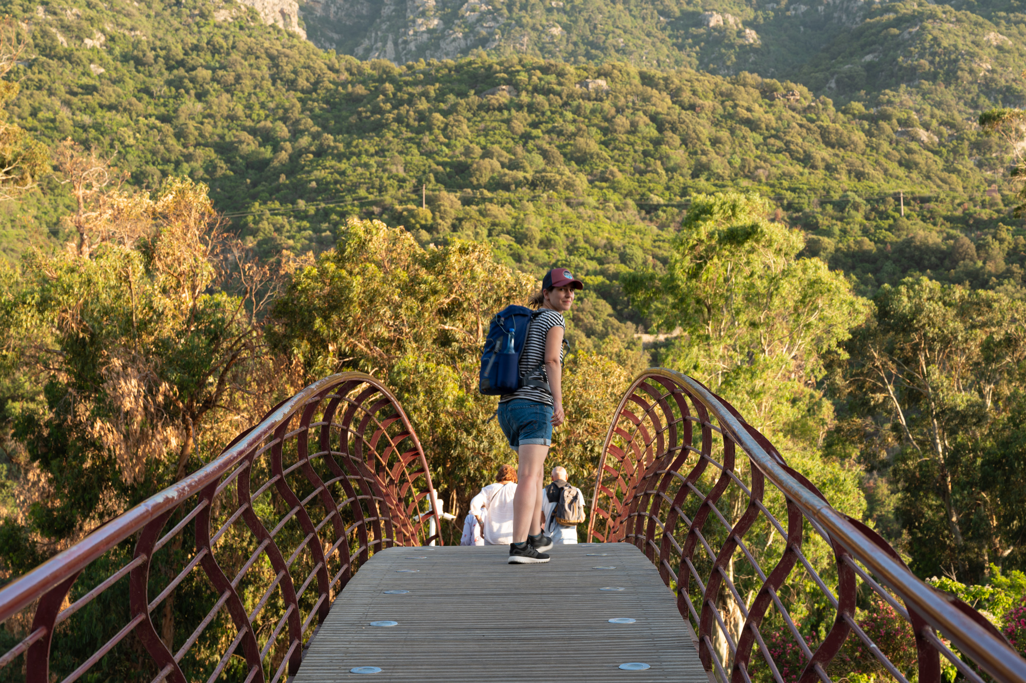 Im Hafen decken wir uns mit dem Nötigsten ein: Wasser, Bier und einer Flasche kühlen Weißweins für den Sonnenuntergang. Ein Panini auf die Hand und schon überqueren wir die Brücke auf die andere Seite des Ufers. Überall befinden sich Bootstourenanbieter und kleine Bars und Restaurants. Sie folgen ihrem eigenen Chic: charmant-improvisiert. Die Sonne steht recht tief und scheint über der Landzunge hervor. Darauf etwas erhöht ein Genueserturm. Die Wellen peitschen den felsigen Küstenverlauf hoch.