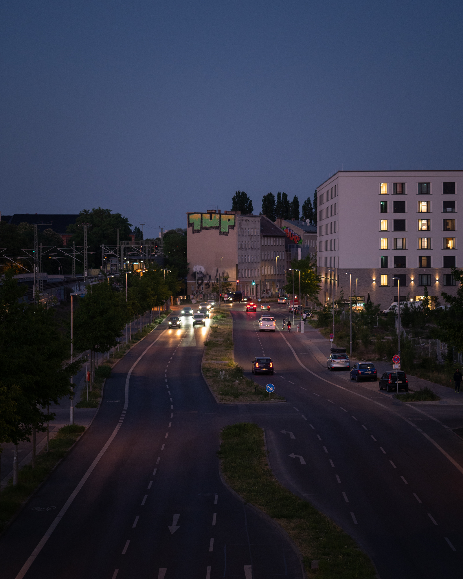 Die Stadt atmet viel ruhiger, wenn die Sonne untergeht und sich das Blau der Dämmerung wie ein großer, transparenter Vorhang über sie legt. Der Vorhang ganz luftig und leicht und irgendwie schwer, wenn man nach der Flachheit der Atmung geht. Flache Atmung, flacher Puls der Großstadt: Der Feierabendverkehr ist vorbei, die Leute sitzen noch nicht in und vor den Bars. Die Ruhe vor dem Sturm.