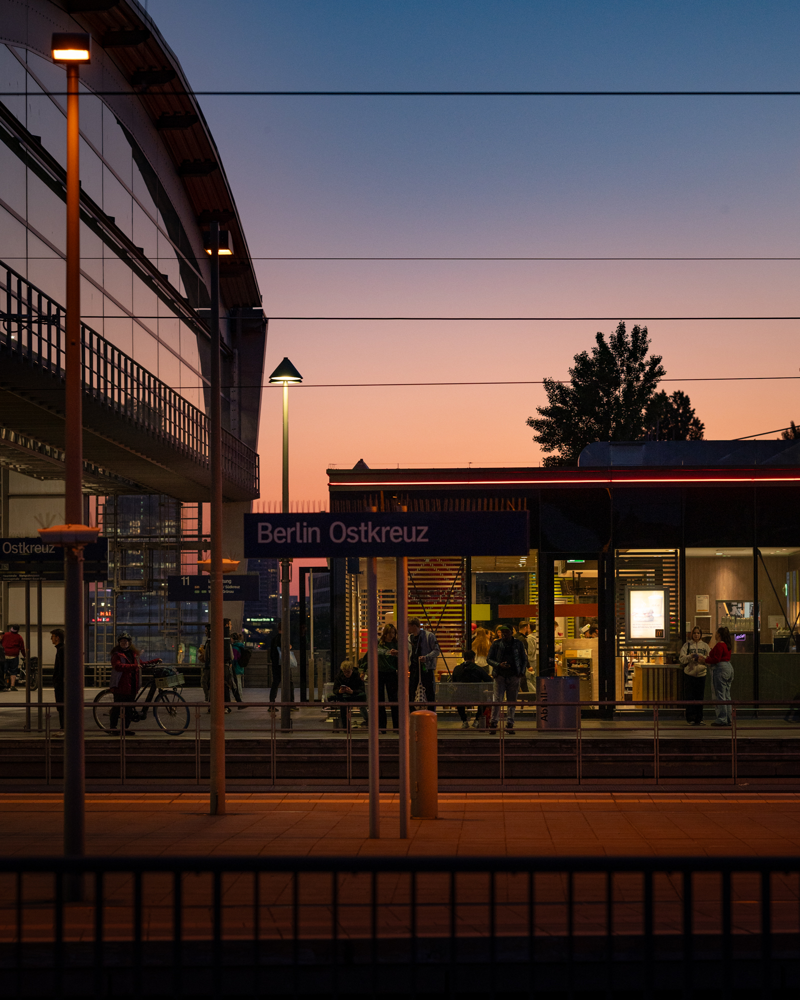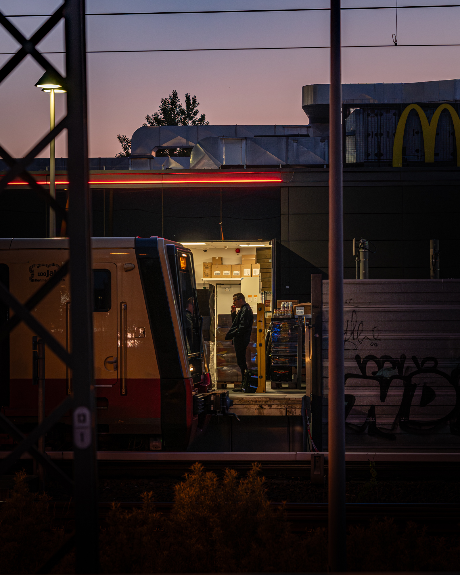 Jetzt, als ich über die Überführung hinterm Ostkreuz entlanggehe, ist der Osten schon blau, der Westen noch aprikot. Die Grenze des Vorhangs ist gerade über mir. Das Ostkreuz ist eigentlich immer ein wuseliger Ort - viel Bewegung. Jetzt gerade wird gewartet: Auf das Abendbrot beim Fastfoodrestaurant oder die nächste S-Bahn. Hinten, im Lager des Restaurants ist Zeit für eine Pause, während die Bahn einrollt.