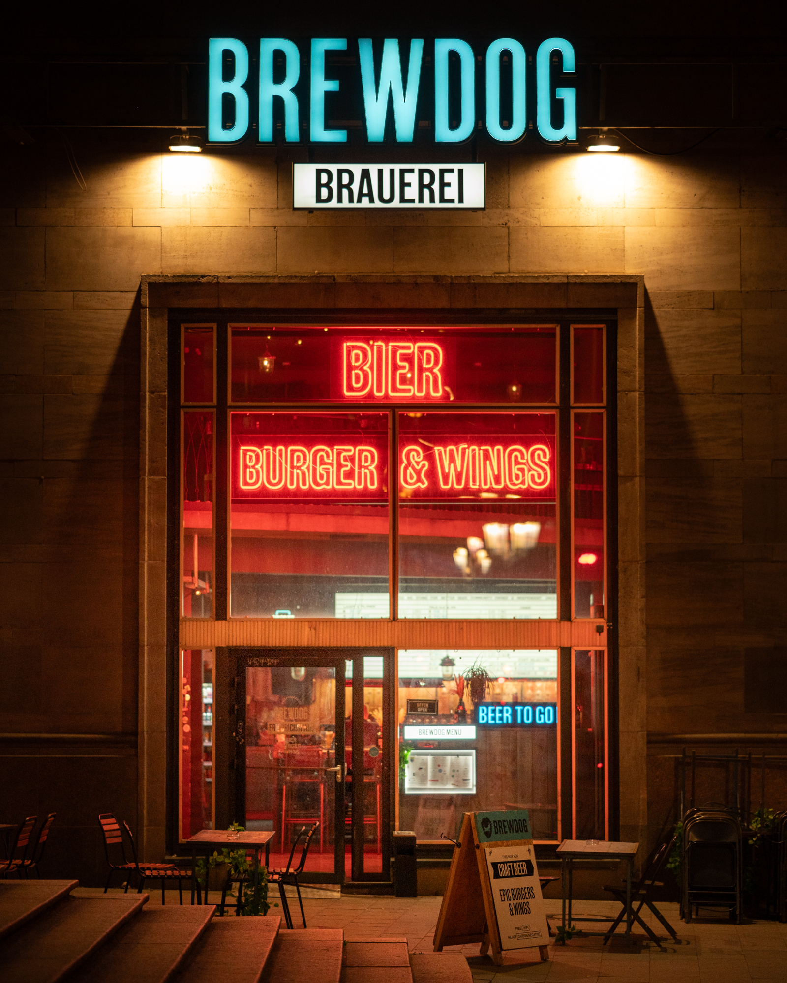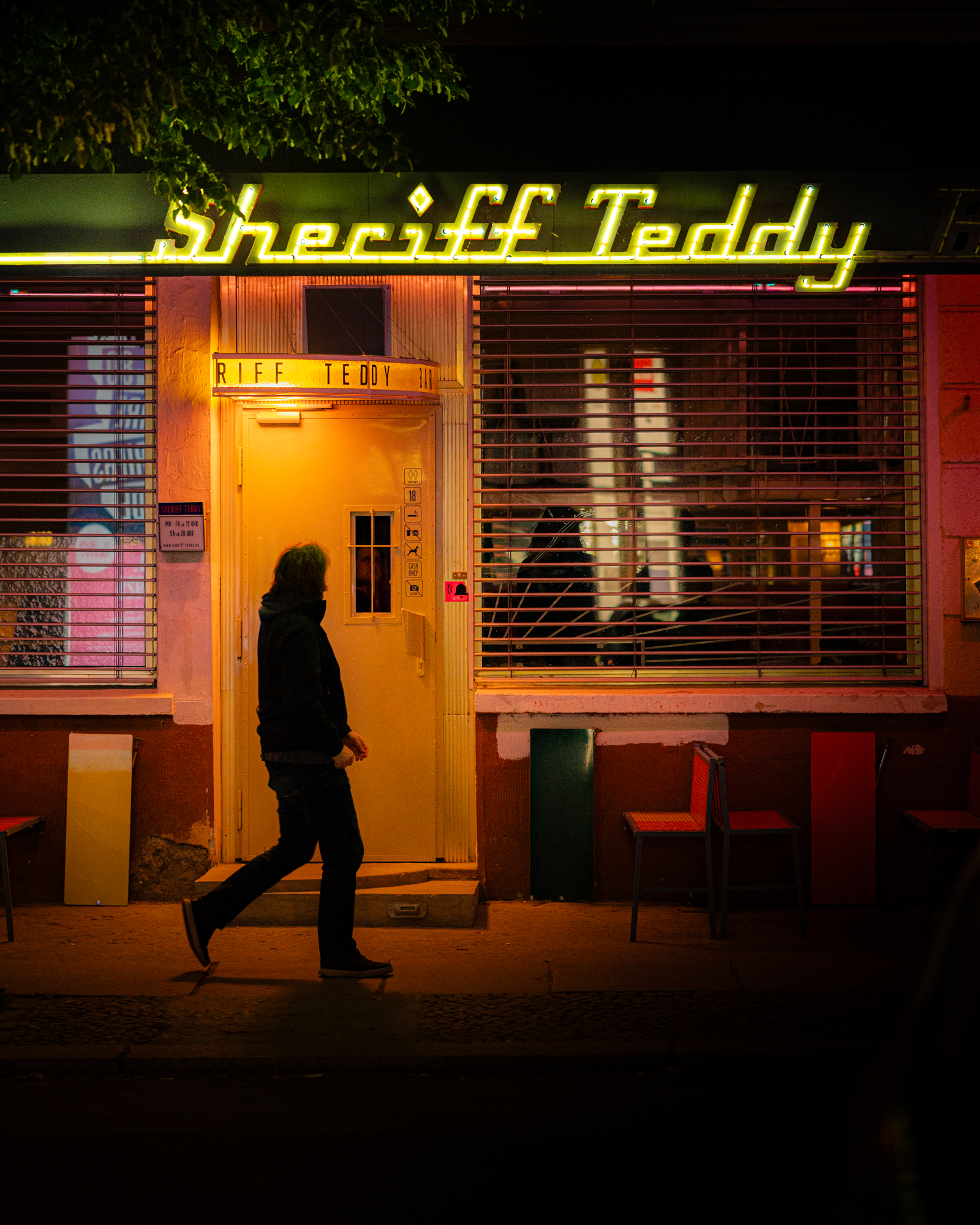 Viele Schritte weiter bin ich schon die halbe Frankfurter Allee entlangspaziert, da ist es schon dunkel. Die grelle Lichtreklame einer Brauerei lädt ein: zu Burger, Wings und Bier. In stylischen Kontrasten - ganz wie es der Friedrichshain gewohnt ist. Vor und in ihr ist es still. Asiatische Läden, genauso grell aber ruhiger. Eine kleine Kneipe, die in der alten Hausfassade untergeht. Sie ist unscheinbar, obwohl sie zu denselben Mitteln greift wie Brauerei und Asialaden. Einzig die Silhouette, die an ihr vorbeispaziert, als Kontrast.