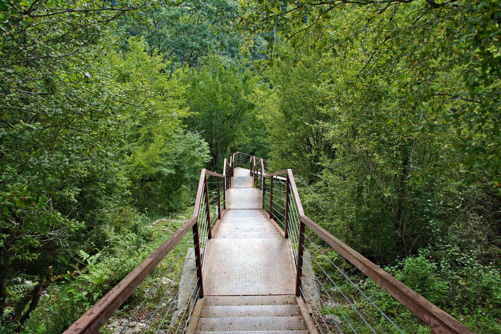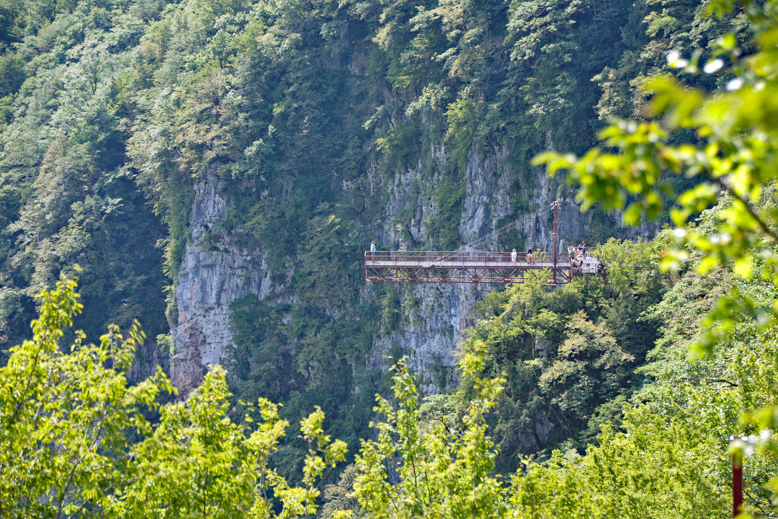Eine Dreiviertelstunde später kommen wir an der Schleuse zum Hochpfad an - hier werden die Eintrittskarten gescannt, ab jetzt warten wohl etwa 1000 Stahlstufen entlang der schmalen Stahlkonstuktion, die teilweise im Fels verankert ist. Das mit den 1000 Stufen sollte dem Urteil der Waden nach sehr gut hinhauen. Meine Bewegungen werden langsamer, ähnlich wie auf dem Riesenrad in Kutaissi. Ich weiß allerdings nicht, ob es an den vielen Stufen oder an der Tiefe liegt, über die man zu schweben scheint.
