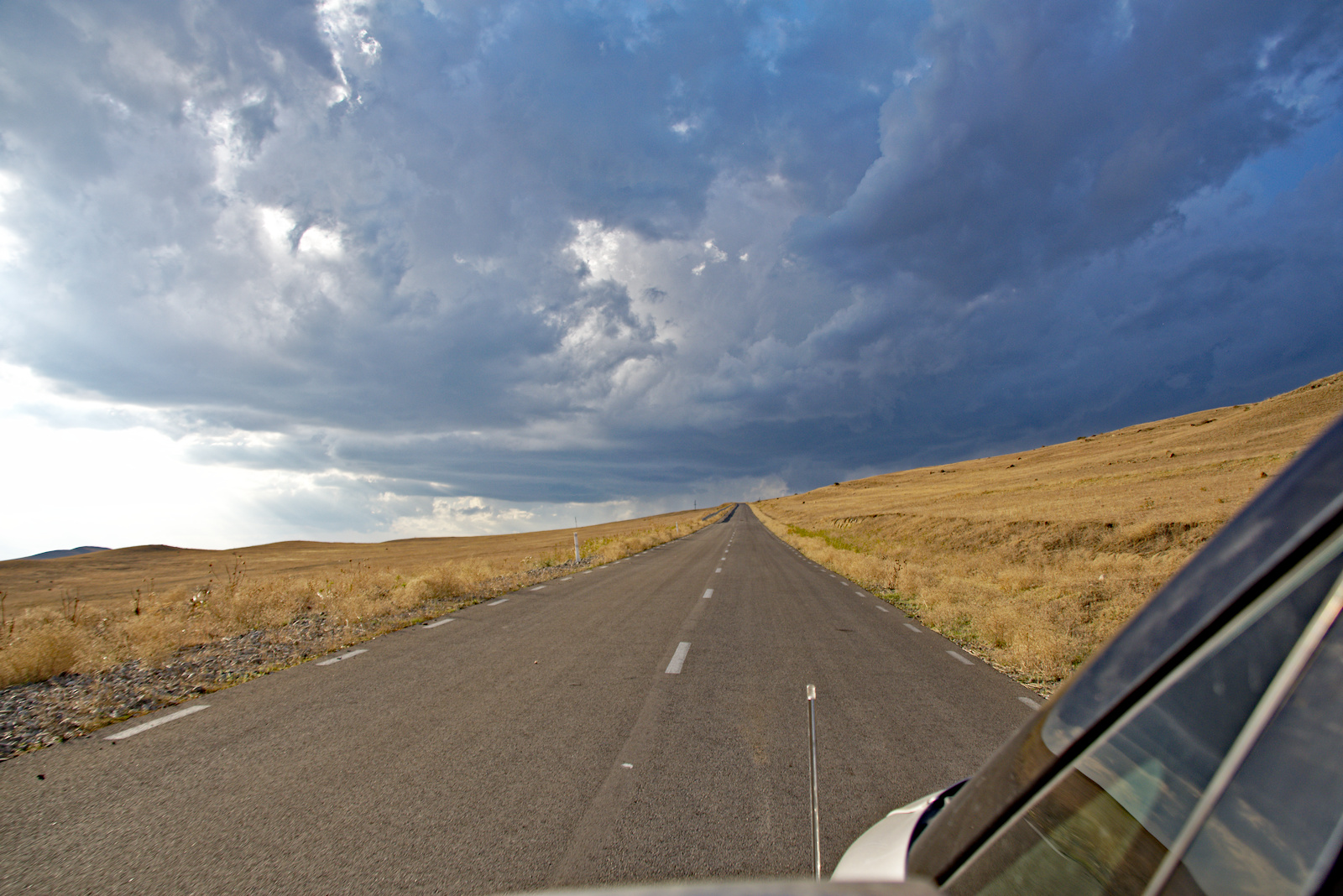 Wir fahren beinahe im Schritttempo. Jetzt ergibt das mit der langen Fahrtzeit wieder Sinn. Die Landschaft erinnert mich an die Steppe Ostarizonas, direkt von den Rockies kommend. Auf unserer rechten Seite ist ein fast ausgetrockneter See. Er wirkt wie ein Salzsee: In der Sonne gleißend hell und ohne dass sich Wasser drin befindet.