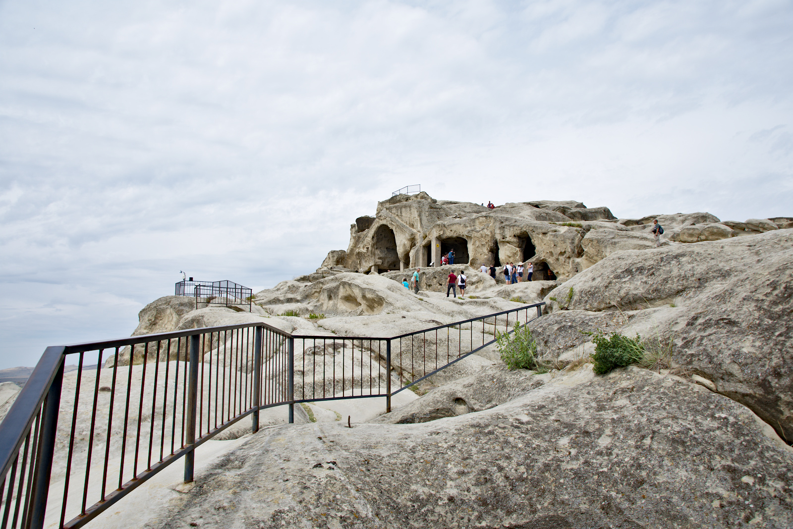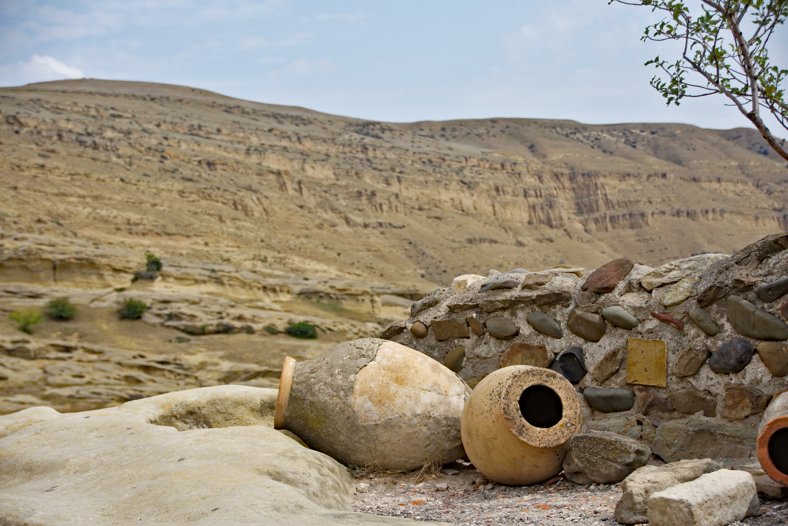 Beim Aufstieg auf den Berg sieht man in den Fels geschlagene Rinnen, die das wenige Regenwasser zu Zisternen führen. Wir sind von schwer bewaffneten, aber gut gelaunten georgischen Grenzsoldaten umgeben. Unser Ausflug endet an einer kleinen Höhle, aus der angenehme Kühle tritt. Unter normalen Umständen wäre ein deutlich größerer Rundgang möglich. Auf die andere Seite des Bergkamms zu den Höhlen von Udabno und zur Auferstehungskapelle. Aktuell bestehen wohl Spannungen zwischen Georgien und Aserbaidschan. Uns wurde gesagt, dass aserbaidschanische Grenztruppen den Zugang zu den Sehenswürdigkeiten blockieren würden.