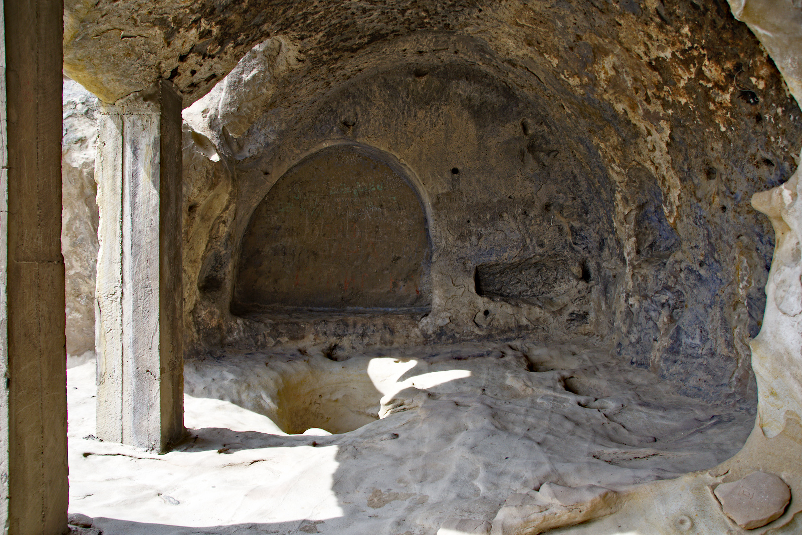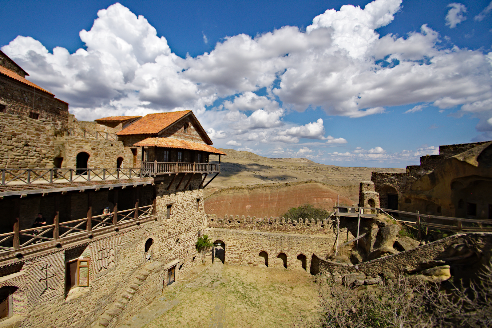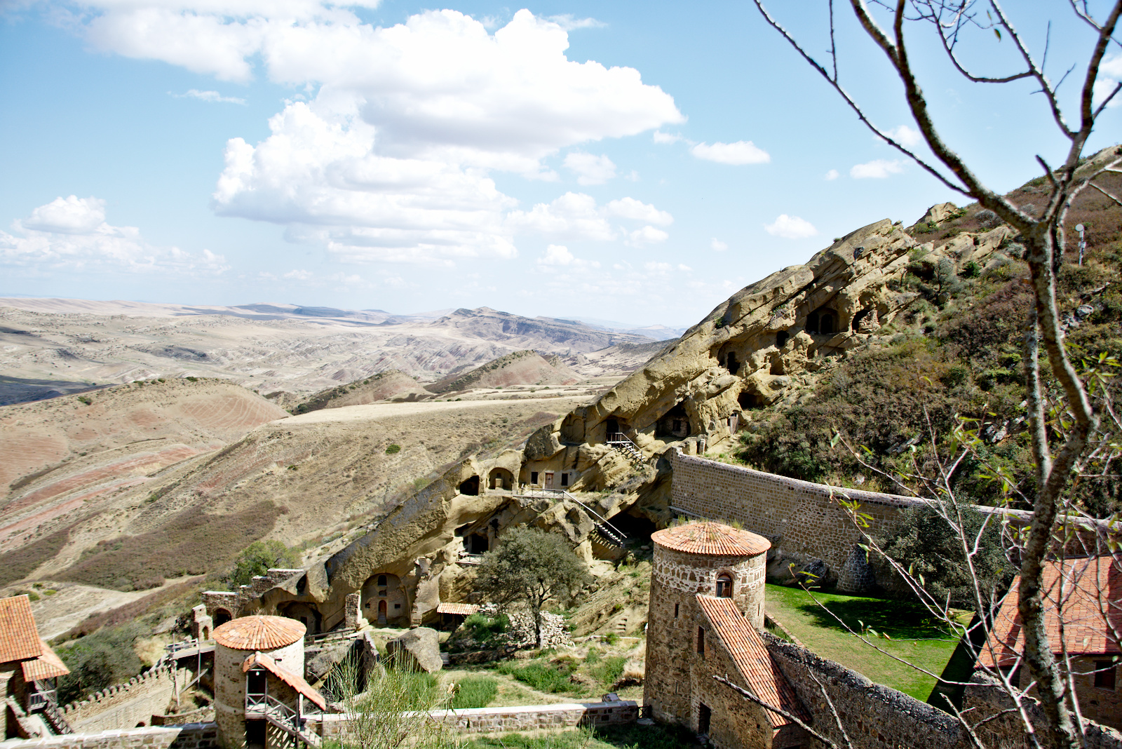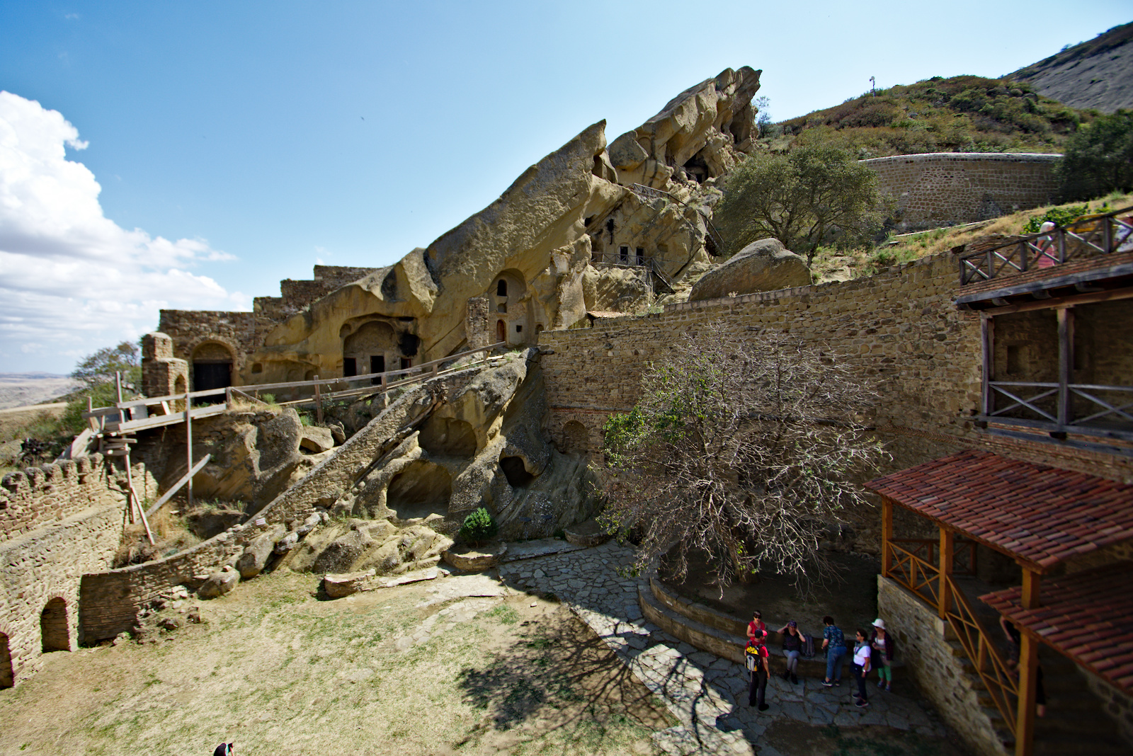 Es kommt uns gelegen, alles in Ruhe auf uns wirken lassen zu können. Wir betreten die Lawra, das Gebetshaus der Einsiedlermönche. Es ist ähnlich eines Forts rechteckig von einer Mauer umgeben. Von der oberen Etage hat man einen wunderbaren Blick auf die Landschaft im Hintergrund und auf die Mönchszellen. Sie sind in den schräg abfallenden Fels geschlagen und wirken filigraner, fast schon weniger erodiert als die Felsstadt Uplistsikhe. Hier regnet es auch deutlich weniger.