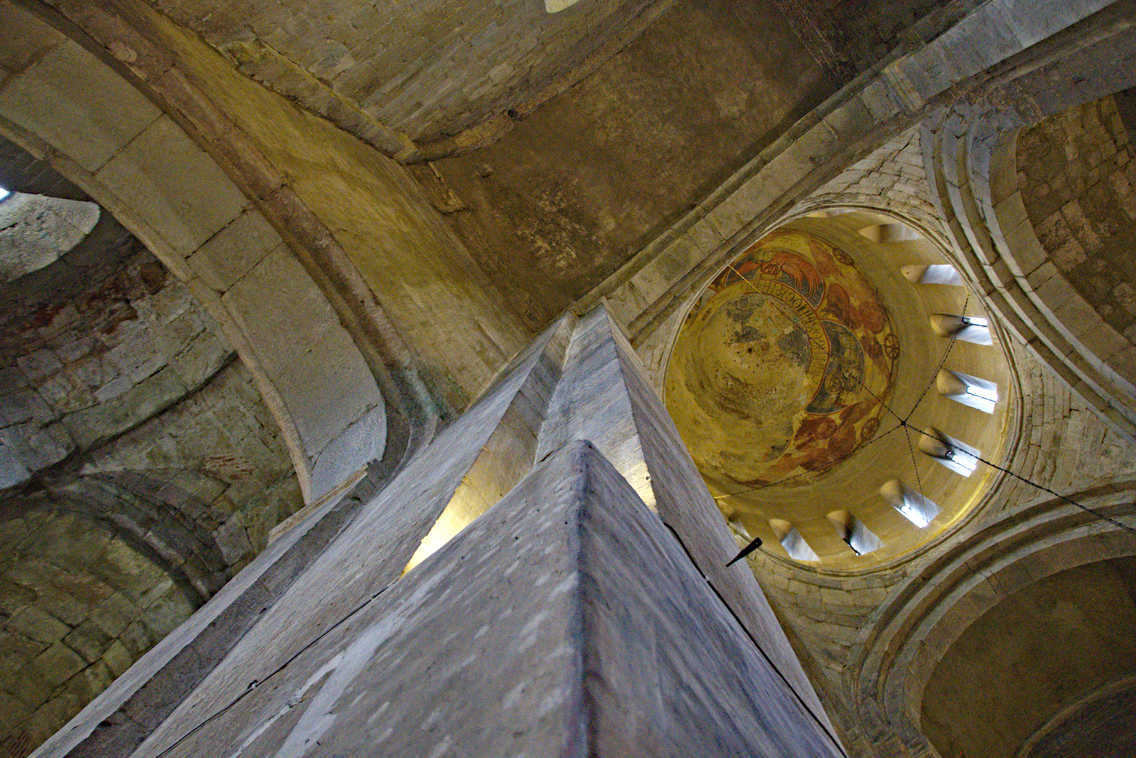 Wir werfen einen Blick hinein, ergötzen uns respektvoll der Ikonen und dem Lichtspiel der Kerzen in dem Dämmerlicht des alten Gemäuers. Wir drehen noch ein paar Runden in der Kathedrale und schauen uns auf dem Außengelände um. Hier packt auch der Geistliche bei Bauarbeiten an. Ora et labora. Das war's im Wesentlichen für diesen Ort. Beeindruckt von Uplistsikhe und etwas enttäuscht von Mtskheta ziehen wir ab, wir Banausen.