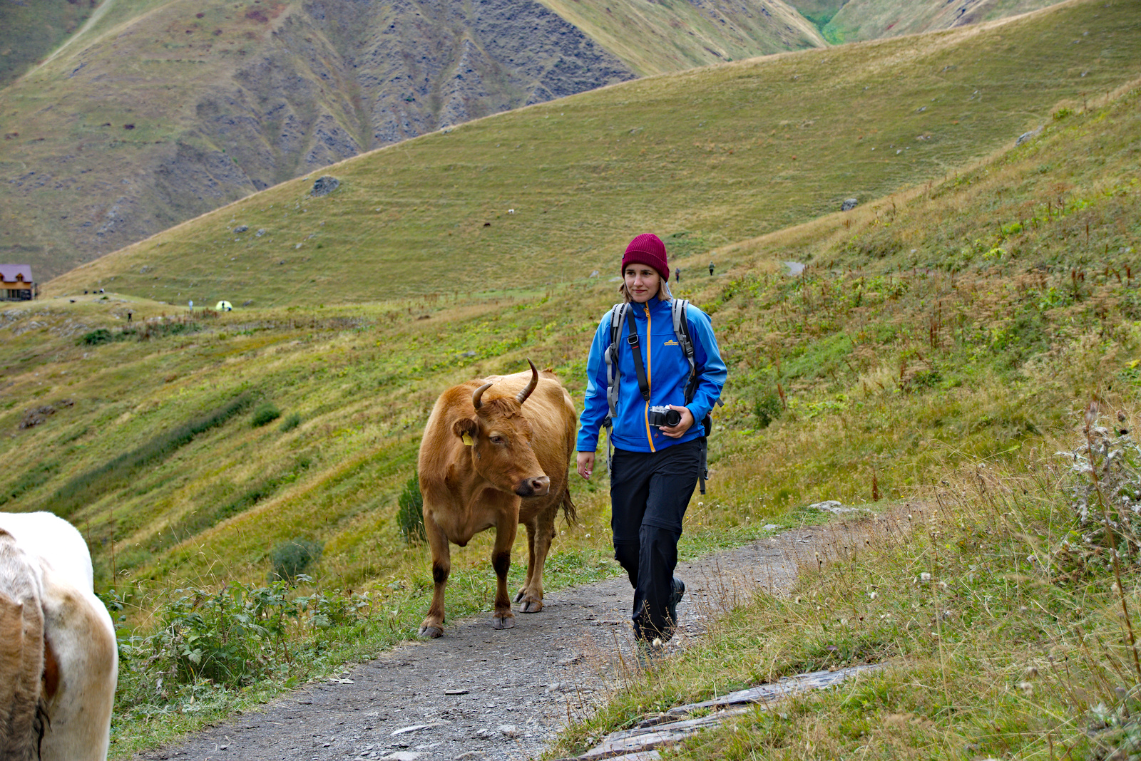 Unsere digitale Wanderkarte verspricht eine "Anbetungsstätte" am Ende des Pfades. Wir rechnen mit einer kleinen Kapelle oder einer Ikone. Das soll unser Umkehrpunkt sein, circa vier Kilometer weiter geradeaus. Wir treffen auf entspannt grasende Kühe. Es sind auch einige Kälber und Bullen dabei. Keins dieser genügsamen und behäbigen Tiere lässt sich durch unsere Anwesenheit beeindrucken. Auf dem Weg zur Anbetungsstätte erwartet uns ein Campingplatz, den wir in der Ferne auch schon sehen. Ein Mann spült das Geschirr im Fluss. Dahinter dann ein Schild in russisch, georgisch und englisch: "Grenzgebiet. Betreten nur mit Reisepass und Sondergenehmigung". Einhundert Meter weiter ist ein georgischer Militärposten. Zehn Kilometer weiter ist die Grenze zu Russland. Ahnungslos, dass es sich hier um militärisches Gebiet handelt, verlagern wir unseren Umkehrpunkt einfach hier her. Schon allein der Landschaft und der Ruhe wegen hat sich der Weg hierher mehr als gelohnt.