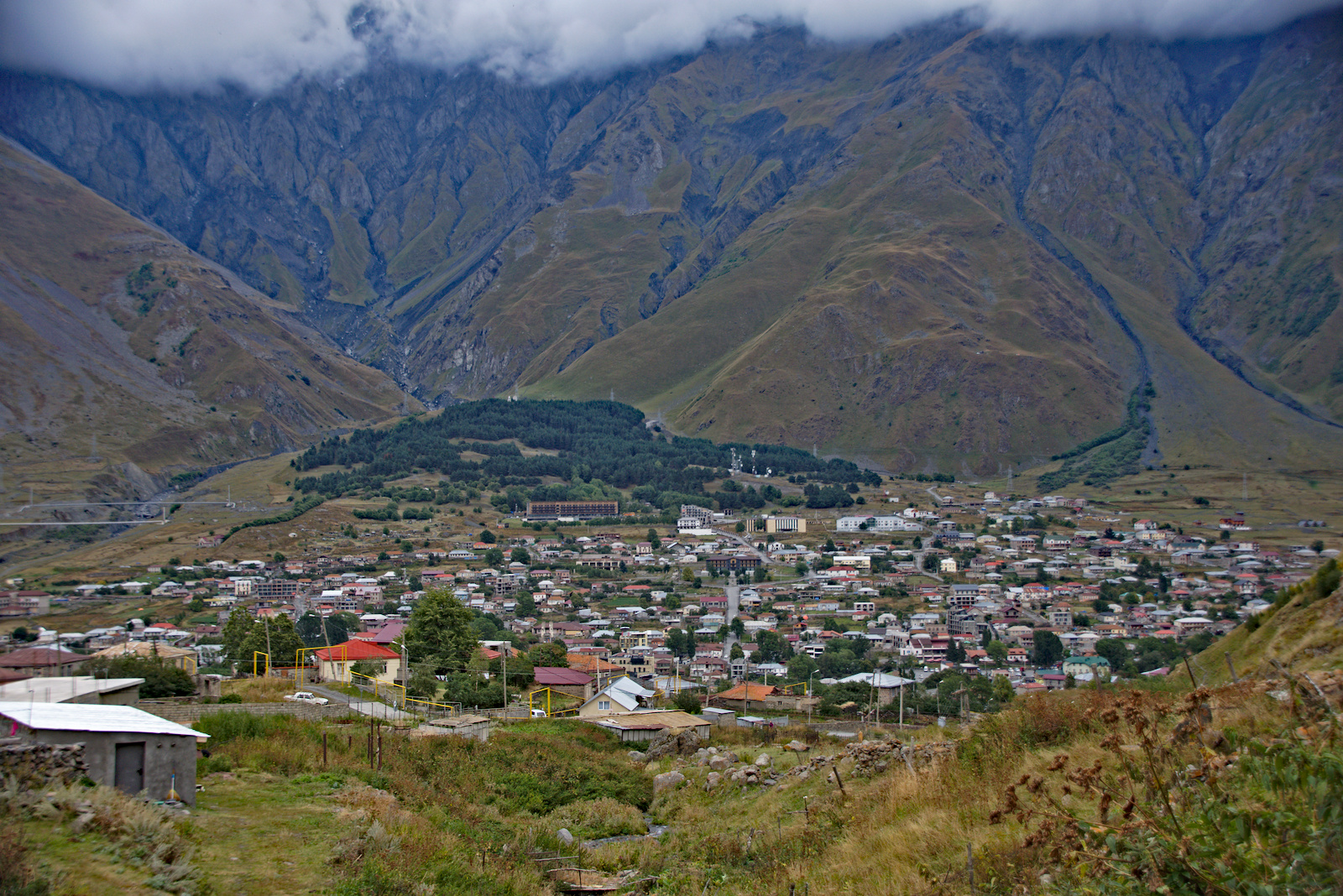 Zunächst geht es durch's Örtchen Gergeti, das knapp oberhalb der Ortschaft Kazbegi liegt. Uns wird warm. Ich ziehe meinen Pulli aus. Es ist ganz schön steil. Nur noch im T-Shirt scheint's erträglich zu sein. Ein Glück, dass es nicht regnet. Von hier hat kann man Kazbegi von oben sehen.