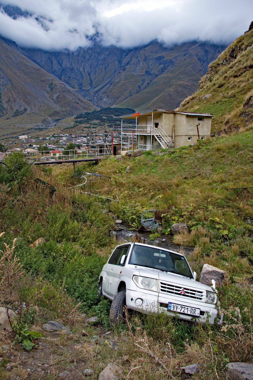 Doch bevor diese Etappe zuende geht, planen wir einen Ausflug zur Gergeti-Kirche - dem Wahrzeichen der Region, das wir unbedingt noch aus nächster Nähe bewundern wollen. Von hier unten wirkt die Entfernung zur Kirche ganz schön groß. Daher ist der Plan, den kurzen und steilen Weg aufwärts zu gehen. Wenn dann oben die Kräfte aufgezehrt sind, lassen wir uns einfach den flacheren Weg abwärts treiben. Dennoch fällt uns schwer, einschätzen zu können, ob wir damit besser mit unserer Energie und der Zeit haushalten als anders herum.
