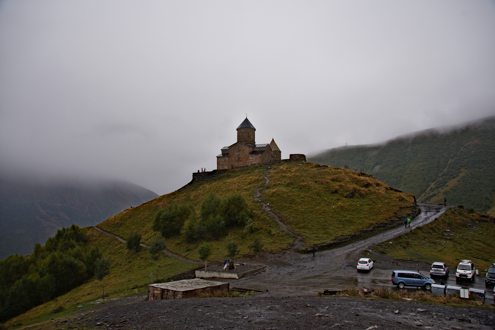 Dann kommen die Mädels von gestern vorbei - wir quatschen noch ein wenig. Sie sind auch in den Regen gekommen. Wir werfen einen kurzen Blick in die Kirche rein und entscheiden uns - ein wenig überdrüssig des nasskalten Wetters - den Rückweg anzutreten. Taxi kommt für uns nicht in Frage. Auf dem etwas längeren Rückweg soll uns flacheres Gefälle erwarten. Denken wir. Das erste Stück geht einen Hang herab durch Matsch. Einige Male landen wir auf unseren Hintern. Sobald wir aber auch das hinter uns gebracht haben, machen wir drei Kreuze und laufen die Serpentinenstraße bis ins Örtchen Gergeti runter.