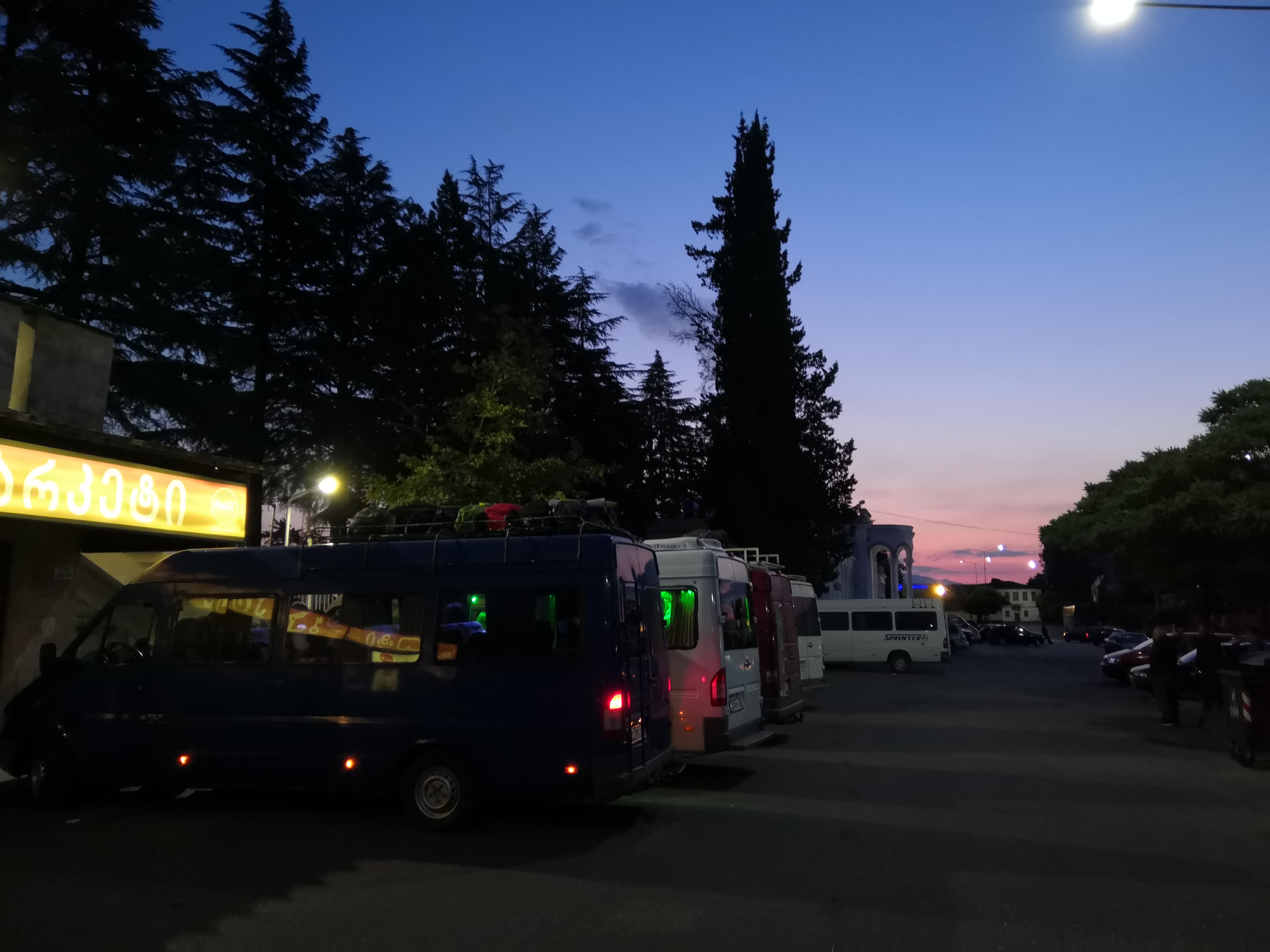 Die Sonne geht auf, es dämmert zumindest. Wir steigen mit sehr vielen Leuten aus. Wahrscheinlich sind wir bei weitem in der Minderheit, was unseren Aufenthalt in Zugdidi angeht. Wir suchen uns einen bequemen Platz am Bahnhofskiosk, bestellen einen Kaffee und schauen dem Gewusel um die Marschrutki zu. Mehrfach wird uns abgeboten, uns mitzunehmen: "Mestia?", jedes mal lehnen wir ab. Wir müssen noch knapp anderthalb Stunden verbummeln bis wir bei unserer Gastgeberin aufkreuzen wollen. Sie hat zwar 24/7 Check-In angegeben, ganz so unangenehm wollen wir es ihr aber auch nicht machen.