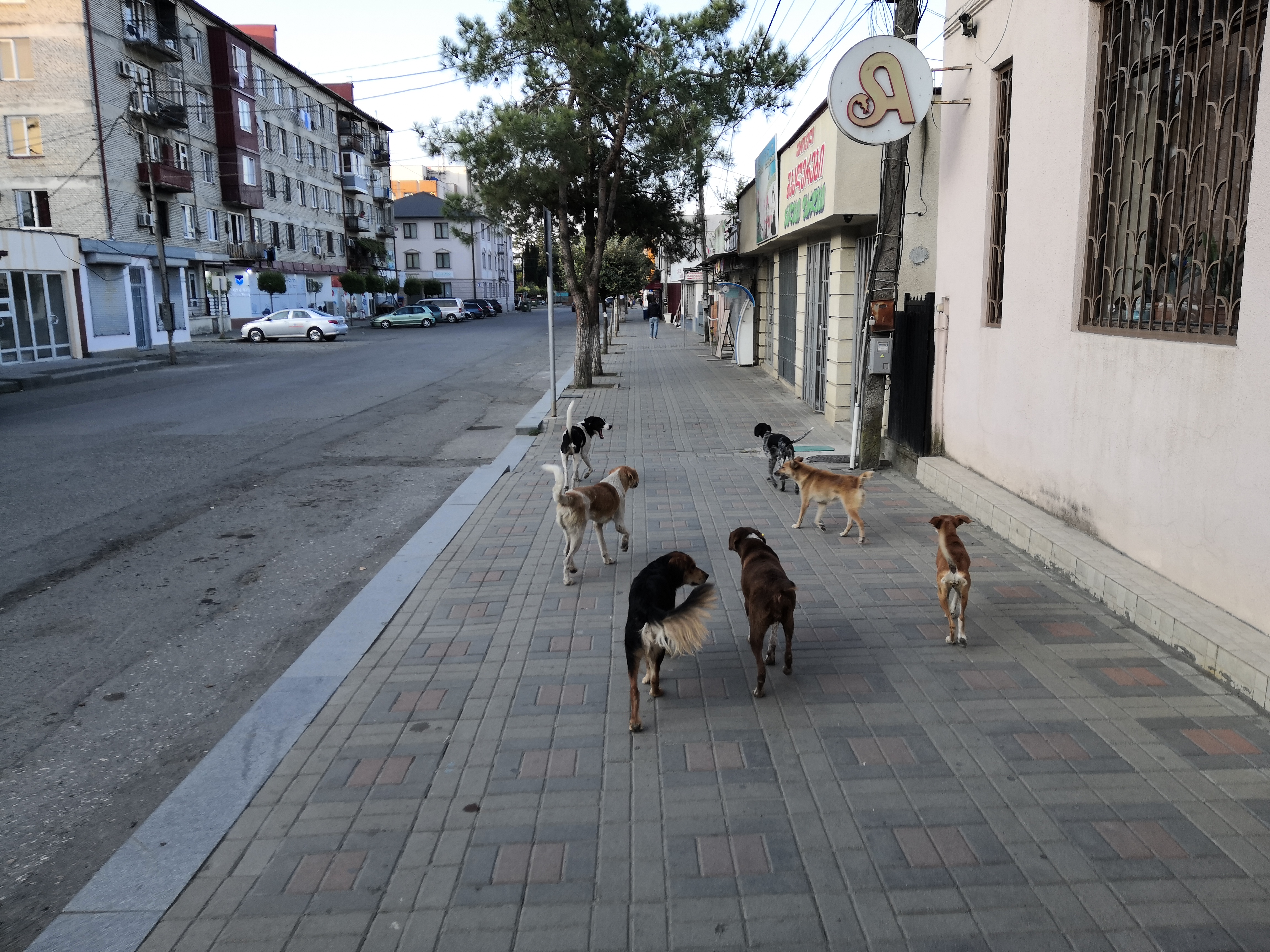 Um 7:25 entscheiden wir uns loszugehen. Allerdings sind wir nicht die einzigen mit diesem Plan. Wir sind nun in der Gesellschaft gefühlt sämtlicher zugdidischer Vierbeiner. Während wir nun das Revier unserer Begleiter erkunden, bemerken wir sogar so etwas wie eine soziale Struktur bei den Hunden. Und es wird offenkundig, wer sie gut und wer sie schlecht behandelt hat. Bei letzteren wir geknurrt, gebellt und hinterhergerannt, wenn sie vorbeigehen.
