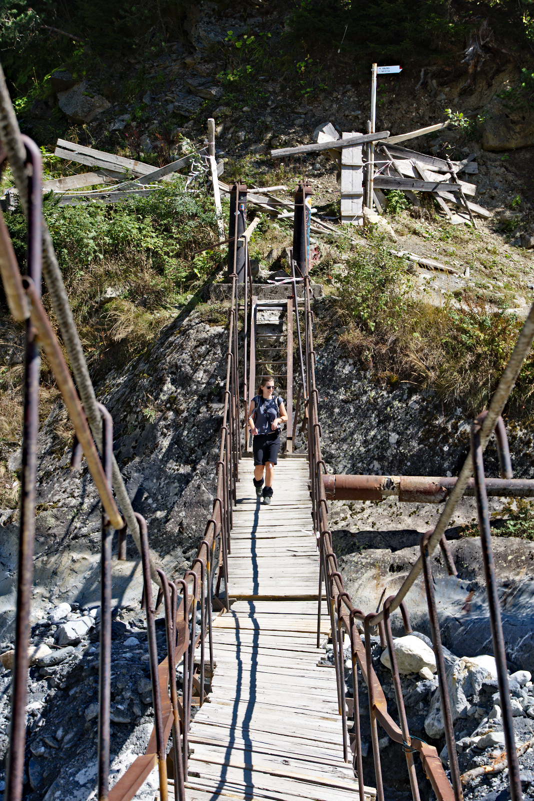 Die Autofahrt endet an einer wackligen Hängebrücke und führt schließlich durch ein Waldstück. Der unwegsame Waldwanderweg ist nicht wirklich anspruchsvoll, aber auch nichts für Wanderer mit Gehhilfen, denken wir. Genau solche sehen wir hier zuhauf schaufend durchs Gestrüpp humpeln.