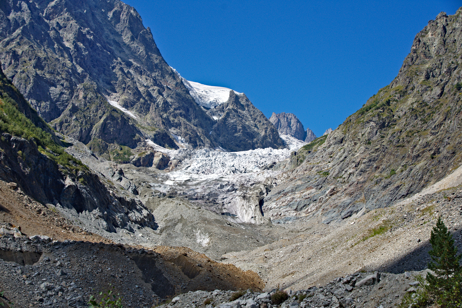 Eine Dreiviertelstunde später befinden wir uns am Fuße des Gletschers. Ein langes, schmales Tag führt den Blick direkt zum Eismassiv. Das Tag wird vom Fluss Mestiachala durchschnitten. Die Landschaft ist größtenteils karg, es liegt viel Geröll herum. Das Grau des Gerölls, das Grün der Landschaft drumherum und das intensive Blau des Himmels ergänzen sich wunderbar. Außerdem ist es warm! Ein schönes Örtchen, das zum Verweilen einlädt.