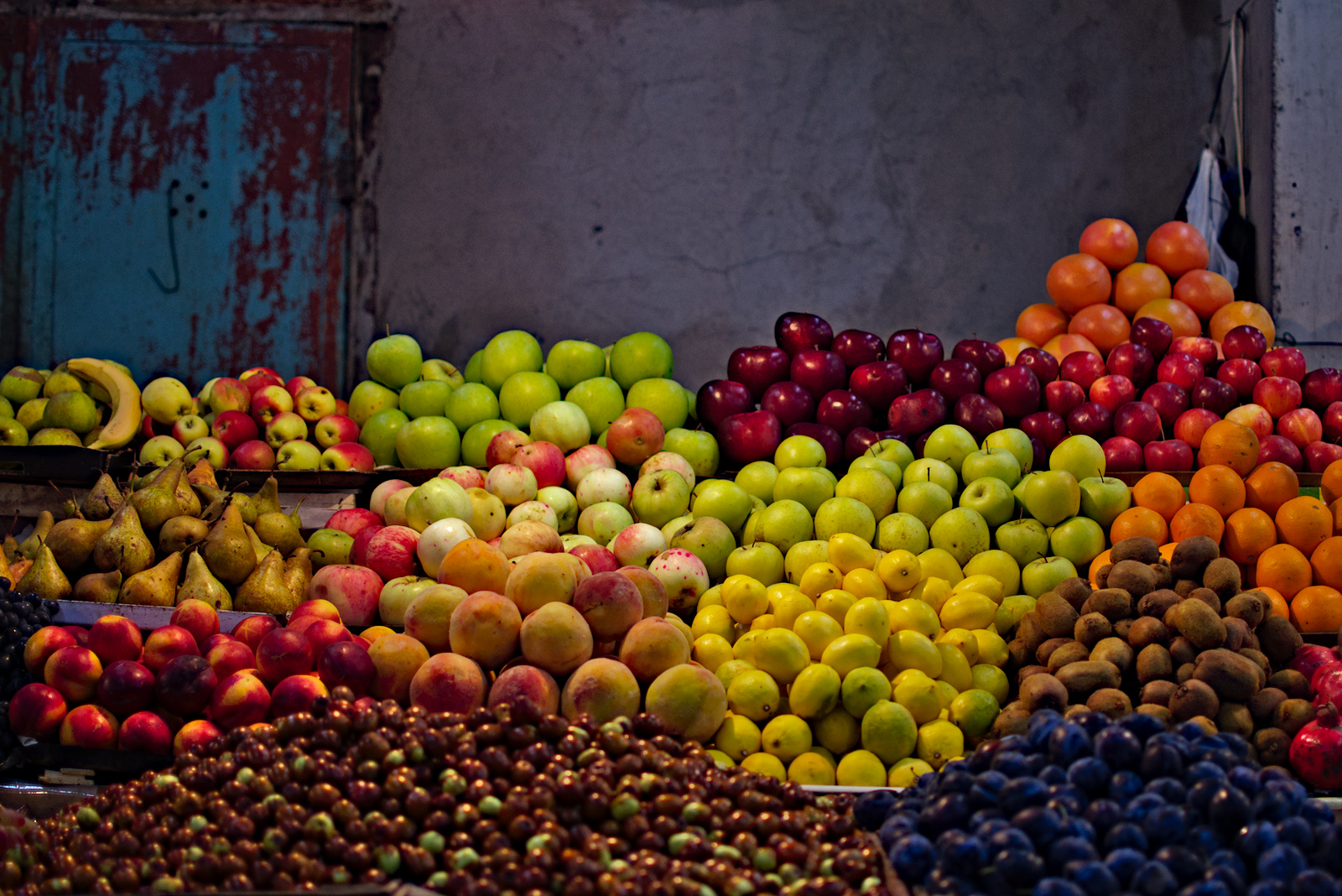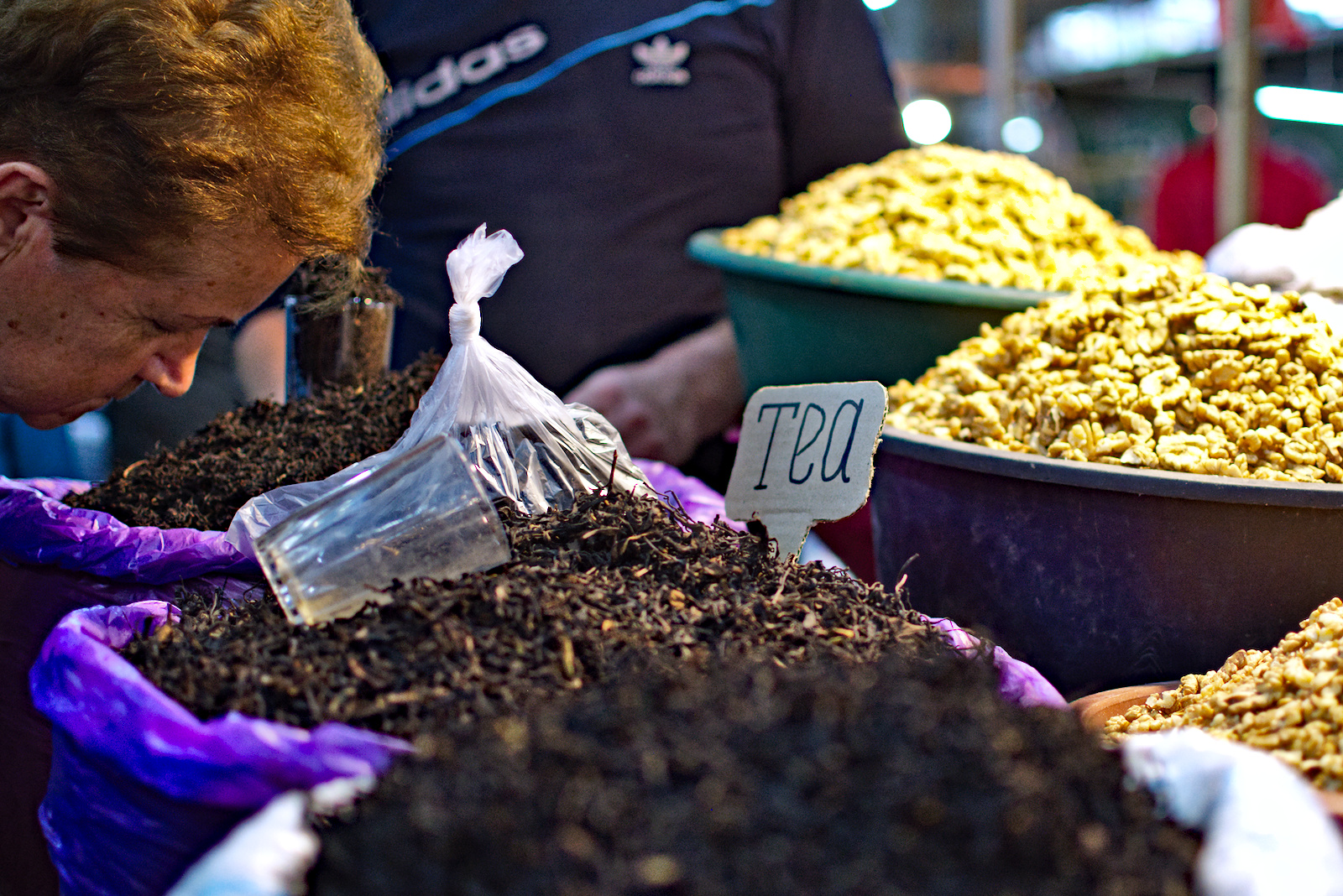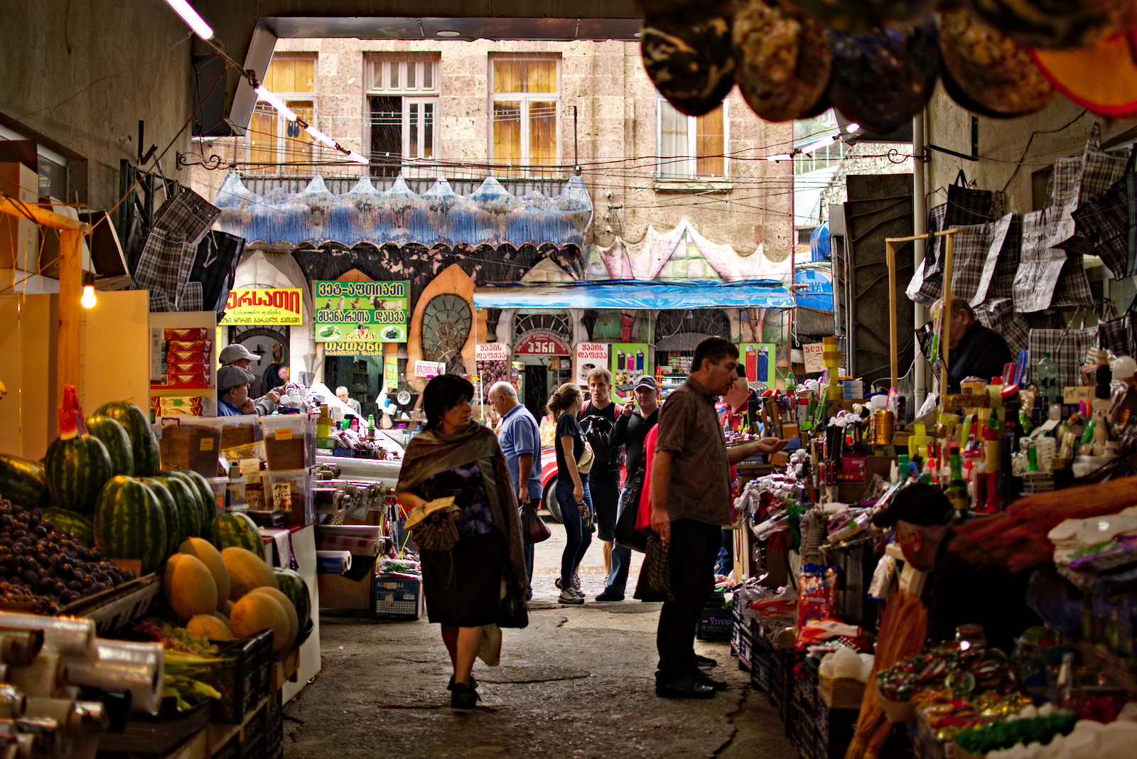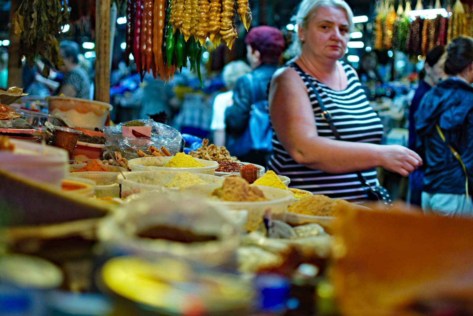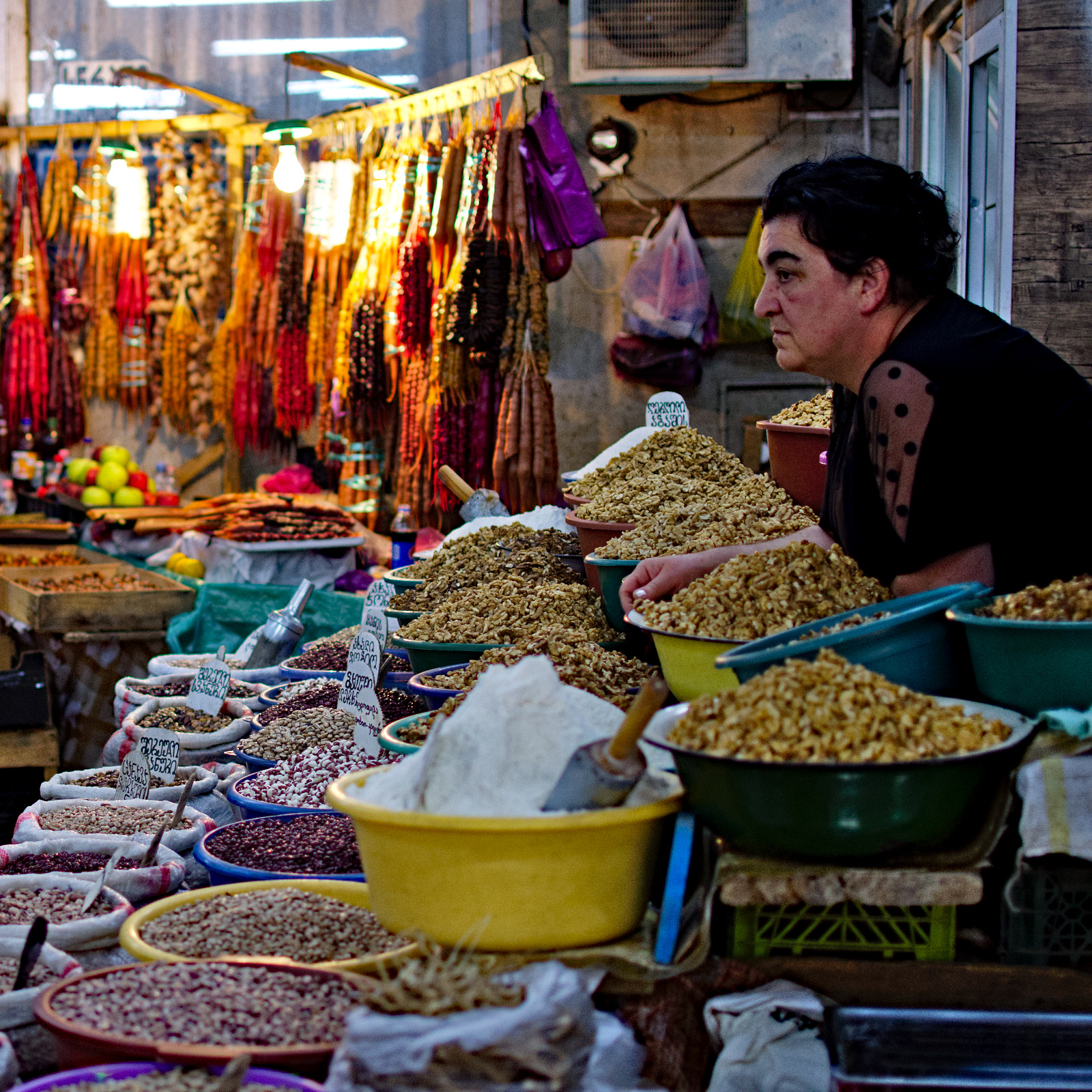 Umgeben von duftenden Gewürzen, eimerweise Schwarztee, Nüssen und Tabak, gerupften Hühnern, Schweinehälften, Churchkhela-Sträußen, Obstpyramiden, Melonenstapeln und Kleinkram vergeht die Zeit wie im Flug.