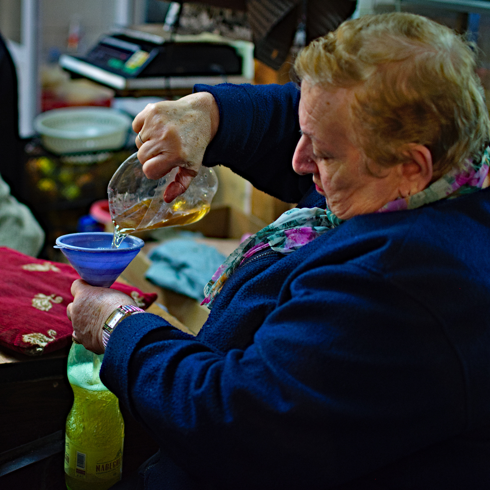 Uns kommt die Idee, die Zeit einfach ein wenig auf dem Zimmer abzusitzen. Ich kann ein wenig schreiben, Teresa kann sich ein wenig ausruhen. Und dafür besorgen wir uns noch einen schönen Bauernwein. Stände damit gibt es hier genug. Die ältere Dame lässt uns zunächst großzügig probieren. Tatsächlich ist das einer der traditionellen Weine hier, ein wenig trüber und dunkler als man es von daheim gewohnt ist. Aber er schmeckt wirklich sehr gut. Wir lassen uns einen Liter abfüllen. Über die Hygiene, so fragwürdig es auch für mitteleuropäische Augen sein mag, machen wir uns überhaupt keine Gedanken.