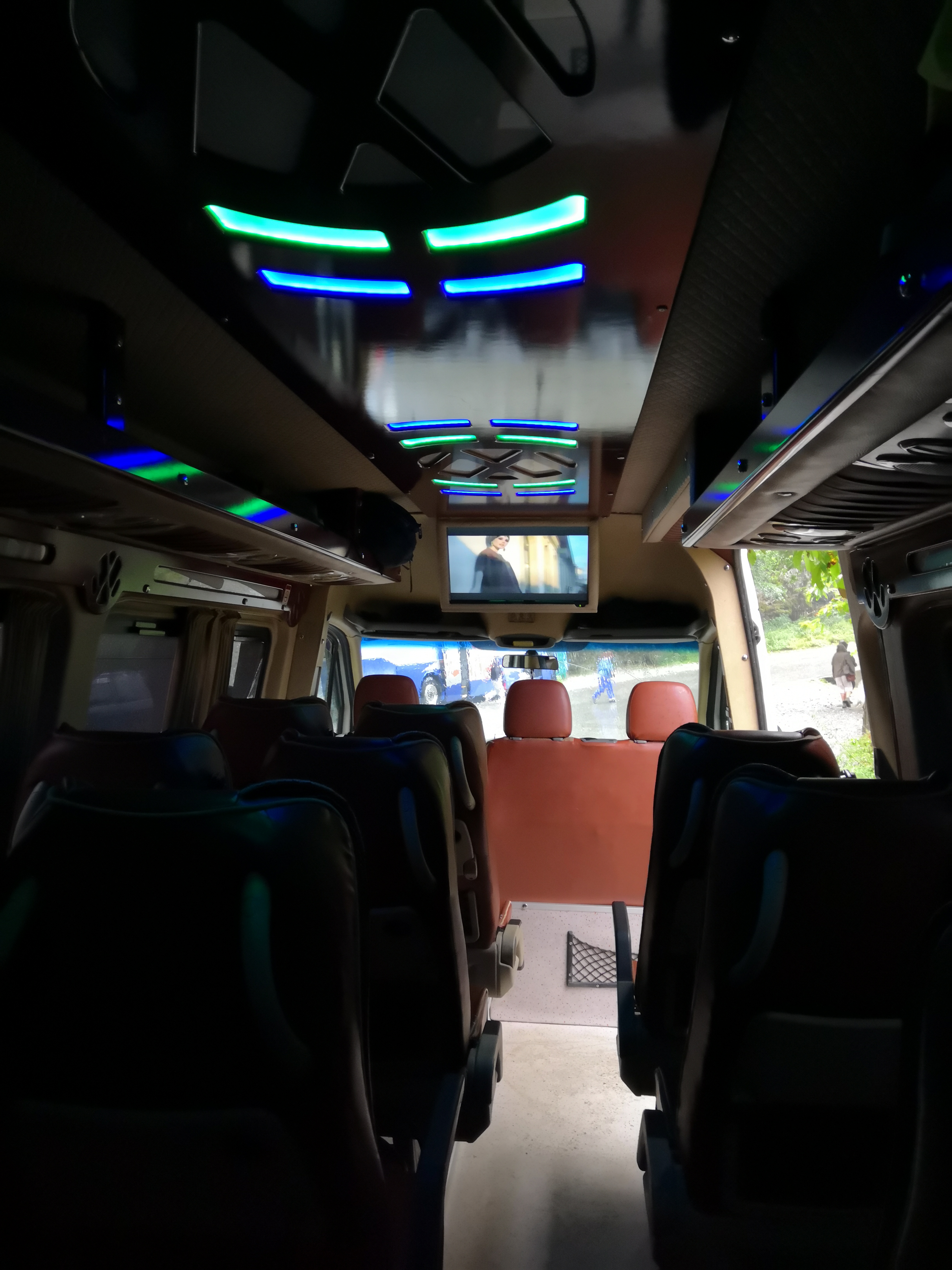 Es ist ein Volkswagen, das Innere farbenfroh und hell, die Sitze sind bequem. Es gibt sogar einen Fernseher, der zunächst russische Musikclips spielt, zum Schluss dann einen alten Kriegsfilm. Während der Fahrt kümmert sich unser Fahrer, wenn er gerade mal nicht telefoniert, um unser Unterhaltungsprogramm. Ein wenig zu sehr für unseren Geschmack.