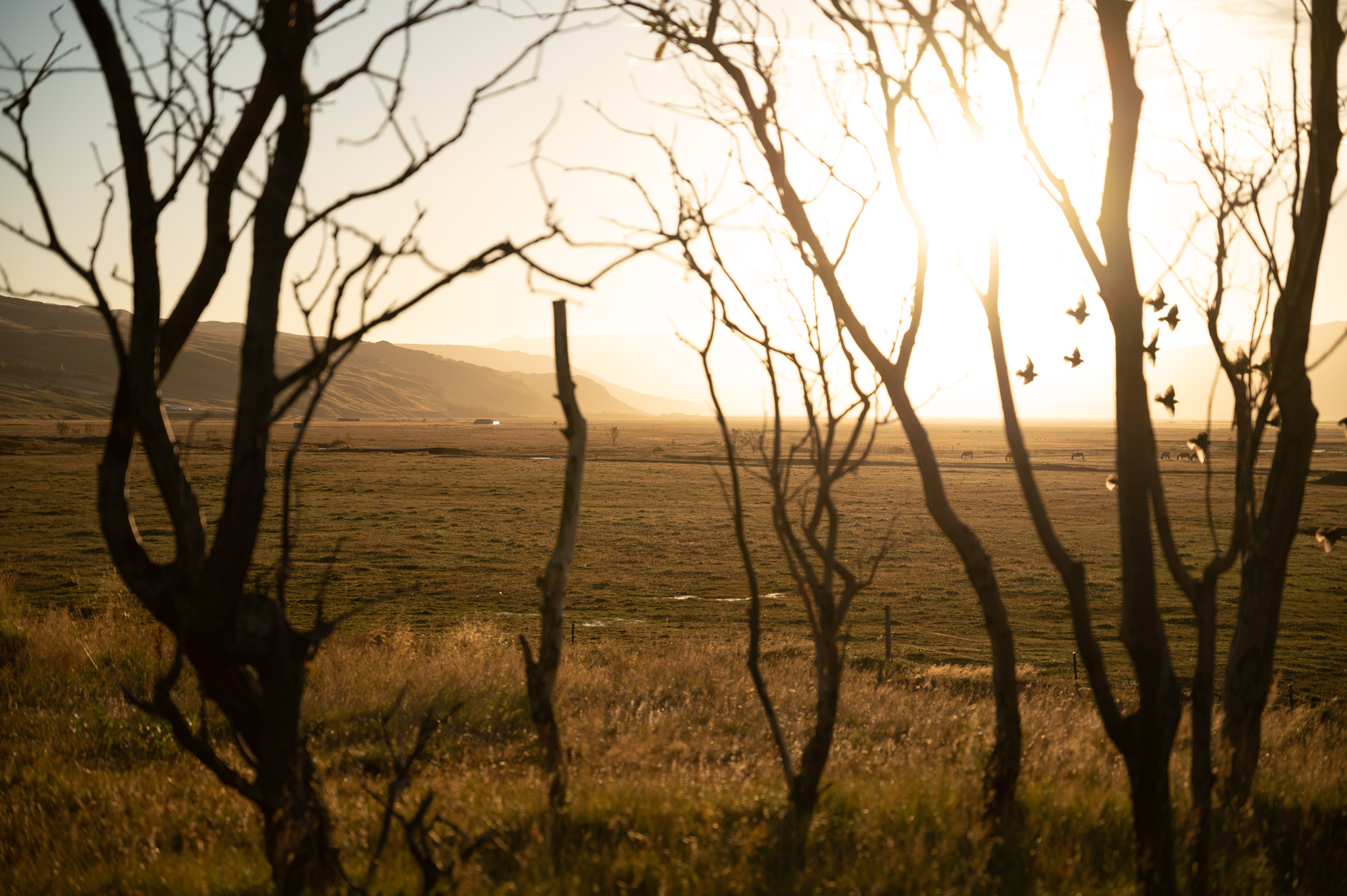 Das Krähen der Hähne und das Blöken der Schafe ist durch die dünnen Wände des Chalets zu hören. Meine erste Unterkunft ist ein voll ausgestattetes Häuschen. Ungefähr die Größe einer viertel Gartenlaube. Bett, Tisch, Bad und sogar ein Fernseher. Es riecht intensiv nach Nadelholz. Als ich gestern ankam, dachte ich, es wäre ein Raumduft. Aber es ist das Holz, das so gut riecht! Es ist 7:28 Uhr. Begleitet vom tierischen Weckruf stehe ich ganz knapp vorm Wecker auf. Durch die verschlossenen Vorhänge dringt kaum Licht hinein. Der goldene Glanz des Morgenlichts ist nur durch einen winzigen Spalt zu erahnen. Kurz darauf spaziere ich auf das Feld hinaus, das vor den fünf Chalets liegt und normalerweise als Parkfläche dient. Neuerdings aber nicht: Es hätten sich wohl Leute festgefahren. Die gestern noch aufgeschlagenen Zelte der Camper sind mittlerweile verschwunden. Vom Feld hat man einen unglaublichen Blick über das vom Krossá durchschnittene Tal. In der Ferne grasen lautlos die Pferde. Besser kann man gar nicht begrüßt werden.