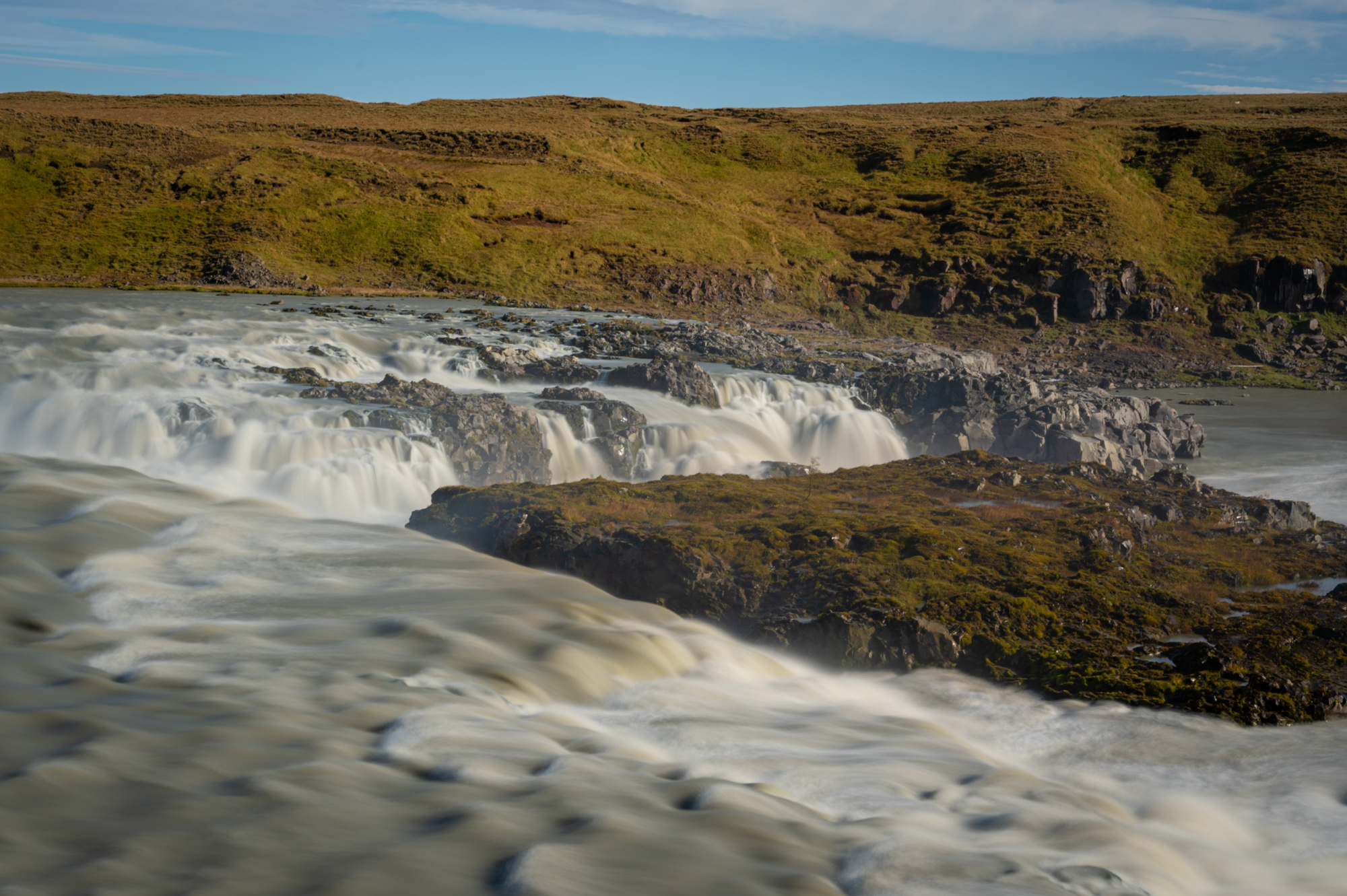 Ich bin noch unschlüssig, wo es als Nächstes hingeht. Zwar frage ich wegen einer Verlängerung nach, man bietet mir ein Hotelzimmer statt des Chalets an, aber eigentlich zieht es mich weiter ostwärts. Vorher schaue ich mir noch einige nahe gelegene Orte an, die ich gestern der Dunkelheit wegen gar nicht wahrgenommen habe: Eyrarbakki und Stokkseyri. Es sind zwei kleine, niedliche, verschlafene Örtchen. Ersteres tags- und nachtsüber zu erkennen an dem dominanten Gefängnis, dem größten der friedlichen Insel. Rückwegs, wieder in Richtung Osten, mache ich Halt am Wasserfall Urriðafoss. Ein stolzer Vorgeschmack auf die vielen weiteren "Fosse" der Insel.