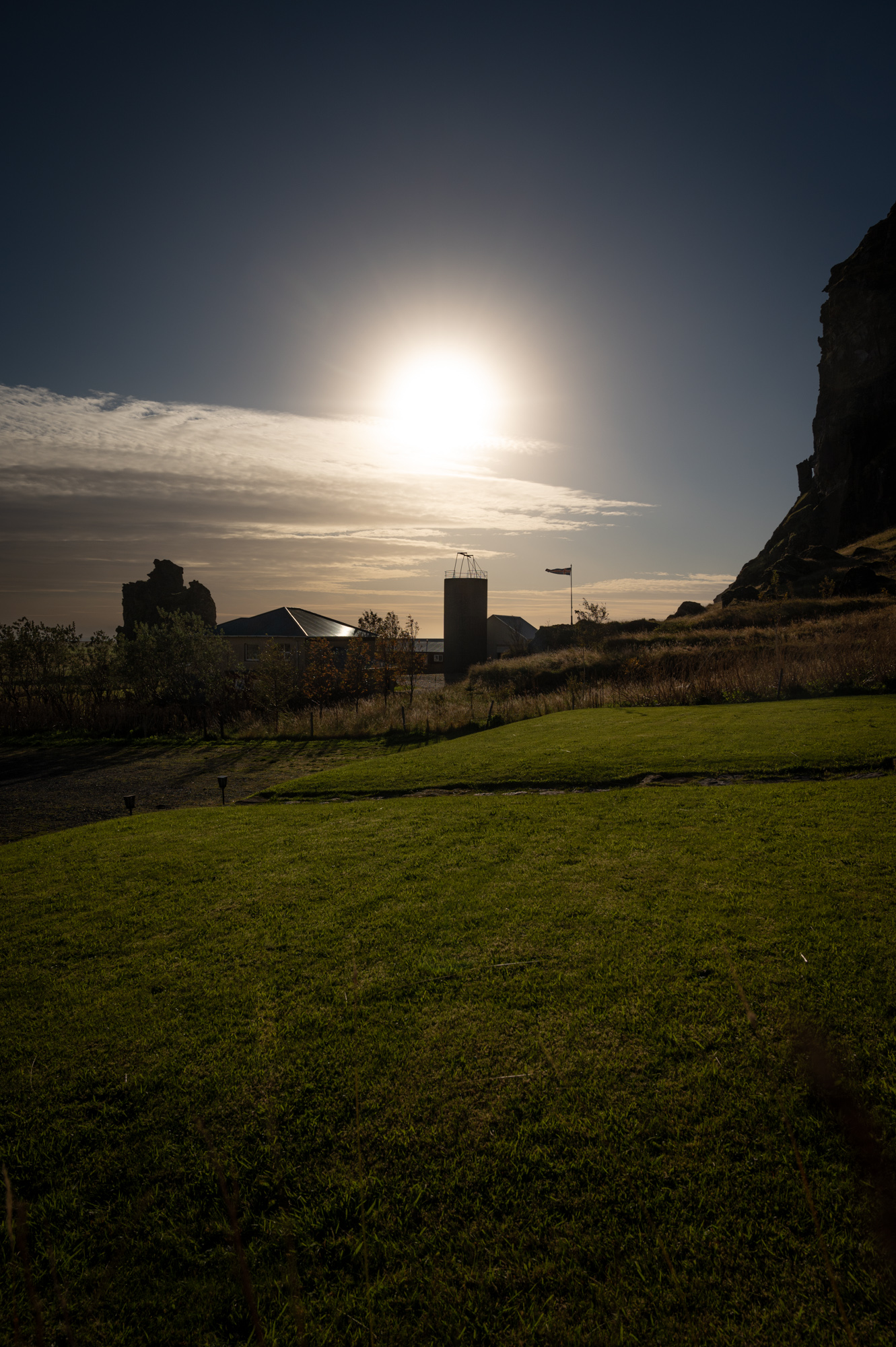 Die südliche Ebene der Insel lässt immer wieder erahnen, wie mächtig die Hochebene sein muss. Die Ausläufer des Gebirges kündigen sich durch das milchig-gelbe Tageslicht als große, kantige "Fremdkörper" an. Zwischendrin immer mal wieder ein imposanter Gletscher. Der Seljalandsfoss, einer der bekanntesten Wasserfälle Islands, ist schon aus der Ferne zu sehen. Ich fahre erst einmal bewusst daran vorbei, möchte heute Abend wiederkommen. Während der hochstehenden Sonne checke ich erstmal in der neuen Unterkunft ein. Sie befindet sich kurz hinter dem Eyjafjallajökull in direkter Nachbarschaft zum Drangurinn, einem sagenumwobenen Tuffstein, der einsam im geschützten Talkassel steht. Über die Zeit haben sich kleine Häuschen direkt am Sockel des Steins und dessen Höhlensysteme angedockt, deren Ruinen noch heute zu besichtigen sind. Sagenumwobene Geschichte und sagenhafte Landschaft gehen hier Hand in Hand.