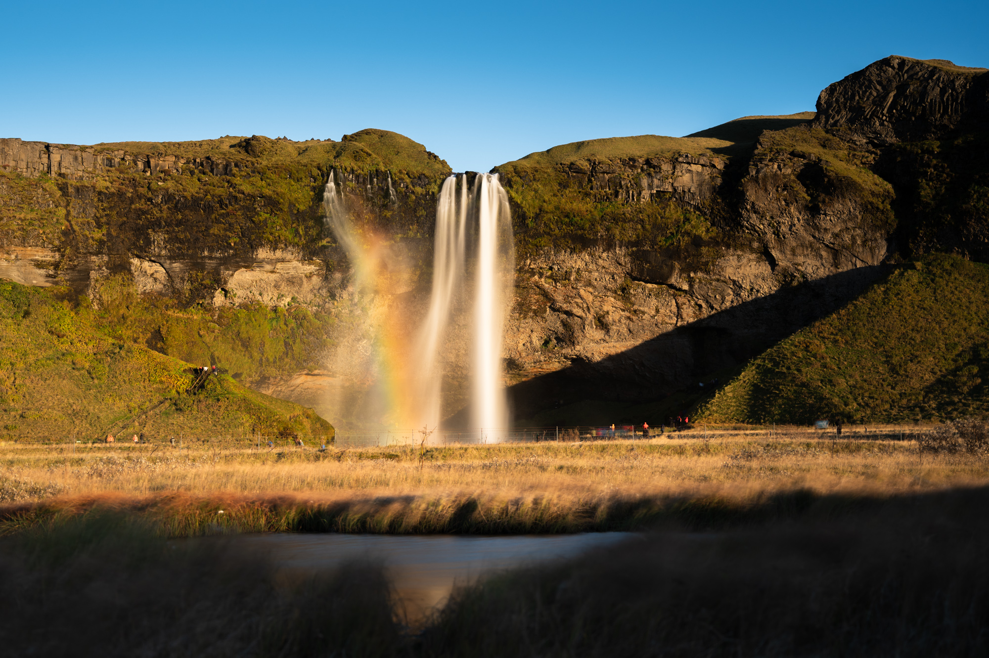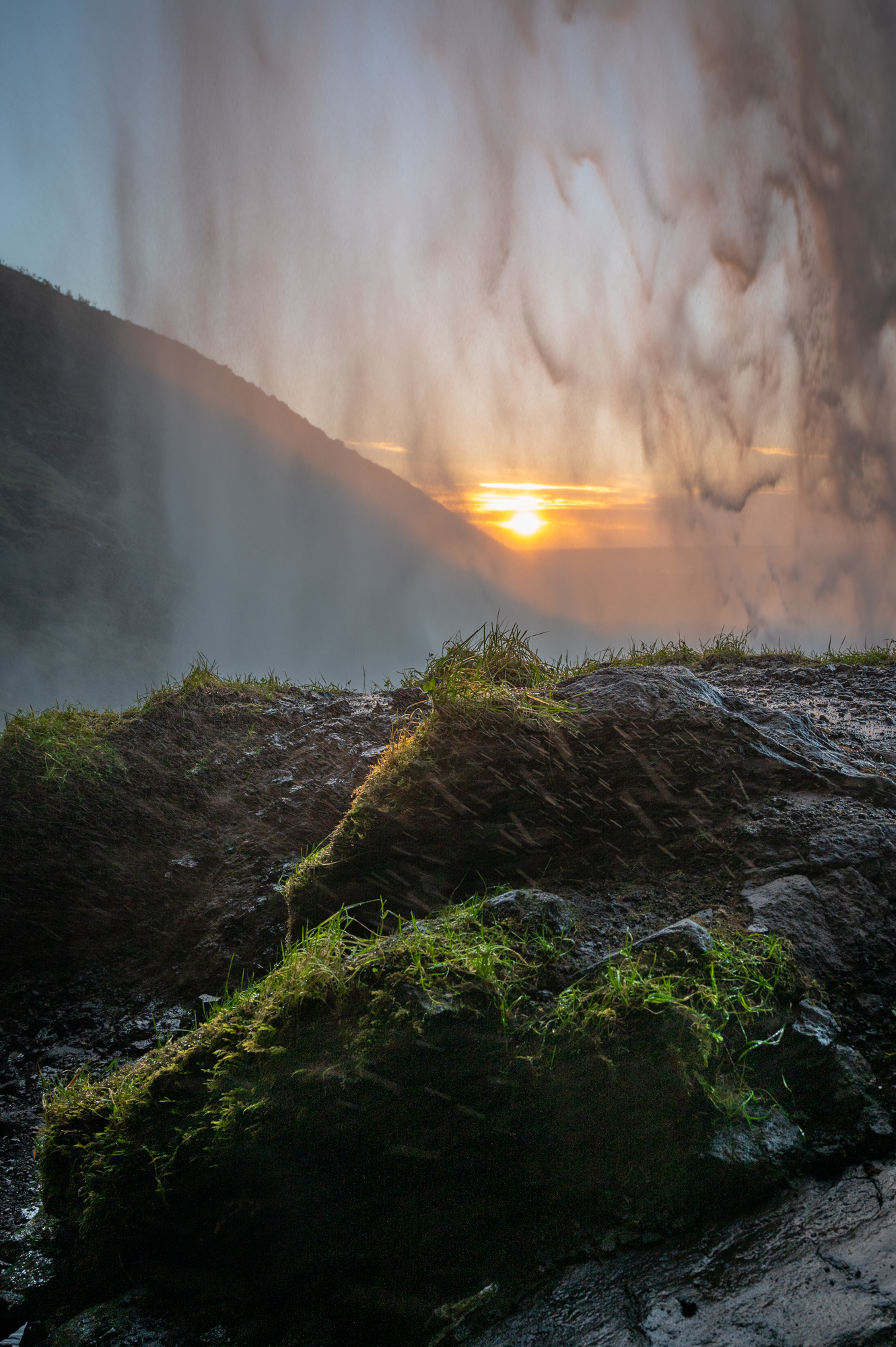 Das Hotel ist eher von der melancholischen Sorte. Die Lobby ist gut beheizt, Zimmer gibt es viele, es liegen zwei Notizen samt Schlüsseln auf dem Tresen. Als ich die polnische Rezeptionistin später antreffe, hake ich nach, wie viele der Zimmer hier belegt wären. Sie erzählt etwas verlegen, dass nur ein amerikanisches Ehepaar und ich hier sind. Die beiden Notizen eben. Auf der Buchungsseite schien das Hotel fast ausgebucht. Wenn der Wind durch's Tal fegt, klingt eine eigenartige Melodie im Haus. Es ähnelt einer Tonleiter. Sie kommt über's Abwasserrohr. Sehr eigenartig, aber irgendwie harmonisch. Ich dachte ursprünglich an jemanden, der in einem Nachbarzimmer auf der Trompete übt. Den Abend verbringe ich am Seljalandsfoss. Alle Register sind gezogen: Regenhose, Regenjacke, schützende Hülle für die Kamera. Das Besondere ist nämlich, dass man bis hinter den Wasserfall gehen kann. Die Fotografenscharen gehen trotzdem freundlich miteinander um. Einige von ihnen verharren wohl schon länger in der Gischt und warten auf den perfekten Moment. Dessen Eintreffen wird immer unwahrscheinlicher. Im Südwesten befindet sich, nah am Horizont, eine dicke Wolkenschicht.