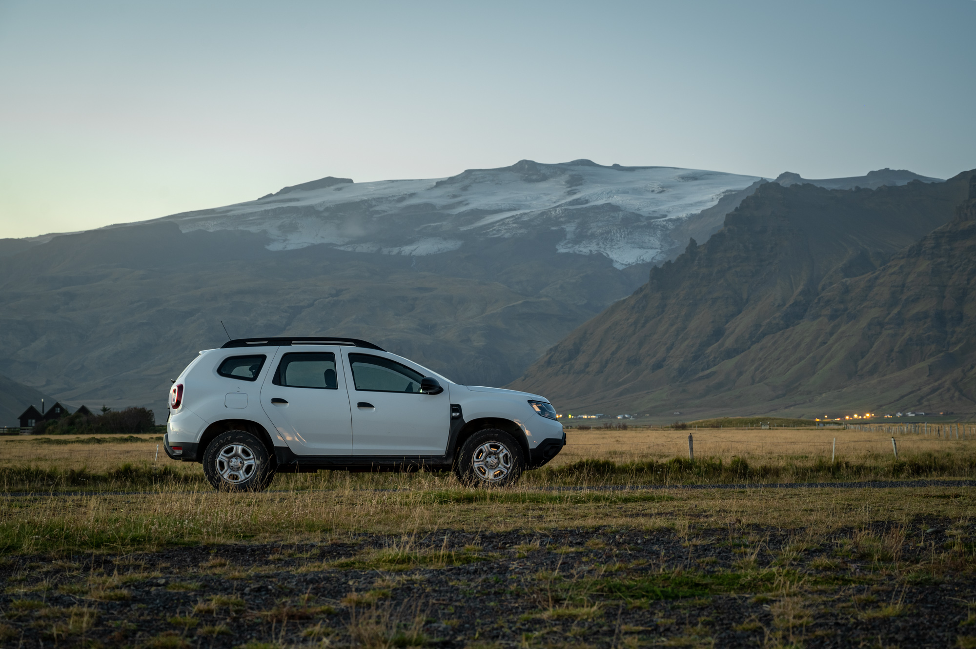 Die Wolken durchkreuzen auch meine Pläne. Auf dem Weg zum Seljalandsfoss habe ich mir ein paar Landmarken bereitgelegt, die ich gerne zur blauen Stunde fotografieren würde. Auch das wird heute nichts mehr, es wird schneller dunkel, als erwartet. Ich begnüge mich mit einer kurzen Stippvisite zur Eyvindarhólakirkja. Eine kleine, abgelegene Kirche Einfach um sie mal aus der Nähe zu sehen. Sie ist hier eine markante Landmarke. Das Fotomotiv wird letztendlich aber das Auto in der Landschaft
