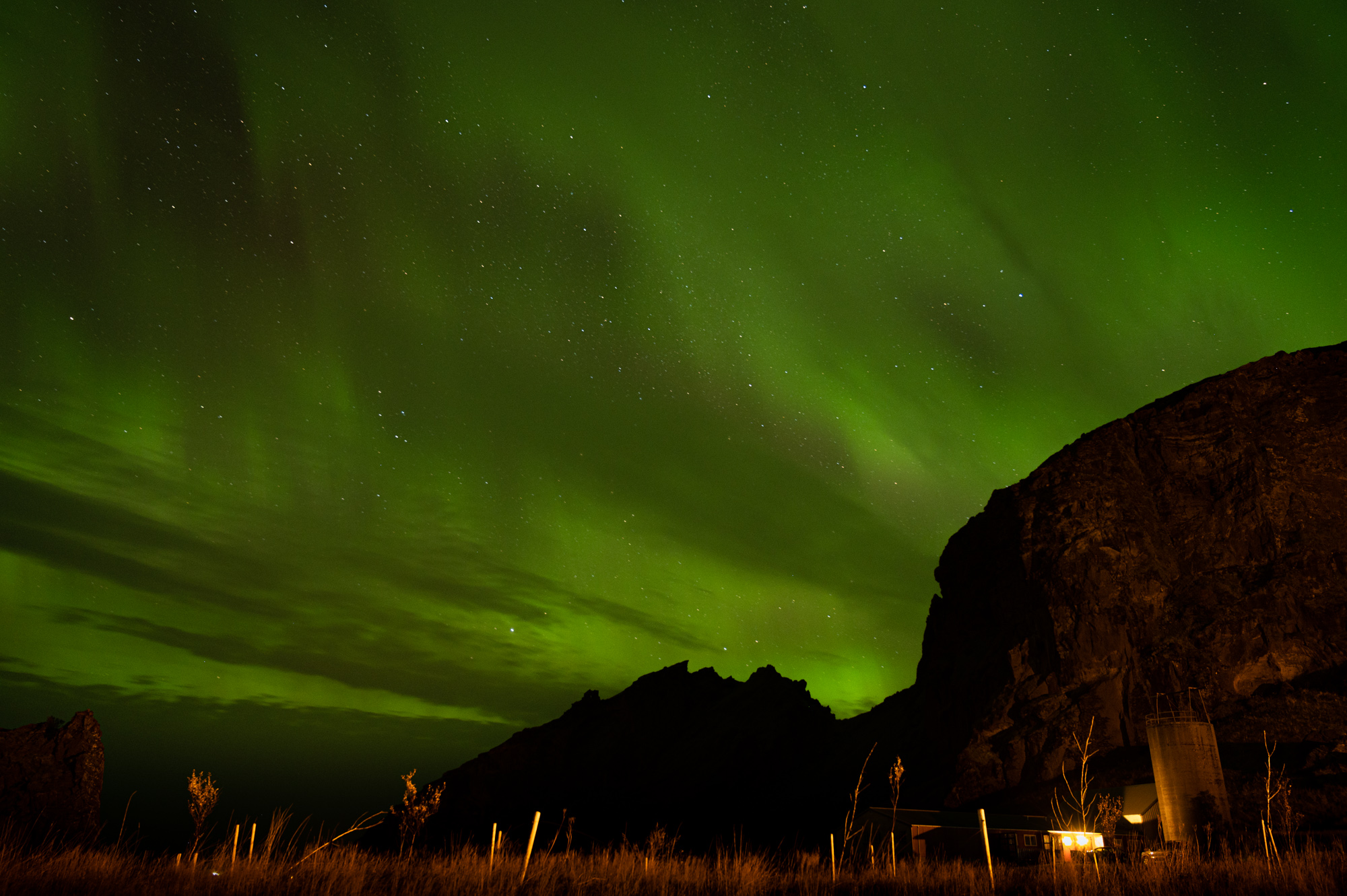 Als ich nun beginne, diesen Text zu schreiben, ist die Nacht sternenklar. Von Nordlichtern keine Spur. Später dann werfe ich einen letzten Blick aus dem Fenster. Es wäre schon ärgerlich, wenn die Sonnenstürme über meinem Kopf gerade alles geben und ich einfach nichts mitbekomme. Von dieser Seite des Hotels sieht man kaum etwas, zu hell ist die Beleuchtung des Hauses. Aber man kann es zumindest erahnen. Milchige Schlieren, die eher aussehen wie dünne Wolken in der Lichtverschmutzung einer Großstadt. Das kann nun wirklich nicht sein bei der dünn besiedelten Gegend. Ich packe mich wieder in die warmen Klamotten, um den zwei Grad Außentemperatur etwas entgegenzusetzen, Selbstauslöser, Kamera und Stativ ein und richte an einer dunkleren Stelle des Hofes meinen Blick in Richtung Himmel. Er ist in allen Richtungen übersät mit diesen schwach leuchtenden, hellgrauen Schlieren. Größtenteils sehen sie wirklich aus wie Wolken. Ab und zu aber blitzt es zwischen ihnen schwach auf und sie ordnen sich teilweise neu an. Zum Beschreiben der Magie dieses Moments fehlen mir ehrlich gesagt die Worte. Magie ist das Schlüsselwort. Ich weiß zwar, was da physikalisch vor sich geht, aber es lässt mich alles andere als kalt. Mittlerweile ist es auch halb drei. Zeit, um genauso zufrieden und motiviert ins Bett zu fallen, wie ich aufgestanden bin.