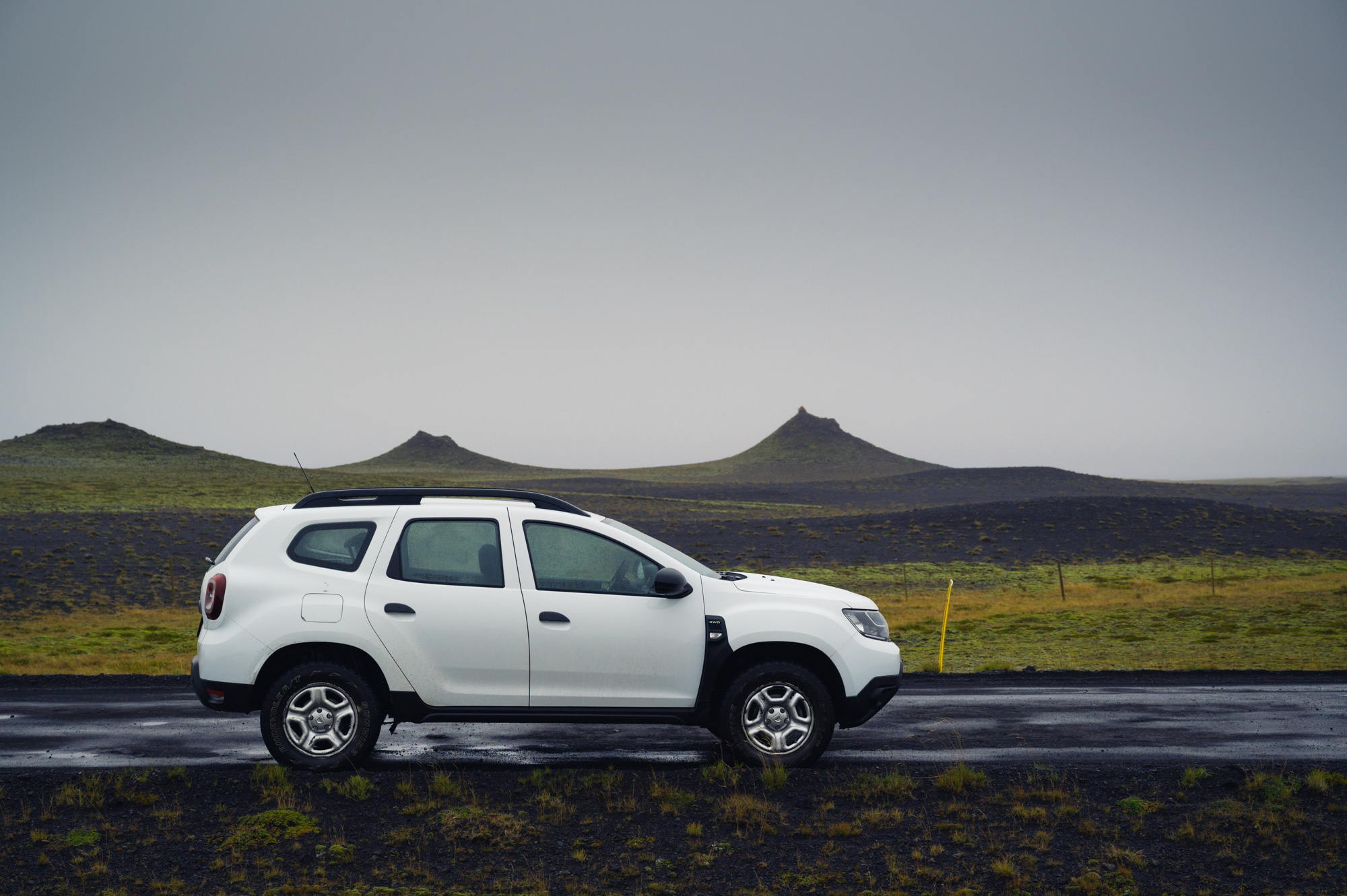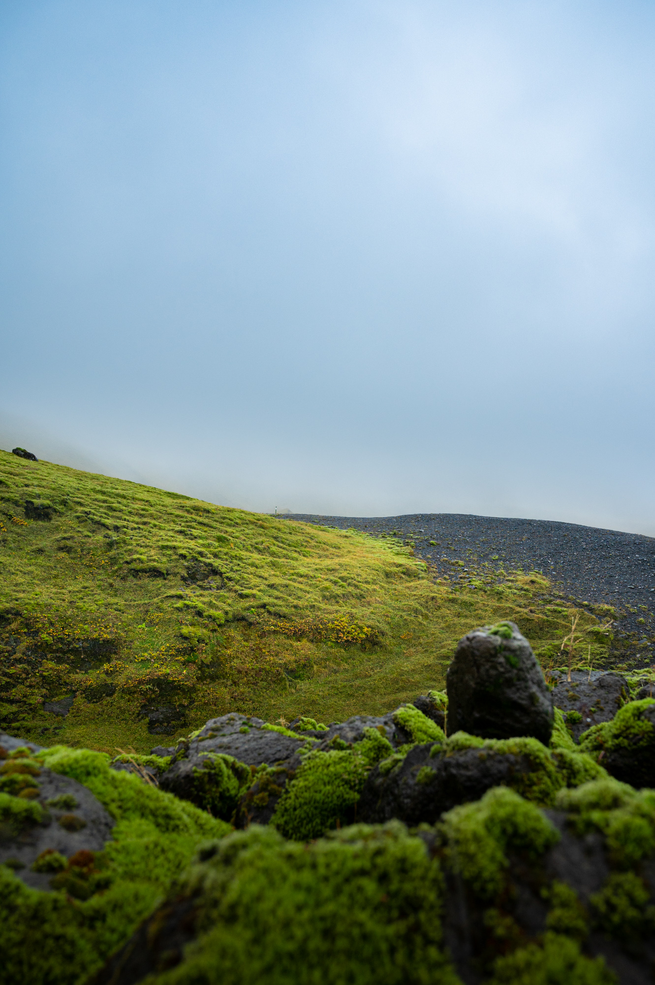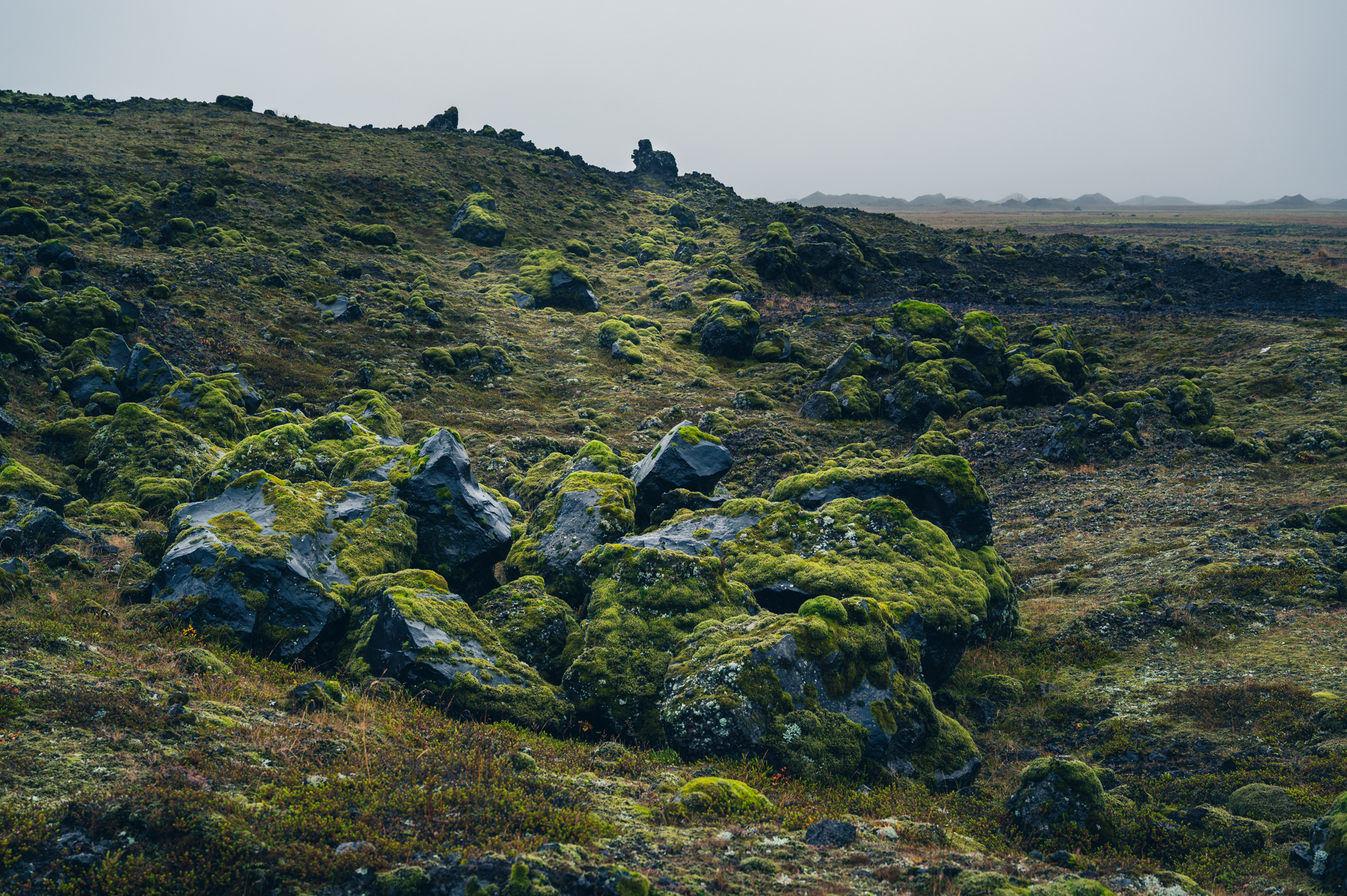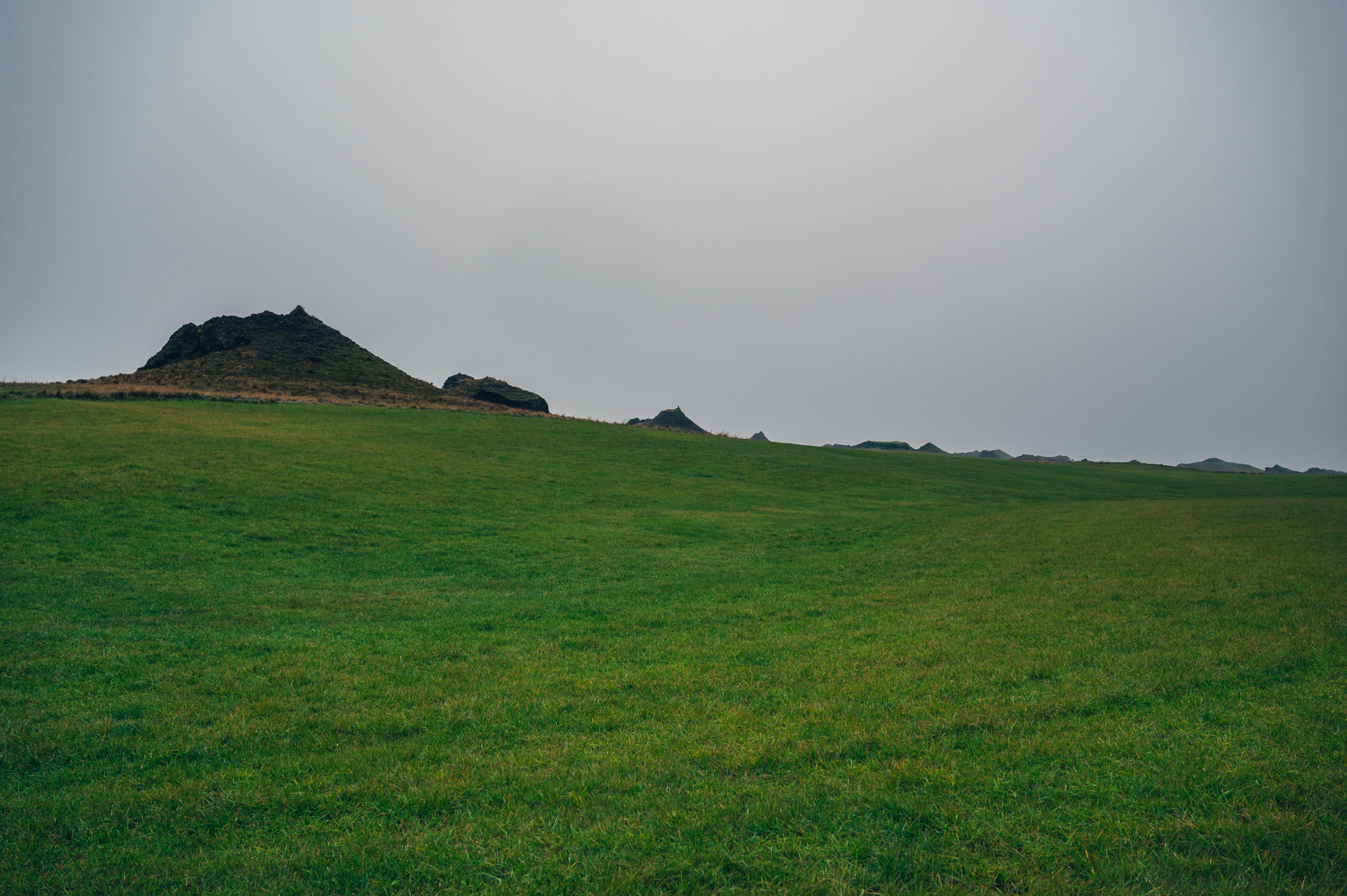 Als ich vom Hotel westwärts auf die Ringstraße biege, befinde ich mich auf der Strecke, die mir während der Anfahrt in der tiefschwarzen Nacht verborgen blieb. Es ist die grüne, mit vielen kleinen, sanften, aber definierten Hügeln überzogene Landschaft, die sich noch einige Kilometer westwärts fortsetzen wird. Eben jene, in der sich auch das Hotel Laki befindet. Nach etwa zwanzig Kilometern biege ich links in eine unbefestigte Seitenstraße. Die Schilder weisen nach Álftaver. Ich folge ihr einige hundert Meter und bleibe am Straßenrand stehen. Die Musik verstummt, es bleibt das stete Prasseln des Regens auf dem Autodach. Es ist kalt und ich steige nur widerwillig aus dem Auto. Der dichte, grüne Grasteppich ist hier deutlich kahler, als noch einige Kilometer zuvor. Zahlreiche schwarze Stellen blitzen durch den zuvor makellosen Teppich. Es sind Brocken aus erkalteter Lava und der blanke Boden selbst. Auch die Hügel sind hier nicht mehr makellos rund geformt, sondern nach oben hin spitz zulaufend. Sie haben deutlich ausgeprägte Krater, sehen aus wie Minivulkane und haben die Größe von einigen wenigen Einfamilienhäusern. Das hier ist eine besondere Landschaft. Was wie kleine Vulkane aussieht, sind sogenannte Pseudokrater. Sie entstehen bei Vulkanausbrüchen, wenn der noch heiße Lavastrom über den mit Wasser getränkten Boden fließt, erstarrt und der Wasserdampf darunter die Lavaschicht mehrere Male aufsprengt. Passiert das nur einmal, entstehen die makellos runden Hügelchen. Als ich ostwärts unterwegs war, wirkte die Landschaft im Sonnenuntergang und der schnell voranschreitenden Abenddämmerung zwar auch vulkanisch geprägt, aber eher steinwüstenartig. Einige Kilometer weiter westwärts bestätigt sich dieser Eindruck. Aber auch nur teilweise. Denn die "Steinwüste" würde ich jetzt eher als eine Landschaft aus flachen Lavadünen beschreiben. Die "Minivulkane" bilden die imaginäre Grenze zwischen der Hügel- und der Dünenlandschaft. Wieder das Gefühl des ausgetauschten Bühnenbilds. Wahnsinn, wie wandelbar die Eindrücke sind. Würde ich noch einmal hier vorbeifahren, sähe es vielleicht ganz anders aus.