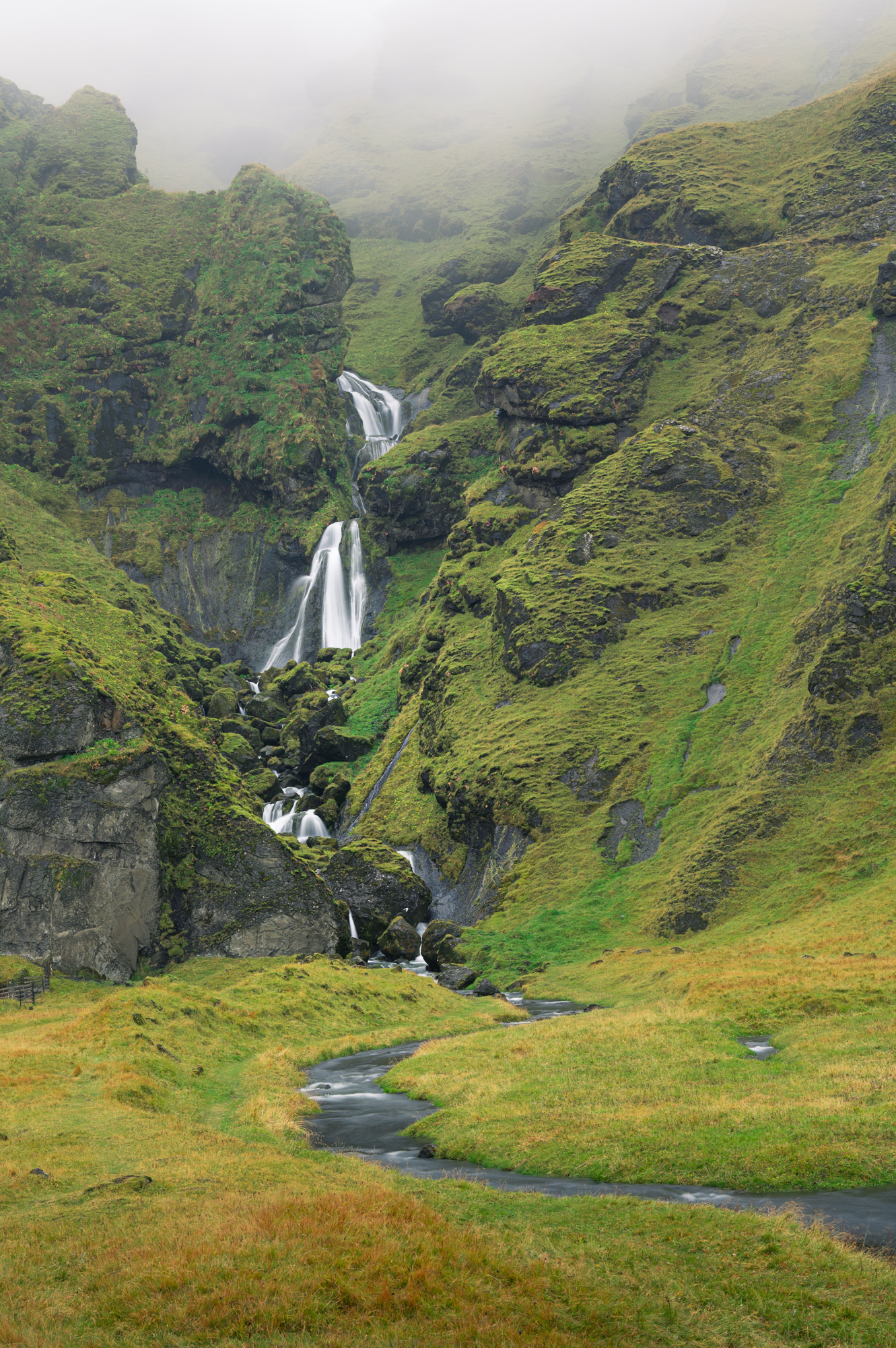 Kurz vor Vík lasse ich die Lavaebene hinter mir. Rechterhand ragen die Berge imposant aus dem isländischen Boden. Ich halte wieder in einer Seitenstraße. Sie ist löchrig. Die Schlaglöcher sind mit trübbraunen Wasser gefüllt. Wo es geht, manövriere ich um sie herum. Nebenan befindet sich eine Baustelle. Es scheint sich um irgendwelche Bohrungen zu handeln. Es ist die Stelle, an der zuletzt eine weit sichtbare Dampffontäne aus dem Boden sprudelte. Ich mache vor einem riesigen Schlagloch halt, das die Breite der kompletten Straße einnimmt. Vor mir befindet sich der Uxafótafoss. Der Uxafótafoss fließt in Kaskaden entlang einer kleinen Schlucht aus dem wolkenumhüllten, grün bewachsenen Lavamassiv und speist einen kleinen Bach, der sich an mehreren Stellen in der Wiese verzweigt. Es nieselt nur, es ist aber diese Art von dichtem, penetrantem Nieselregen, bei dem nach wenigen Sekunden bereits alles klitschnass ist. Den kleinen Fotostopp lasse ich mir dennoch nicht nehmen. Ich bin glücklich um die Wanderschuhe, die trotz knöcheltief durchgeweichter Wiese zumindest meine Füße trocken halten. Im Nieselregen werden die Hände schnell kalt, ich kämpfe ein wenig mit dem Trockenhalten der Fotoausrüstung. Ständig wische ich mit dem Tuch über den am Objektiv angebrachten Filter.