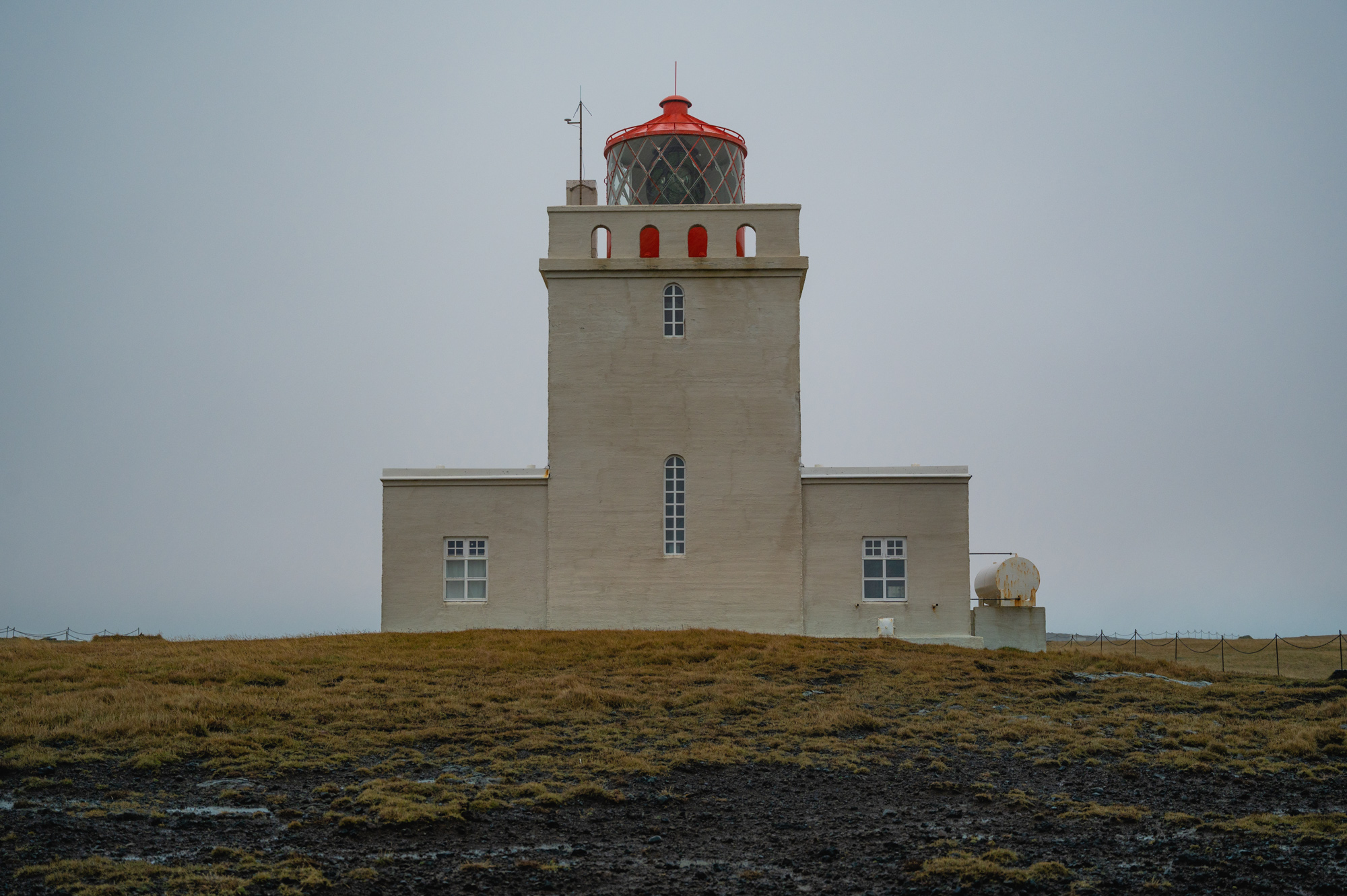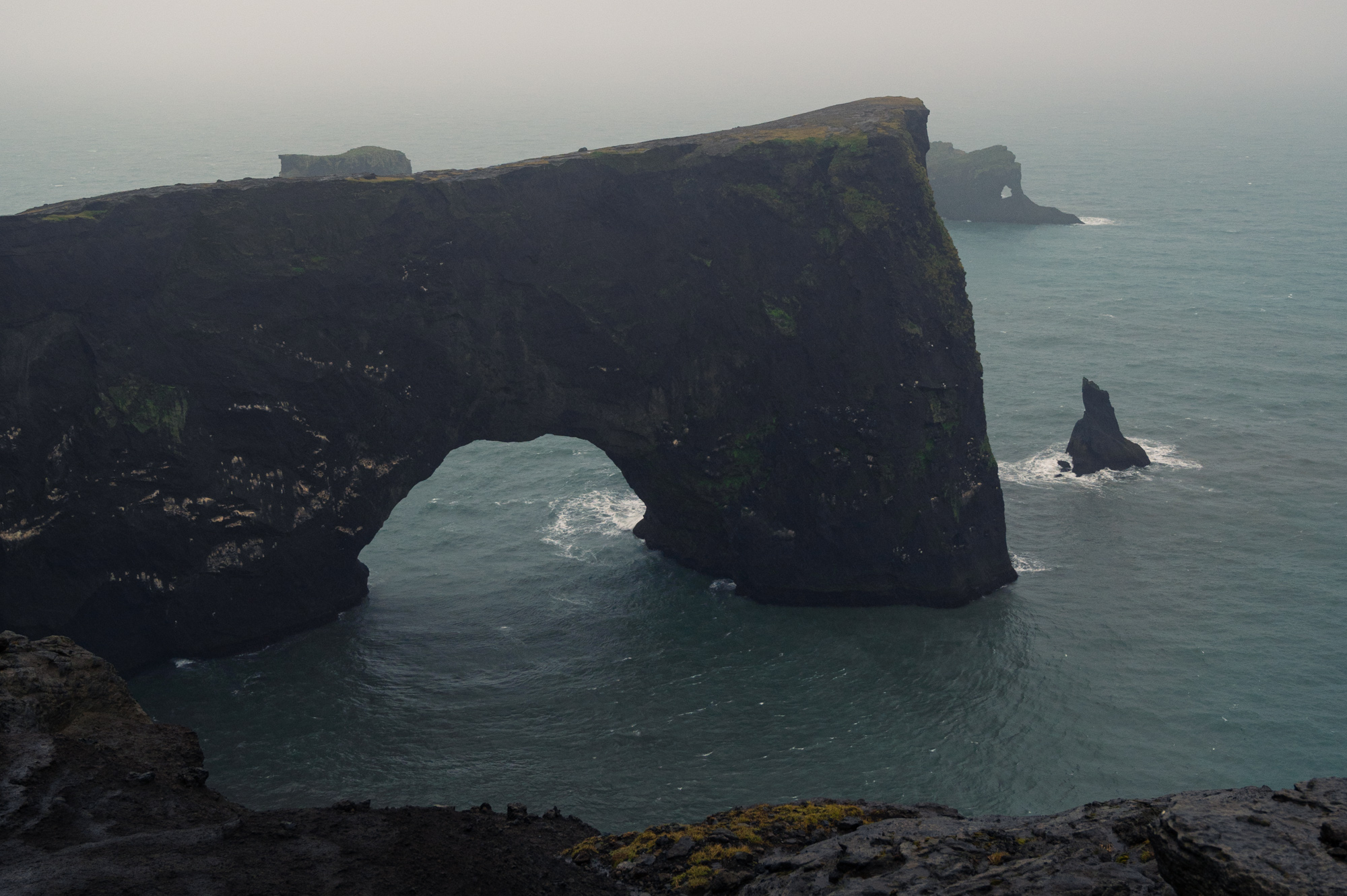In Vík halte ich nur ganz kurz zum Tanken an. Diesmal weiß ich ja, wie es geht. Trotz des unangenehmen Wetters möchte ich nun auf dem Rückweg auch die Halbinsel Dyrhólaey besuchen. Auf dem Weg dorthin überquert man einen schmalen Damm, um anschließend in eine extrem steile Serpentinenstraße einzubiegen. Wie in einem gewundenen Parkhaus arbeitet man sich Meter um Meter mit einer erlaubten Höchstgeschwindigkeit von 20 km/h der schönen Aussicht entgegen. Die Regencapes und Jacken der übrigen, stark nach vorn gebeugten Besucher flattern hektisch im strengen Wind. Jede Böe schüttelt das Auto kräftig durch. Widerwillig ziehe ich mir wieder die Regenjacke über, die noch vom letzten Halt tropft. In den wenigen Sekunden, in denen ich mich versuche im Windschatten des Autos startklar zu machen, ist die Wanderhose bereits klitschnass. Als ich am Rand der Klippe stehe und die Küste entlang blicke, peitscht mir der Regen von schräg unten ins Gesicht und unter die Regenjacke. Einzig den schlichten Leuchtturm scheint das Wetter nicht zu beeindrucken. Für mich wird es nur eine kleine Stippvisite. Gern hätte ich mich länger hier aufgehalten, zu groß ist das Verlangen, aus dem Regen herauszukommen.