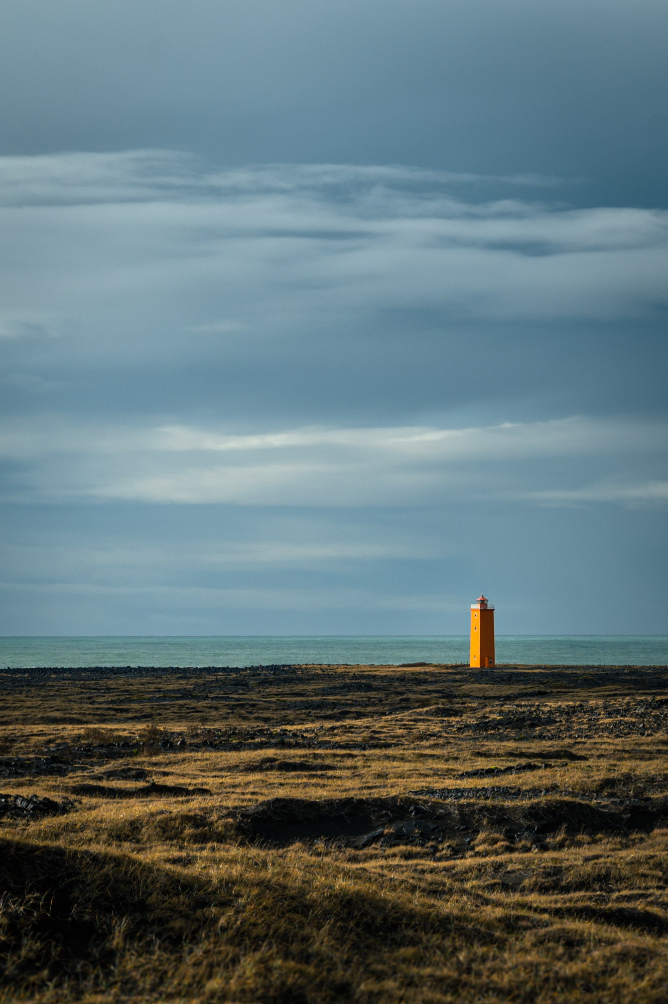 Hinter den schweren Vorhängen des Hotelzimmers rauscht der dichte Verkehr. Als ich sie zurückziehe, sehe ich durch die große Fensterfront eine Szene, wie ich sie auch in einer durchschnittlichen mitteleuropäischen Kleinstadt mit Industriegebiet erwarten würde: graue, triste Gebäude, eine verregnete Straße, auf ihr Fahrzeuge in einer endlosen, engmaschigen Kette. LKW und PKW, die sich vorwiegend westwärts bewegen. Nur die Reklame des gegenüberliegenden Supermarkts schreit förmlich: "Du bist in Island, wir sind opið!". Ganz langsam packe ich meinen Kram für den Tag zusammen, nehme eine schweflige Erdwärmedusche und schnappe mir schließlich ein Schinkencroissant auf dem Weg zum Auto beim Bäcker nebenan. Der Bäcker strahlt etwas Hyggeliges aus. Freundliches Personal, warme Farben, einladendes Inneres. Wie alle Bäcker hier. Es ist kurz nach zehn und ich bin später dran als geplant, aber immerhin gut erholt. Kreisverkehr um Kreisverkehr wird der Verkehr lichter. Am Stadtrand von Selfoss verabschiedet mich das letzte Neubaugebiet. Plötzlich ist die Straße nur noch eine Betonschiene durch eine unwirtliche Landschaft. Kurz darauf folgt eine sehr langgezogene Rechtskurve. In Eyrarbakki möchte ich tanken, verpasse aber den Stopp, denn ich dachte, die Tankstelle läge gut sichtbar in Nähe der Straße. Umkehren möchte ich jetzt aber nicht mehr. 160 Kilometer Restreichweite sollten locker bis zur nächsten Tankgelegenheit reichen. Licht und Wetter erinnern heute an einen typischen Apriltag: Immer mal wieder schauert es, kurz darauf strahlt die Sonne kräftig durch die Wolken. Die frisch-nasse Fahrbahn glänzt und blendet, sobald man gegen die Sonne schaut. Ab und zu halte ich an. In der Ferne liegt das grüne Meer als schmaler Streifen zwischen dem graublauen Weich des Himmels und dem schwarzgelben Schroff der Vulkanlandschaft. Dazwischen hebt sich der orange Leuchtturm ab. Bis auf die wenigen vorbeirauschenden Autos der einzige Hinweis auf Zivilisation. Eine ruhige Szene, den Wind sieht man nicht.