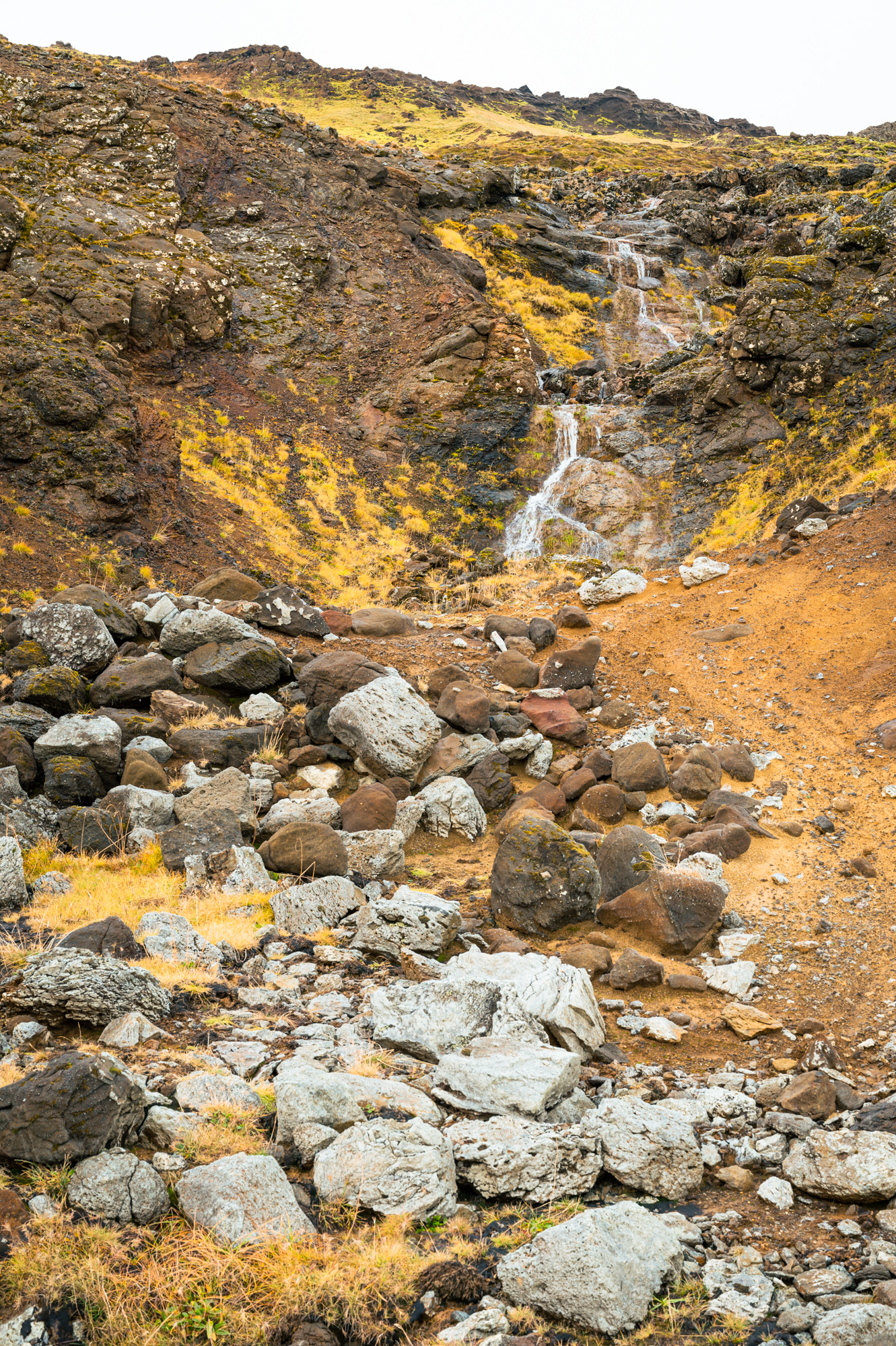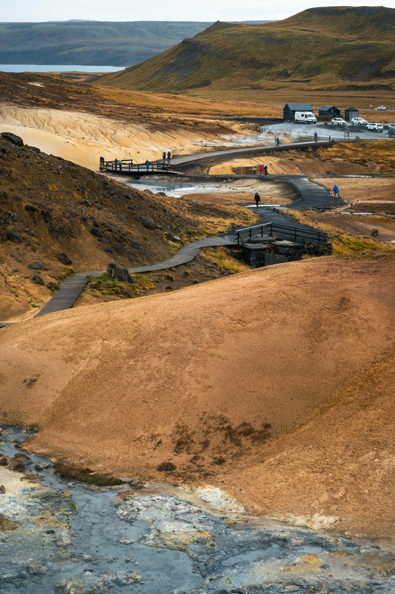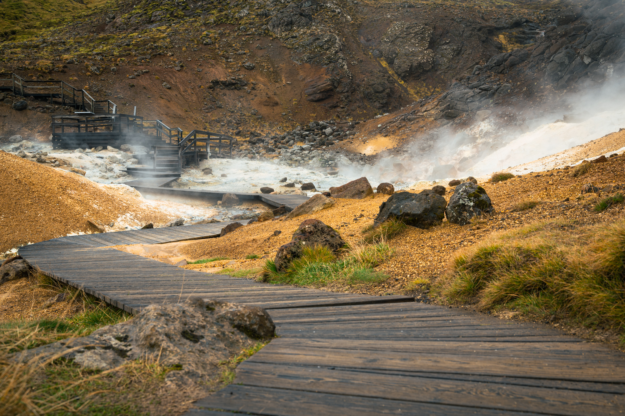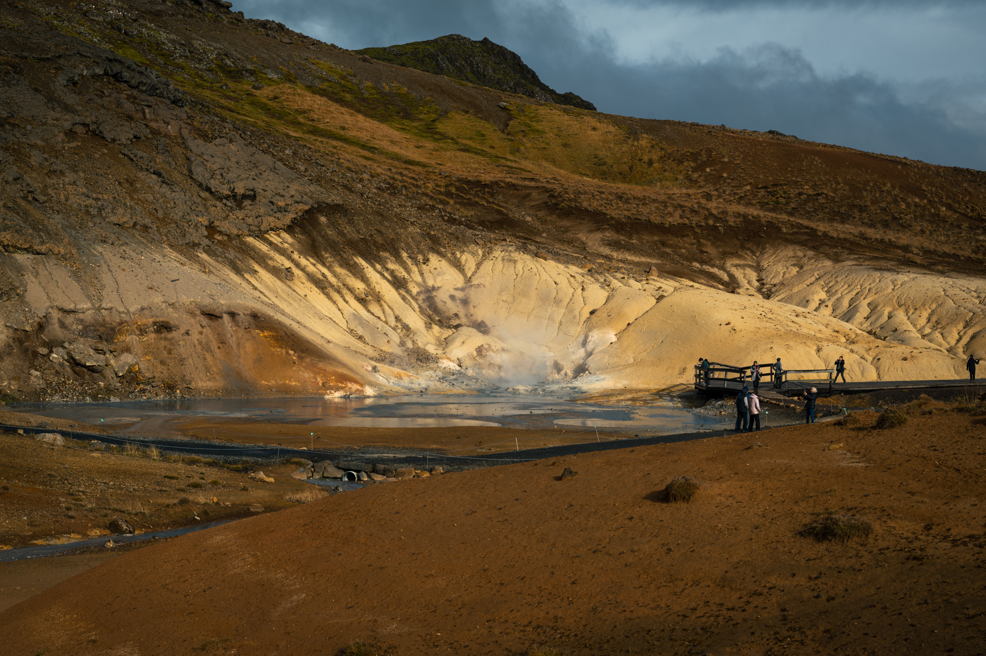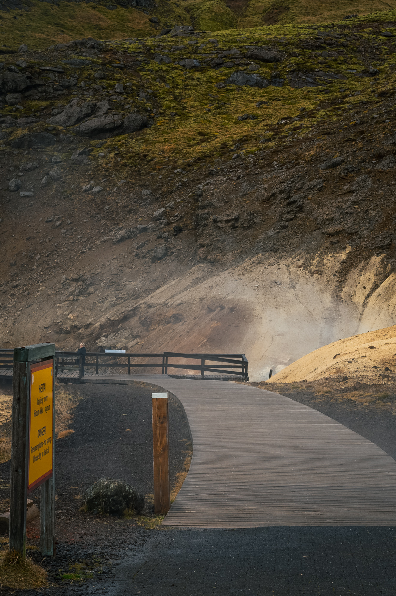 Vom Parkplatz aus trete ich auf die hölzernen Stelen. Ein Schild warnt vor den Gefahren: "Alles heiß, bitte Weg nicht verlassen". Der erste Eindruck ist bombastisch. Man ist gehüllt in einen warmen Schwefeldampf. Nichts davon fühlt sich unangenehm an. Im Gegenteil. Leicht durchgefroren vom sitzenden Fahren freue ich mich über die warmen Eindrücke. Das den Berg hinabfließende Wasser brodelt. Der Boden wirft Blasen. Es blubbert und sprudelt überall! Unwirklich, wenn man aus Mitteleuropa kommt. Als hätte man die Erde aufgerissen. Unweigerlich fragt man sich, wo die Wärme herkommt. Wahrscheinlich erst recht, wenn hier überall Schnee liegt. Schritt für Schritt auf den hölzernen Stelen kommt mir eine Erinnerung nach der anderen: Vom Anflug, dem ersten Eindruck der Insel, den dampfenden Stellen im schroffen Boden. Das hier ist eine davon. Und andererseits das viele Gletschereis, das ich aus dem Flugzeugfenster gesehen habe. Anders als alles andere, was ich kenne, fühlt sich dieses Land unfertig an. Wechselhaft und launisch. Wie ein Teenager, der sich zu finden versucht. Ein Land in seiner Pubertät: Auf nichts ist Verlass und doch so viele schöne, kreative Einfälle. Island ist ein Land im stetigen Umbruch: Alles vulkanisch geprägt, geologisch gesehen absolut frisch und den Launen der Natur ausgesetzt.