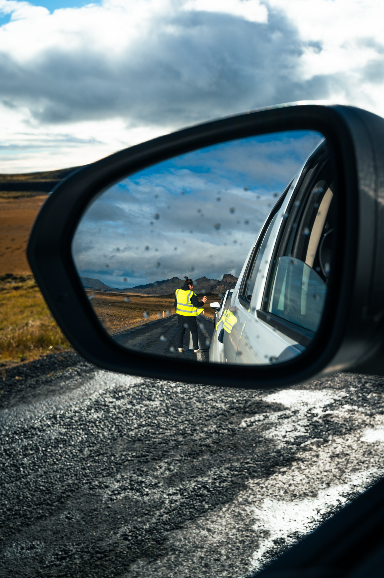 Auf den letzten Stelen, die mich zum Parkplatz führen, fällt mir wieder dieses ironische Einheitsweiß der parkenden Autos auf. Das absolute Kontrastprogramm zu den Eindrücken, die ich die letzten anderthalb Stunden habe aufsaugen dürfen. Gelangweilt steigt hier und da mal jemand aus oder ein. Als ich ausparke, läuft mir fast eine ins Handy vertiefte Person vor's Auto. Das erste Mal seit fast einer Woche und vielen hundert Kilometern, dass ich hupe. Sie läuft unbeeindruckt weiter, hat die Situation wahrscheinlich gar nicht mitbekommen. Die Restreichweite fällt unter 100 Kilometer. Ich werde wieder nervös. Kurz vor der Industriebrache steht ein Mann mit knallgelber Warnweste direkt auf der Straße und bremst mich aus. Filmdreh. In zwei Minuten geht's weiter. Es werden fast 20. Wir kommen ins Gespräch. Ich frage ihn, wie er als Isländer die Landschaft wahrnimmt. "Normal", sagt er. "Für uns ist eher die europäische Großstadt beeindruckend". Nach einem Tankstopp in Grindavík und deutlicher Erleichterung passiere ich bald die Blaue Lagune, fahre dann auf den Ankunftsparkplatz am Flughafen. Ein Teammitglied nach dem anderen kommt aus der Schleuse, nur noch wenige Augenblicke und das "Heimförin" hat ein Ende. Als Teresa aus der Schleuse kommt, schlage ich vor, einen kurzen Zwischenstopp auf dem Weg nach Reykjavík einzulegen: "Heiße Quellen", sage ich. "Könnte sich lohnen". Voll besetzt fährt sich der Dacia ganz anders. Mit Gesellschaft reist es sich schöner.
