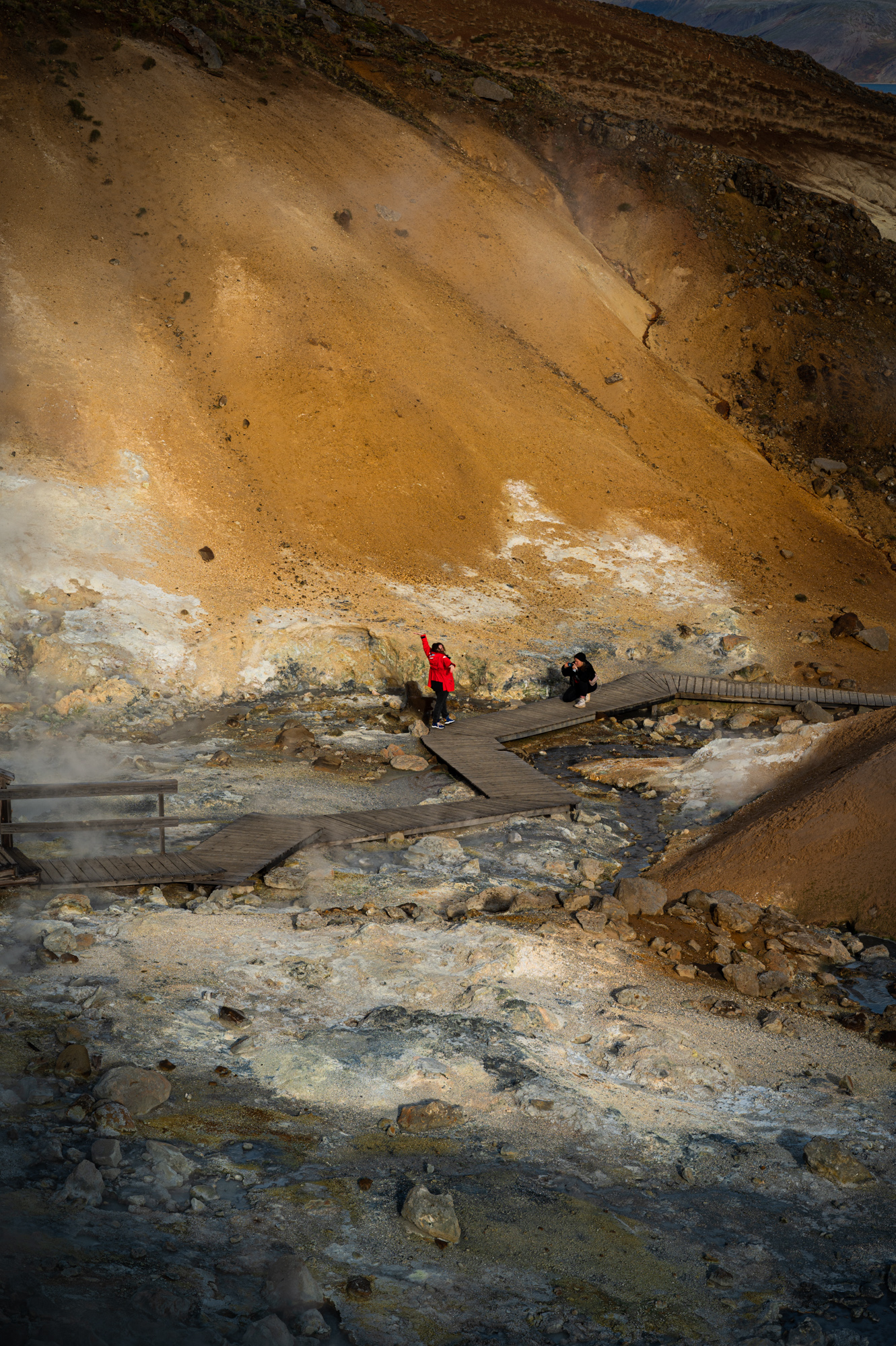 Seltún lasse ich diesmal rechts liegen. Es sind nur noch wenige weiße Autos auf dem Parkplatz, der Schwefelgeruch hingegen ist derselbe wie zuvor. Ein Mann mit Warnweste bremst mich aus, ich kenne das Spiel. "Zwei Minuten", sagt er, "Filmarbeiten". "Zwanzig waren's beim letzten Mal", entgegne ich. "Warum fährst du hin- und her?", ist seine Gegenfrage. "Schau dich um", fordere ich auf. Wir schweigen. Es beginnt die goldene Stunde und ich stelle die Playlist lauter. Er bleibt die nächsten zehn Minuten in der Nähe des offenen Fensters stehen.