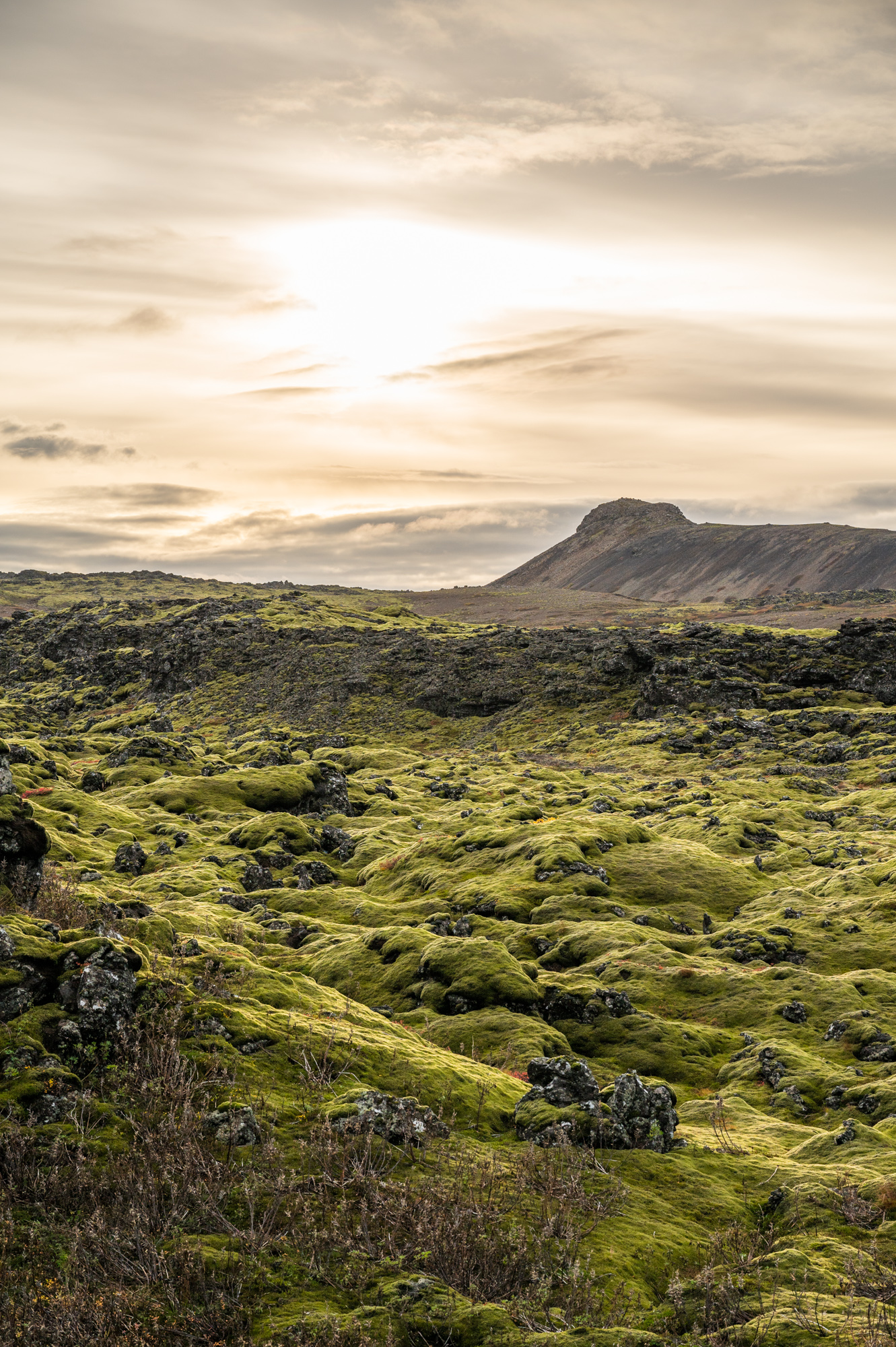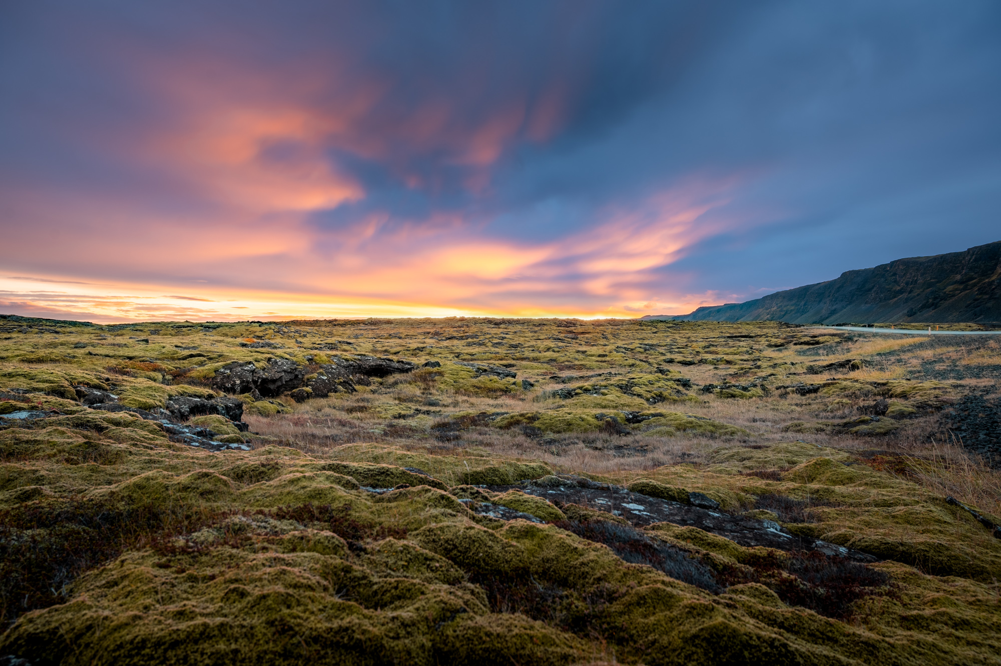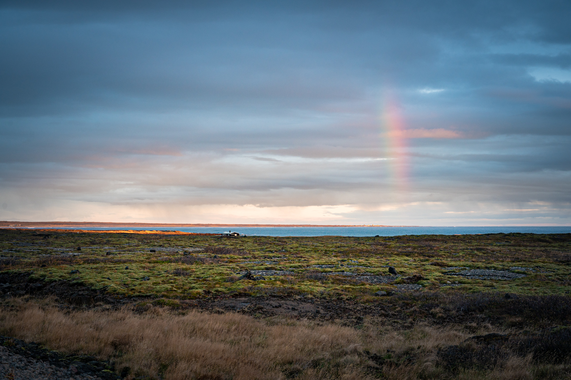Im flachen Winkel strahlt die goldgelbe Sonne über den Südküstenstreifen hinweg. Der lange Schatten des Dacias fährt mir unaufhaltsam voraus, seit ich auf die 427 ostwärts in Richtung Þorlákshöfn gebogen bin. Die GoPro habe ich natürlich immer noch nicht auf die Motorhaube gepömpelt, möchte keine Zeit verlieren. Aber was heißt hier schon "Zeit verlieren", eigentlich suche ich nur nach einem geeigneten Ort für den nächsten Halt, möchte dafür ein ganzes Stück vorwärts kommen. Der lange Schatten des Dacias ist mittlerweile von den langen Schatten der hinter mir liegenden Berge verschluckt worden. Im Rückspiegel sehe ich, wie sich die blaugraue Wolkendecke breitflächig in ein feuriges Orange verwandelt. Schrägrechts vor mir strahlt der Küstenverlauf am Horizont. Ganz da hinten ist Strandakirkja als weiße Landmarke zu erkennen. Überall lösen sich kleine Regenschauer aus der Wolkendecke. Davor erscheint sanft ein Regenbogen, links von mir spielt der markante Bergrücken sein Licht- und Schattenspiel. Vielleicht ist das ja auch der Ort, nach dem ich suche. Ich lenke den Dacia auf den abschüssigen Seitenstreifen. Auf dem Geröll kommt er schnell zum Stehen. Zur Sicherheit werfe ich die Warnblinker an. Mit Verlassen des Autos versinke ich in der gewaltigen isländischen Traumlandschaft und stapfe vorsichtig über die moosfreien Stellen des Lavafeldes. Das feurige Orange der von unten beleuchteten Wolkendecke löst sich langsam in ein sanftes, fleckiges Rosa auf.