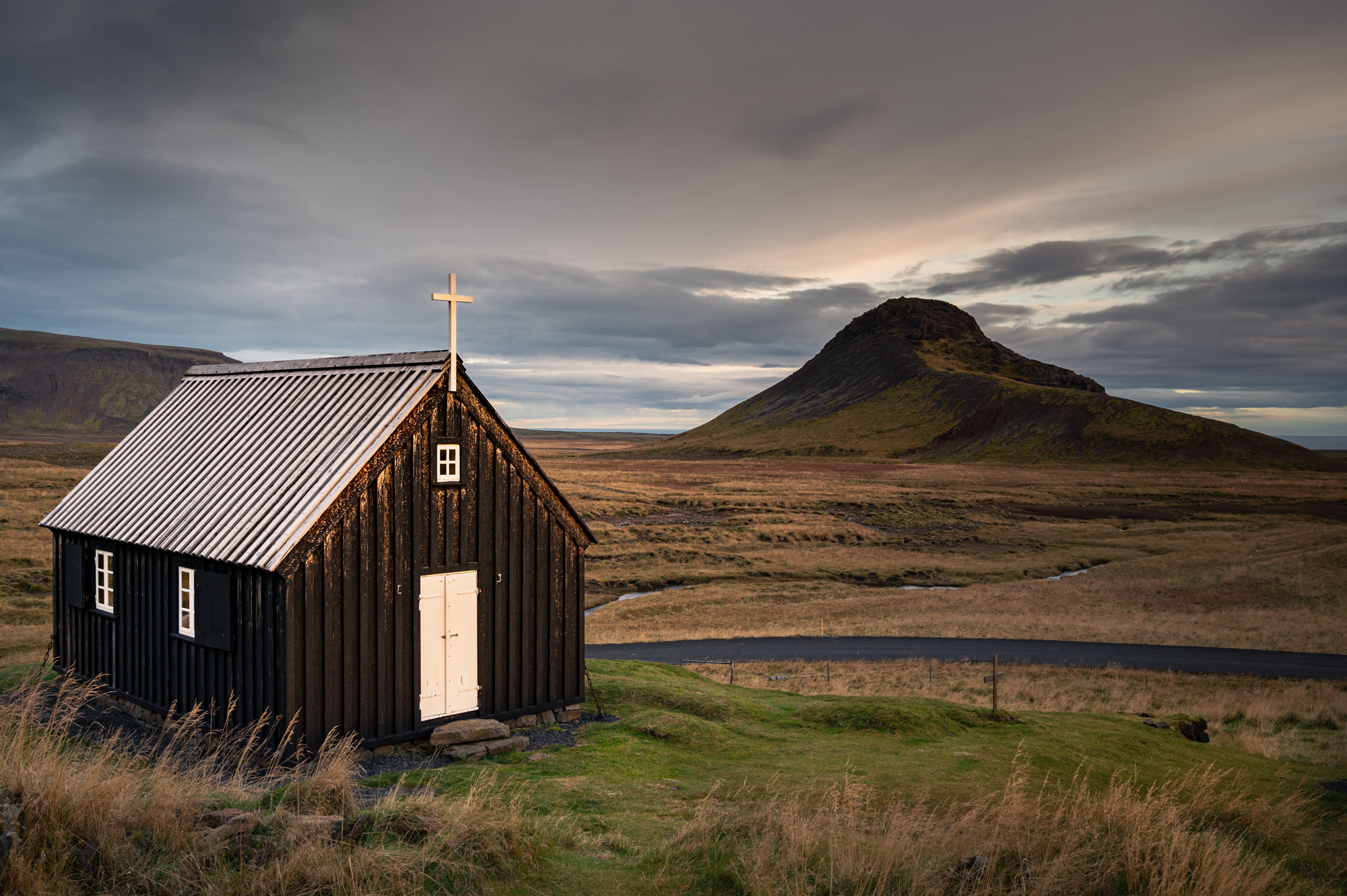 Freundlich nicken wir uns zu, als er wieder die Freigabe bekommt. Diesmal zieht mich das nächste Straßenschild in Richtung Krýsuvíkurkirkja wie ein Magnet an. Bei den letzten Begegnungen auch schon, aber da bot sich die Gelegenheit nicht. Eine erstaunlich gut befestigte Straße führt ins Hinterland. Einige hundert Meter weiter ein Parkplatz. Ich fühle mich direkt an den ersten Abend in Strandakirkja zurückversetzt. Krýsuvíkurkirkja erscheint mir wie ein inszenierter Antagonist zu Strandakirkja. Diese Kirche ganz in Schwarz, trägt den Namen der Feuerlandschaft und ist unbekannt; jene fast komplett in Weiß, thematisch der Küste zugeordnet und ein Touristenmagnet. Feuer ist übrigens das Stichwort: Krýsuvíkurkirkja steht hier erst seit zwei Jahren. Sie wurde über zehn Jahre von Schreinerlehrlingen mühsam und originalgetreu rekonstruiert und anschließend per LKW am Stück hertransportiert. 2010 brannte sie nämlich bis auf einen kleinen Haufen Asche ab, hatte zeit ihrer seit 1857 andauernden Geschichte noch ein rotes Dach. Tatsächlich ganz in Ruhe verbummele ich eine halbe Stunde und ziehe erst weiter, als eine kleine Reisegruppe den Ort überrollt wie eine Herde Islandpferde. Ehe ich mein Zeug im Auto verstaut habe, springt nebenan auch schon wieder der Motor ihres Kleinbusses an.
