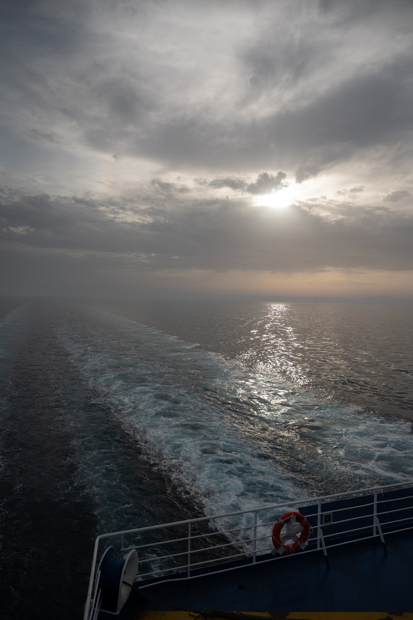 Der "Pilote", also der Lotse, wird in einem genauso flinken Manöver an Bord gebracht, wie das auch gestern schon in Genua der Fall war. Das Lotsenboot steuert bereits auf die nachfolgende Fähre zu. Die liegt einige Seemeilen hinter uns und fährt genau durch unsere sich bräunlich vom Hintergrund abhebende Abgasspur durch. Fähre fahren ist eigentlich eine ziemlich dreckige Angelegenheit. Das haben wir gestern sehr deutlich gesehen. Und die 200 kg CO2, die wir allein aufgrund der Nachtzugfahrt gegenüber dem PKW eingespart haben, sollten hier mit ziemlicher Sicherheit wieder kompensiert sein. Und wenn nicht dass, dann ist mindestens unsere Feinstaubbilanz hinüber.