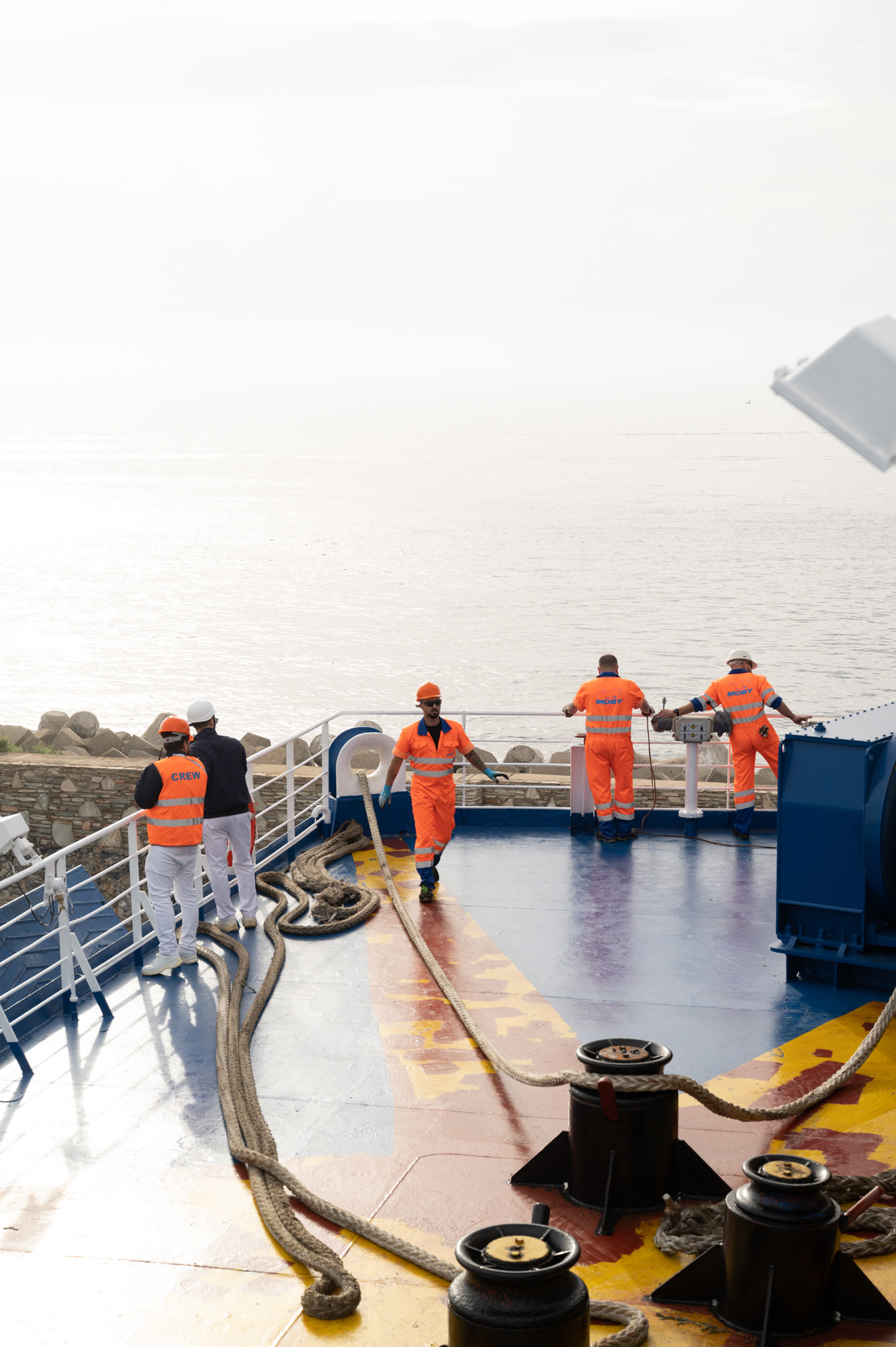 Mit jeder Seemeile bekommt die Sonne spürbar mehr Durchsetzungskraft gegen die Wolken und den Nebel. Immer mehr der grünen, zerklüfteten Landschaft Korsikas wird sichtbar. Man sieht Siedlungen. Das Grün beginnt sich langsam von den ockerbraunen Felsen abzusetzen. Und langsam kommt auch Bewegung ins Spiel der Besatzung. In schicker Uniform gekleidete Crewmitglieder haben es sich schon seit einiger Zeit an Deck bequem gemacht, quatschen miteinander und rauchen Zigarette. Jetzt kommen die Arbeiter in Warnwesten und beginnen damit, die Schiffstaue zurechtzulegen.