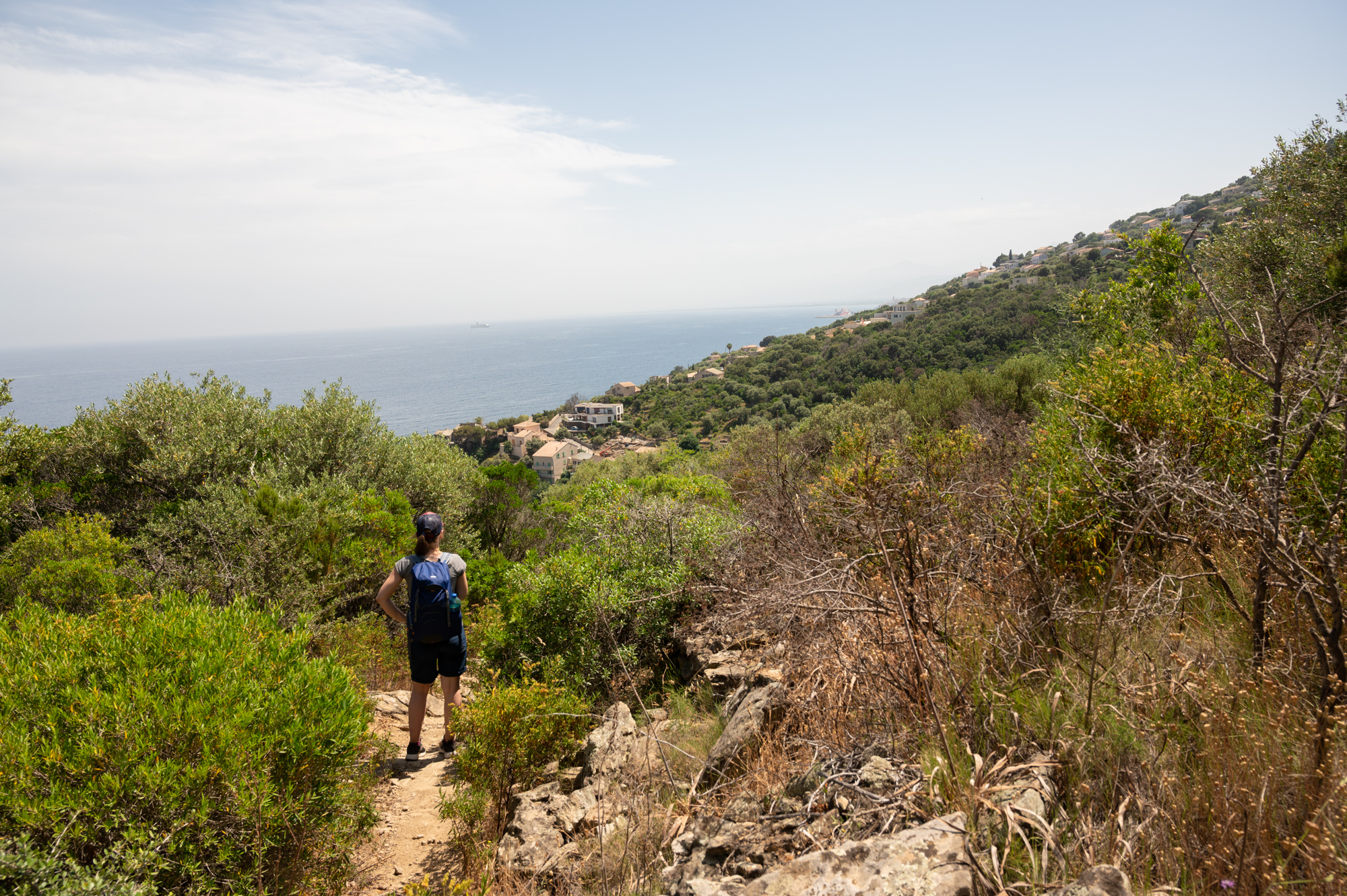Wir haben wieder Navigationsprobleme, als es weiter abwärts geht. Nichts passt mehr: Die eingezeichneten Wege sind nicht zu finden, die Wegführung ergibt keinen Sinn. Teresa findet einen Schleichweg, der zu unserem Wanderpfad zurückführt. Der Weg zieht sich in die Länge. Erst durch Wald, dann durch die Macchia. Eine dichte Gestrüpplandschaft, in der auch viele Kräuter beheimatet sind. Der warme Wind aus dem Tal bläst uns den Geruch von mildem Kräutertee in die Nase.