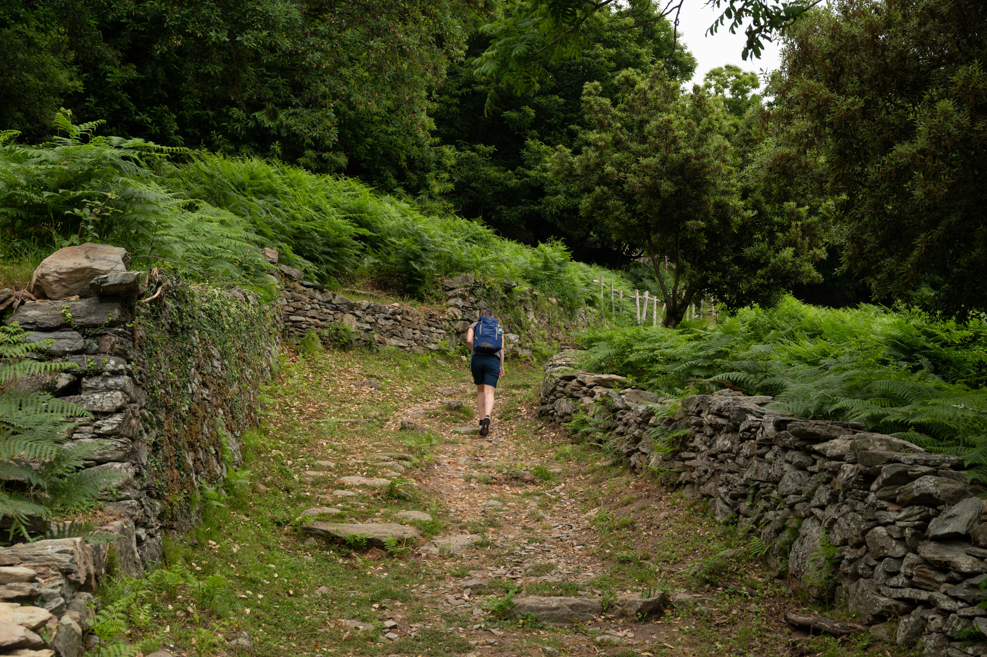 Wir verlassen Pietrabugno. Nun beginnt der Offroad-Teil: Quer durch den Wald einen Wanderweg entlang. Er beginnt als mit Mauern begrenzter steingepflasterter Weg. Hier begegnen wir unserem Speedy Gonzalez. Er scheint schon auf dem Rückweg zu sein und wir führen ein kurzes nettes Gespräch. Das nur mit Schulfranzösisch. Schon allein dafür hat es sich ausgezahlt. Er gibt uns ein paar Tipps, fragt wo wir hin möchten und lässt von sich erzählen: Dass er täglich 10-15 Kilometer zurücklege.
