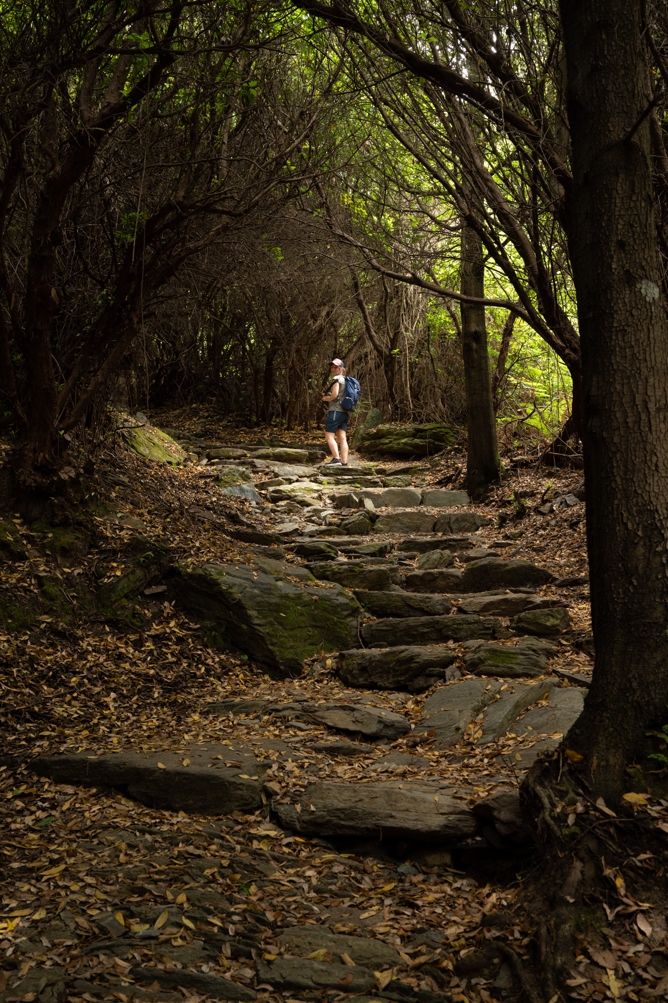 Es beginnt ein verwunschener Wald. Der Weg ist wie aus einem Märchen. Er beginnt an einer alten Quelle, die in einer kleinen Höhle im Hang liegt. Darin ist eine Krippe mit Spielzeugfiguren. Als es steiler wird und die Pausen häufiger, ähnelt der Wanderweg eher einem (wortwörtlich!) Tunnel aus Gestrüpp. Am Ende eine Lichtung mit einem kleinen Steinhäuschen und einem vor sich herrottendem Pickup. Wir sind am höchsten Punkt unserer Wanderung angekommen.