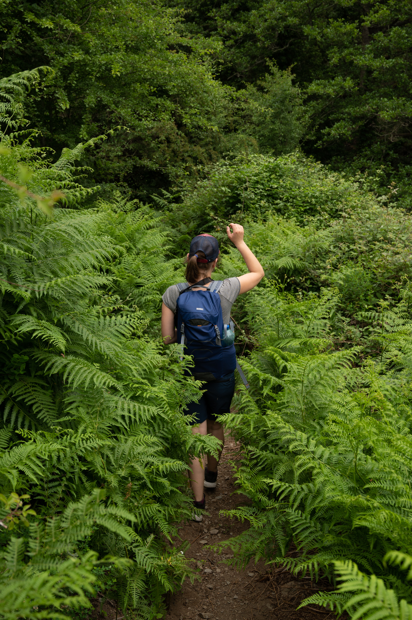 Abwärts dann haben wir Probleme auf dem geplanten Weg zu bleiben. Wir staksen durch Farngewächse, die höher sind als wir. Und überqueren kleine Bächlein. Letztlich verschaffen wir uns Zugang zu einem Gelände, das zu einem Wasserwerk gehören könnte. Die Straßen sind halb so schmal wie normale, aber trotzdem gibt es eine Mittellinie. Unbefugt scheinen wir hier nicht zu sein - zumindest der fehlenden Reaktion der Dame nach zu urteilen, die gerade eine Hecke schneidet.