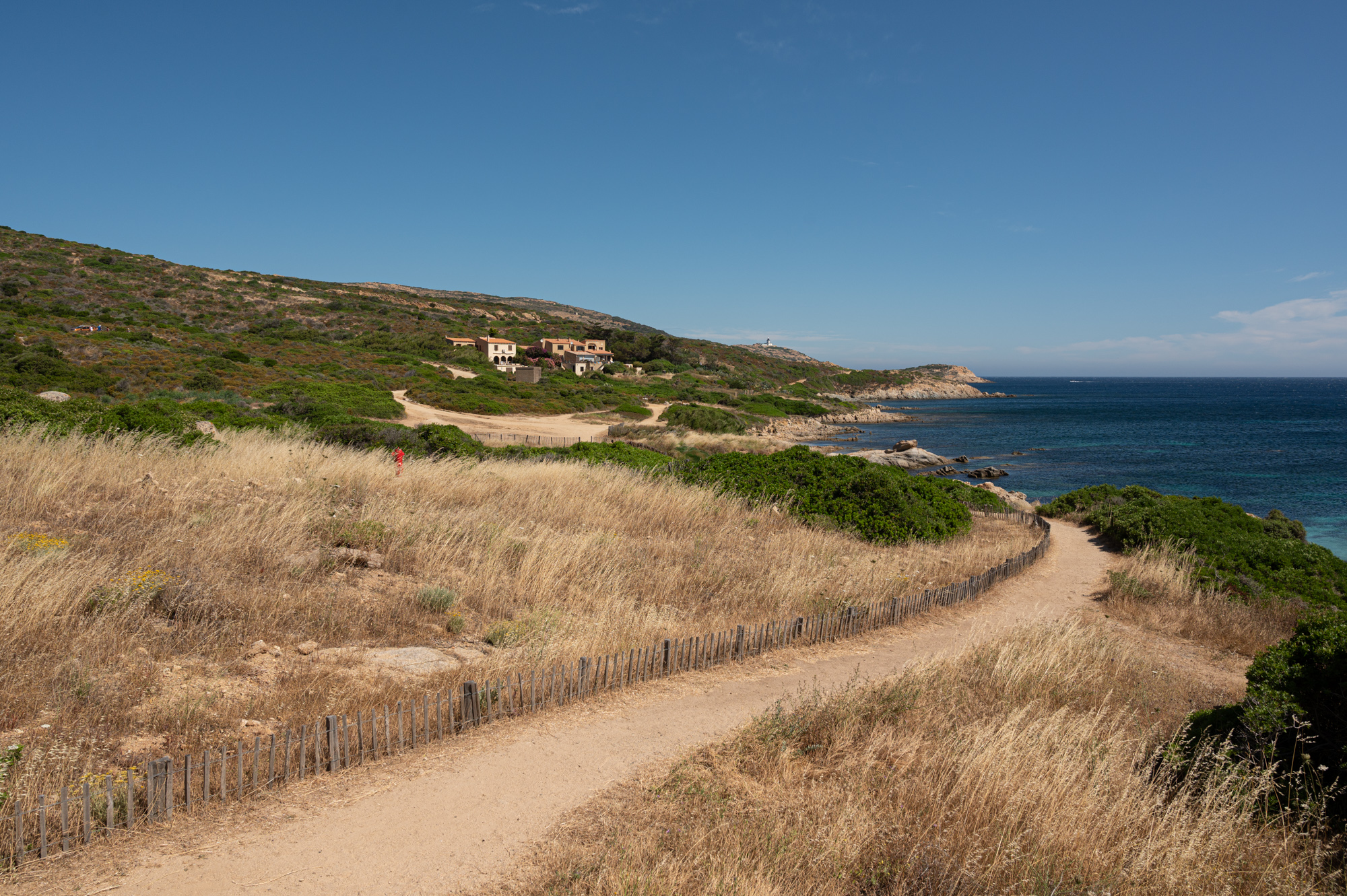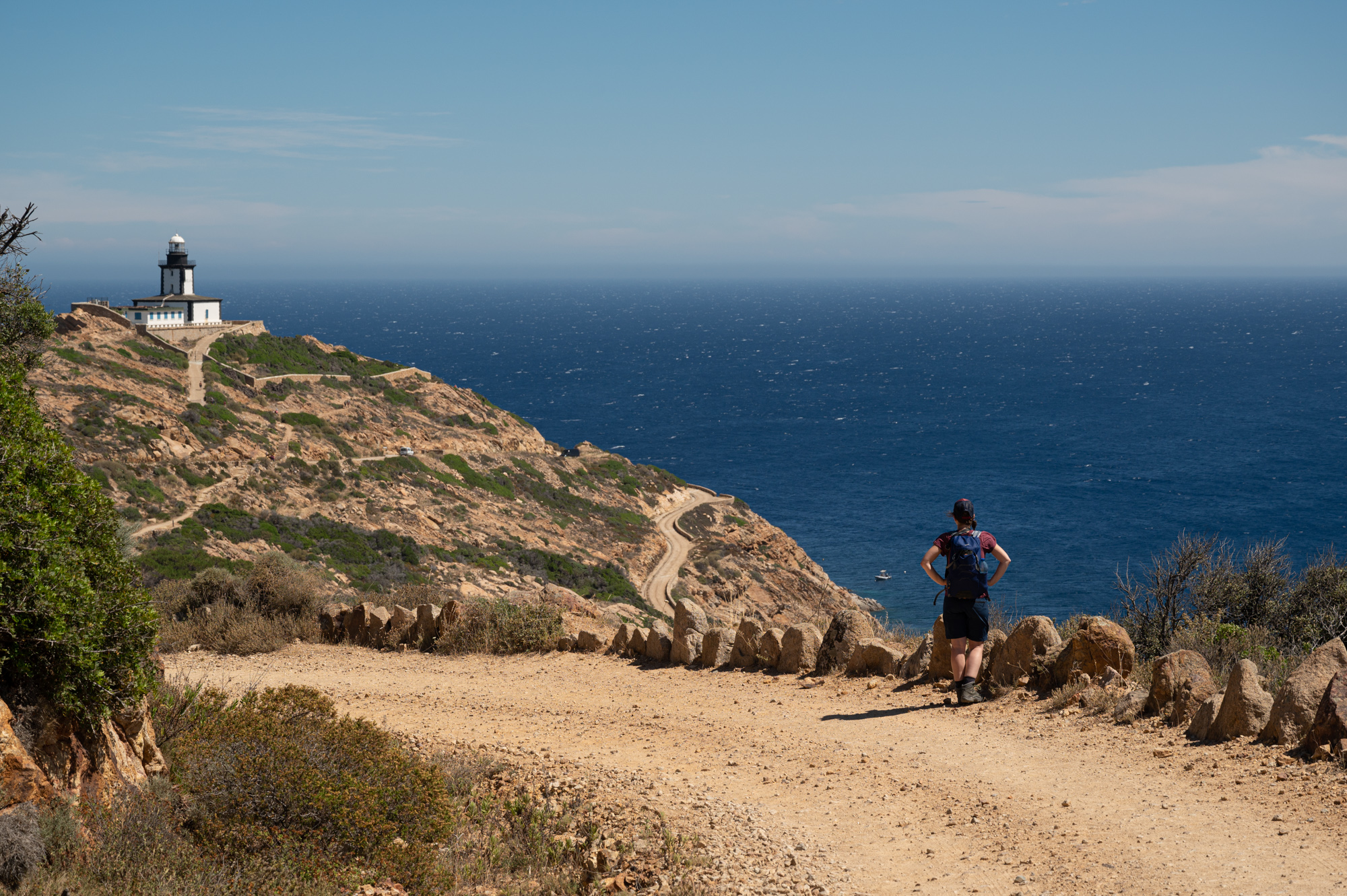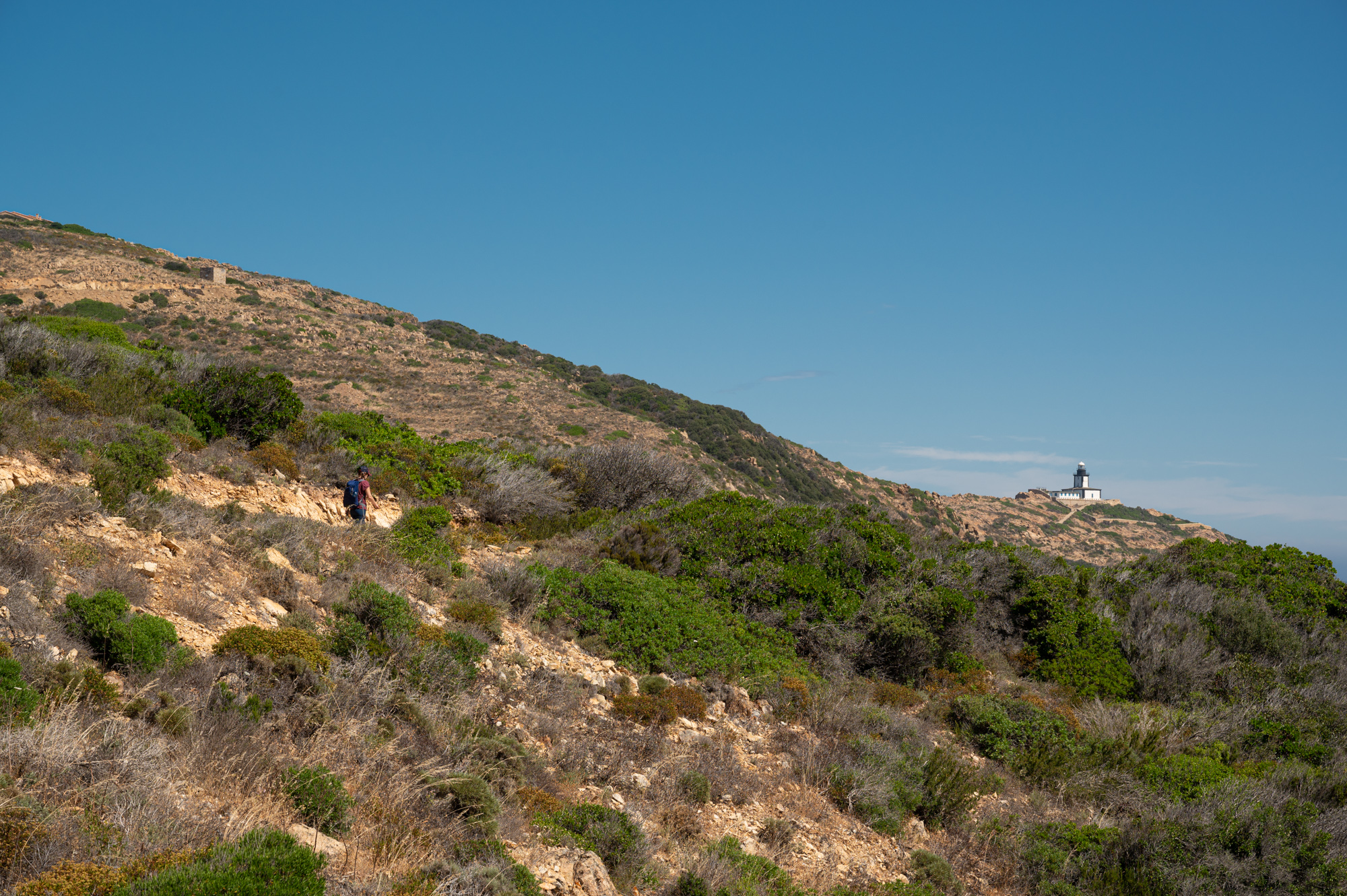 Es folgt ein mehrfaches Auf- und Ab. Auf die Abs kann man sich gar nicht freuen, weil natürlicherweise auch ein Auf folgen muss. Allgemein scheint es aber eine vorhersehbar mittelschwere Wanderung zu werden. Eher mittel als schwer, denn der Weg ist so halb befestigt, die Steigungen nie unangenehm steil. Der Leuchtturm wird hinter jeder Kurve ein Stückchen größer. Rechterhand am Wasser - mittlerweile wieder weit unter uns - sieht man die ozeanografische Forschungsstation. Ein braungebrannter Mittvierziger überholt uns im Laufschritt. Oberkörperfrei, kleiner Wasserrucksack auf dem Rücken. Der macht das nicht zum ersten Mal. Dementsprechend trainiert schaut sein Körper aus. Generell sind die Menschen auf Korsika im Schnitt deutlich sportlicher unterwegs, und zwar altersunabhängig. Das ist uns schon in Bastia aufgefallen, wird aber auch bei solchen Einzelbegegnungen deutlich. Während wir gemütlichen Schrittes ins Schnaufen geraten, laufen sie uns einfach davon.