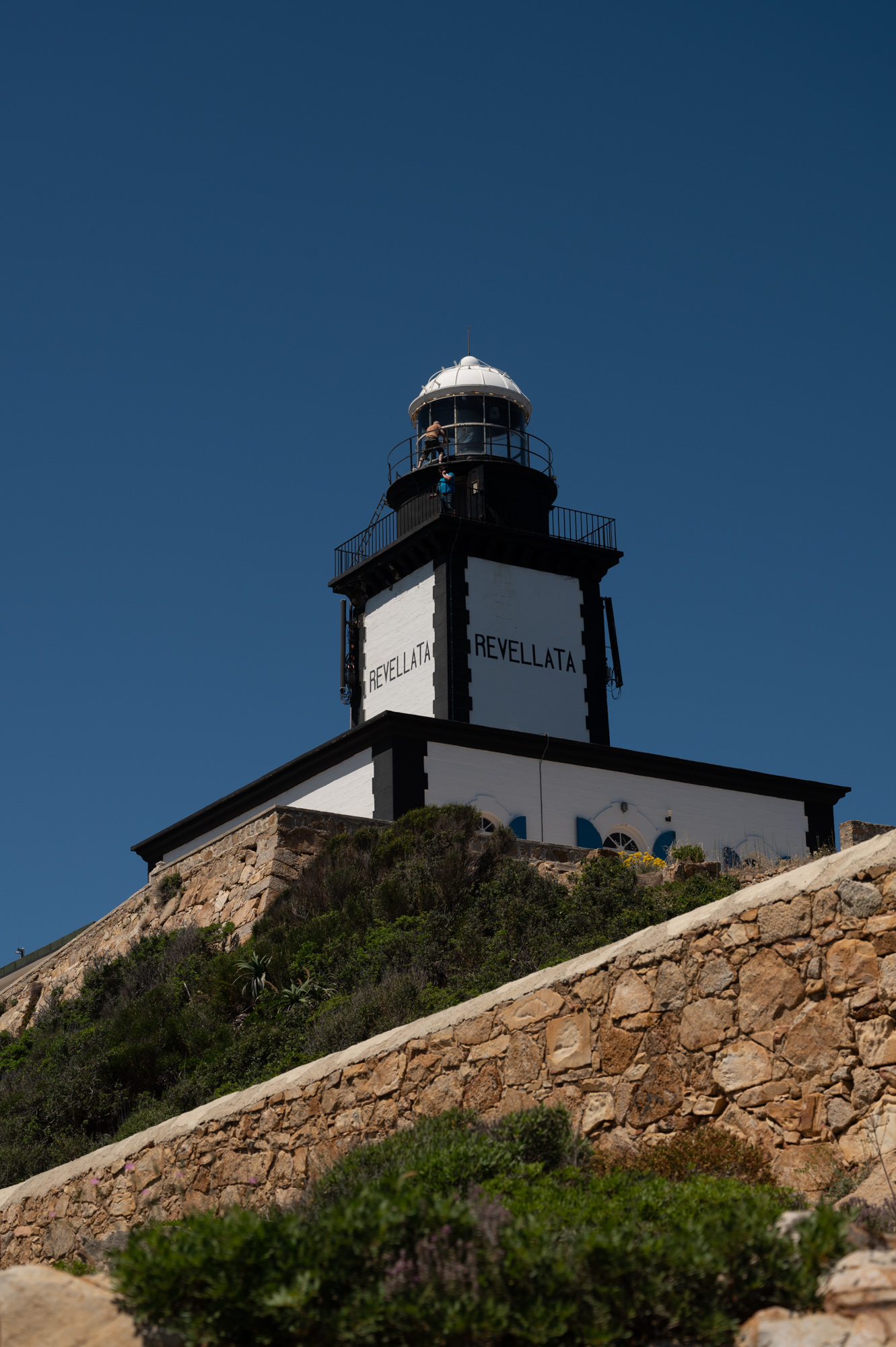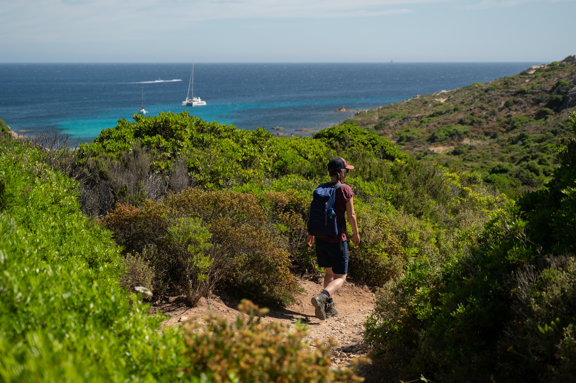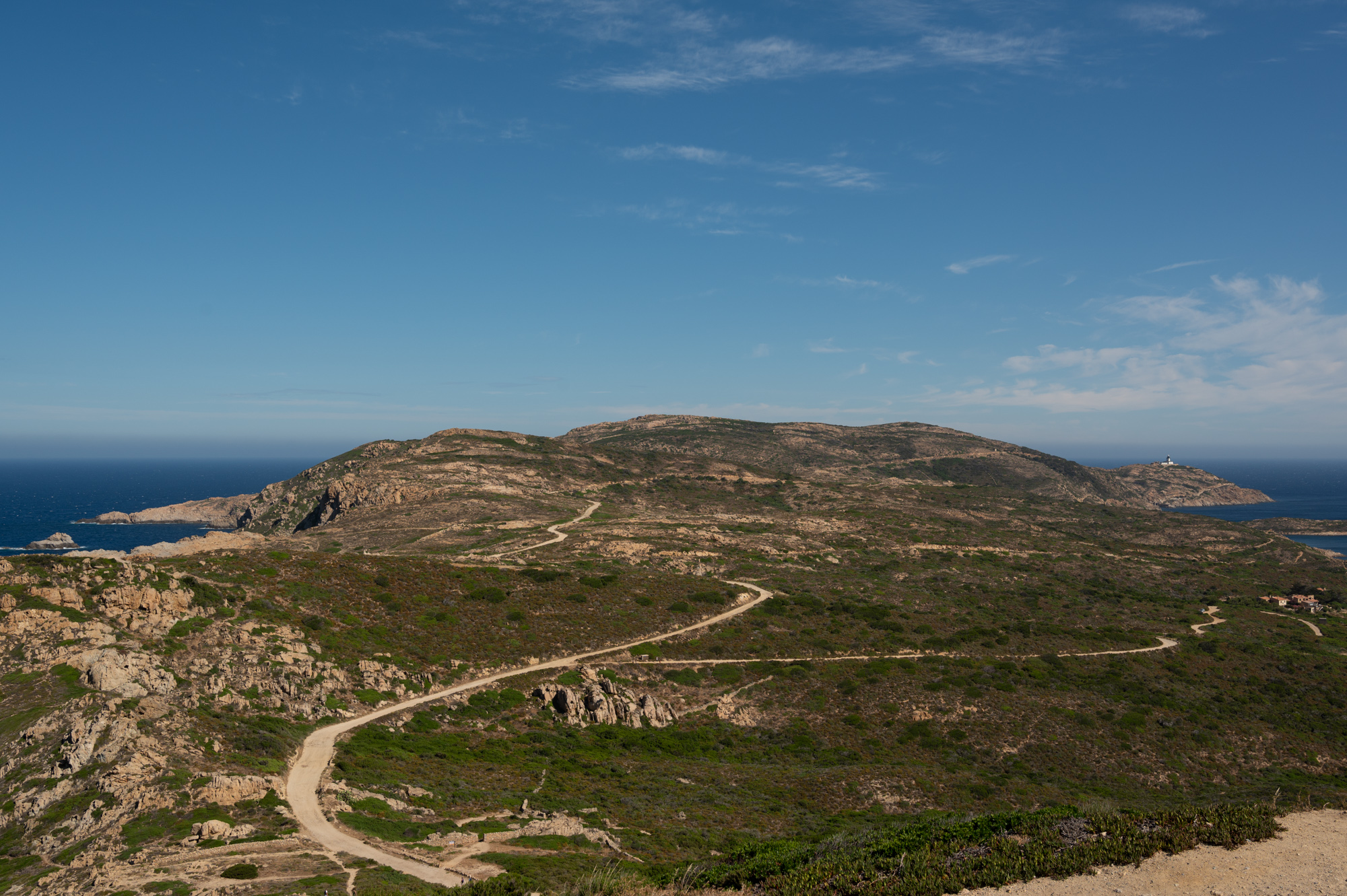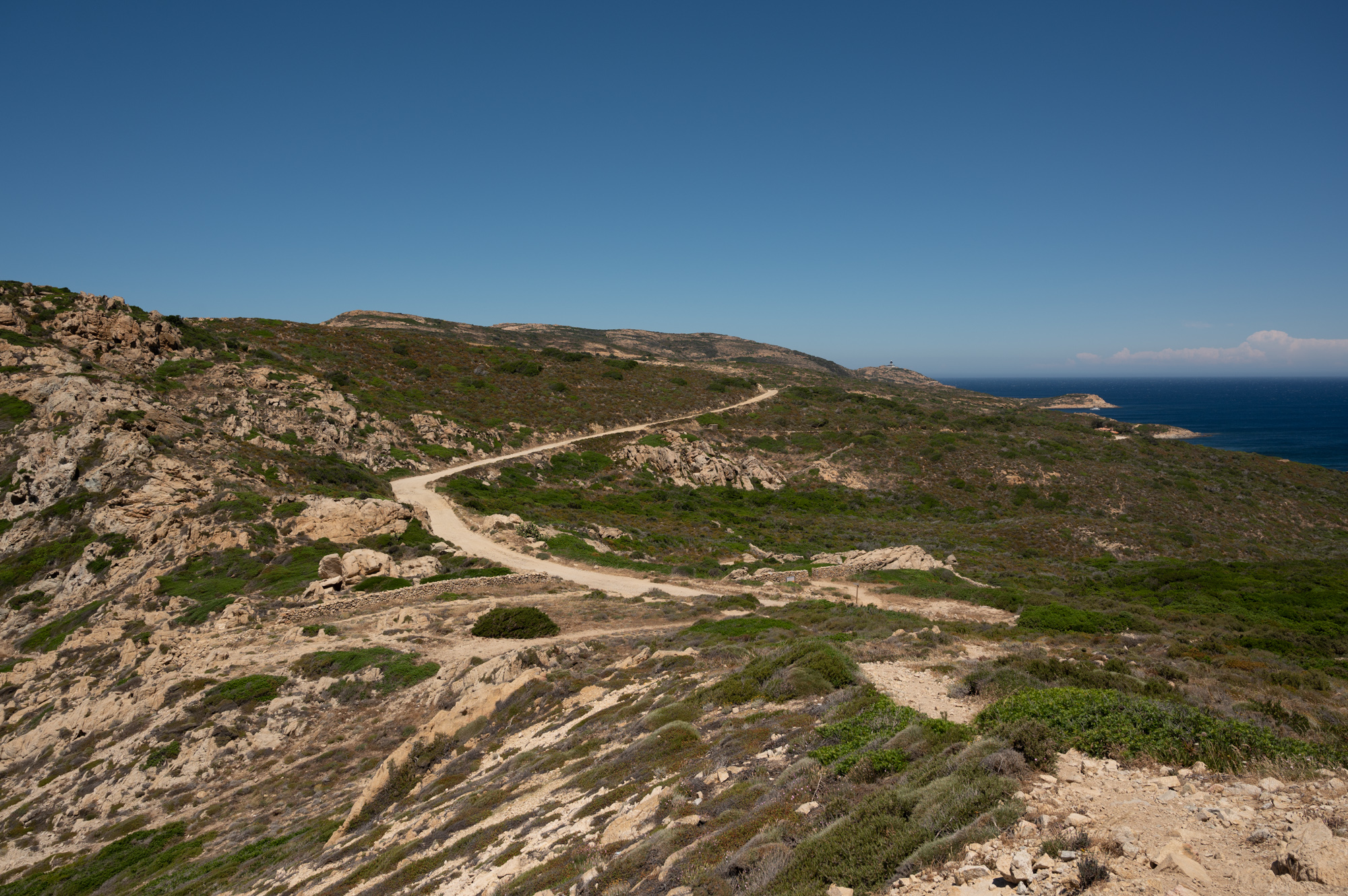 Es folgt ein mehrfaches Auf- und Ab. Auf die Abs kann man sich gar nicht freuen, weil natürlicherweise auch ein Auf folgen muss. Allgemein scheint es aber eine vorhersehbar mittelschwere Wanderung zu werden. Eher mittel als schwer, denn der Weg ist so halb befestigt, die Steigungen nie unangenehm steil. Der Leuchtturm wird hinter jeder Kurve ein Stückchen größer. Rechterhand am Wasser - mittlerweile wieder weit unter uns - sieht man die ozeanografische Forschungsstation. Ein braungebrannter Mittvierziger überholt uns im Laufschritt. Oberkörperfrei, kleiner Wasserrucksack auf dem Rücken. Der macht das nicht zum ersten Mal. Dementsprechend trainiert schaut sein Körper aus. Generell sind die Menschen auf Korsika im Schnitt deutlich sportlicher unterwegs, und zwar altersunabhängig. Das ist uns schon in Bastia aufgefallen, wird aber auch bei solchen Einzelbegegnungen deutlich. Während wir gemütlichen Schrittes ins Schnaufen geraten, laufen sie uns einfach davon.
